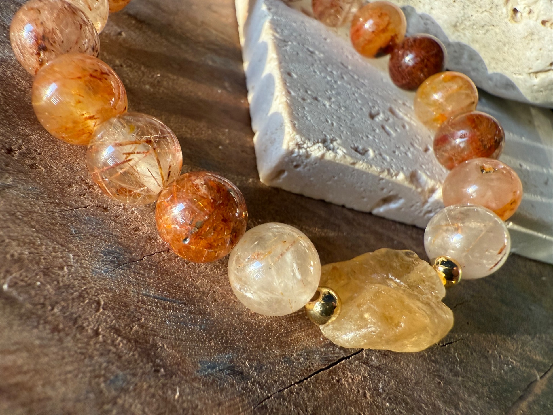Tento výnimočný náramok spája stabilizujúcu energiu achátovej drúzy, intenzívnu silu rutilového krištáľu v AA kvalite a surový citrín umiestnený v strede ako silný nositeľ životnej energie. Prekrásny, jedinečný kúsok, ktorý pôsobí liečivo, posilňujúco a transformačne zároveň.
