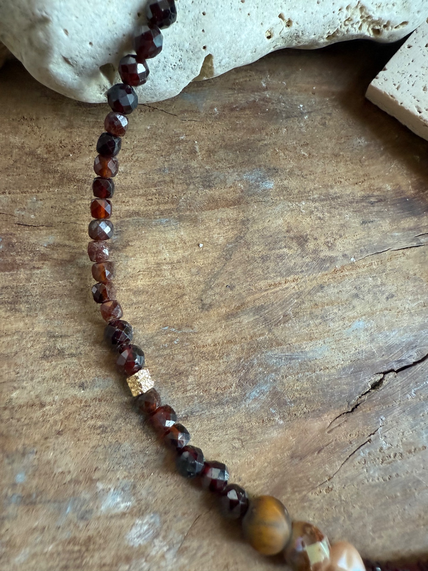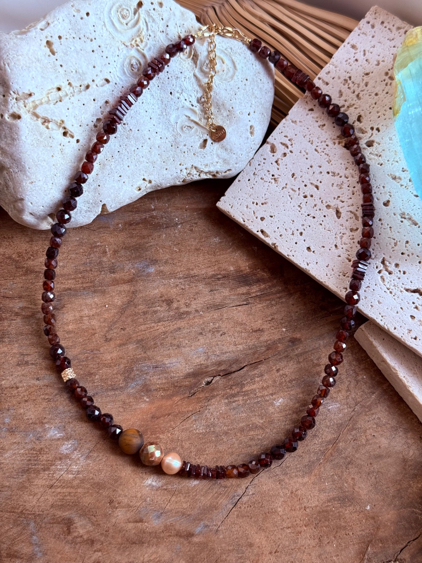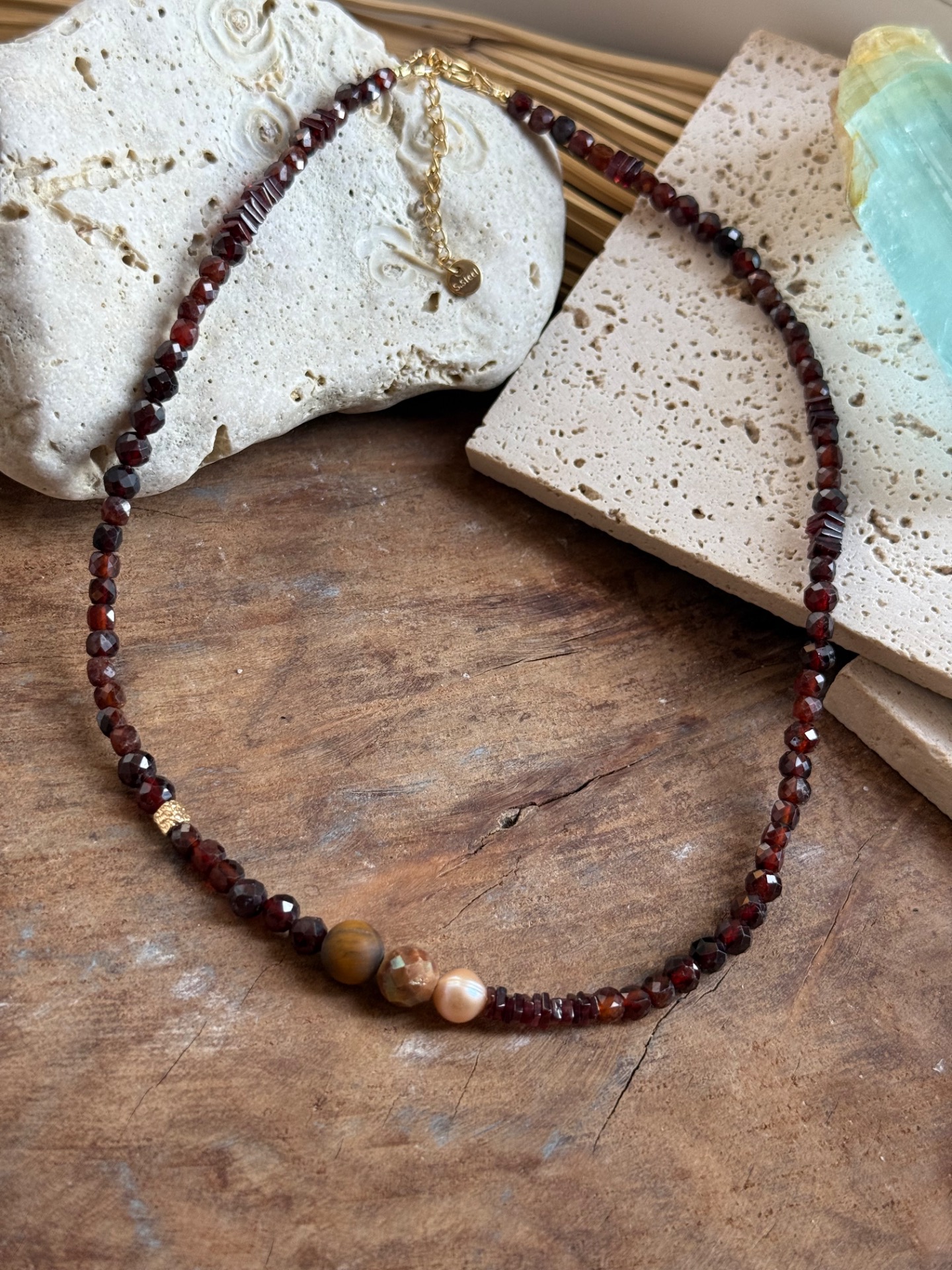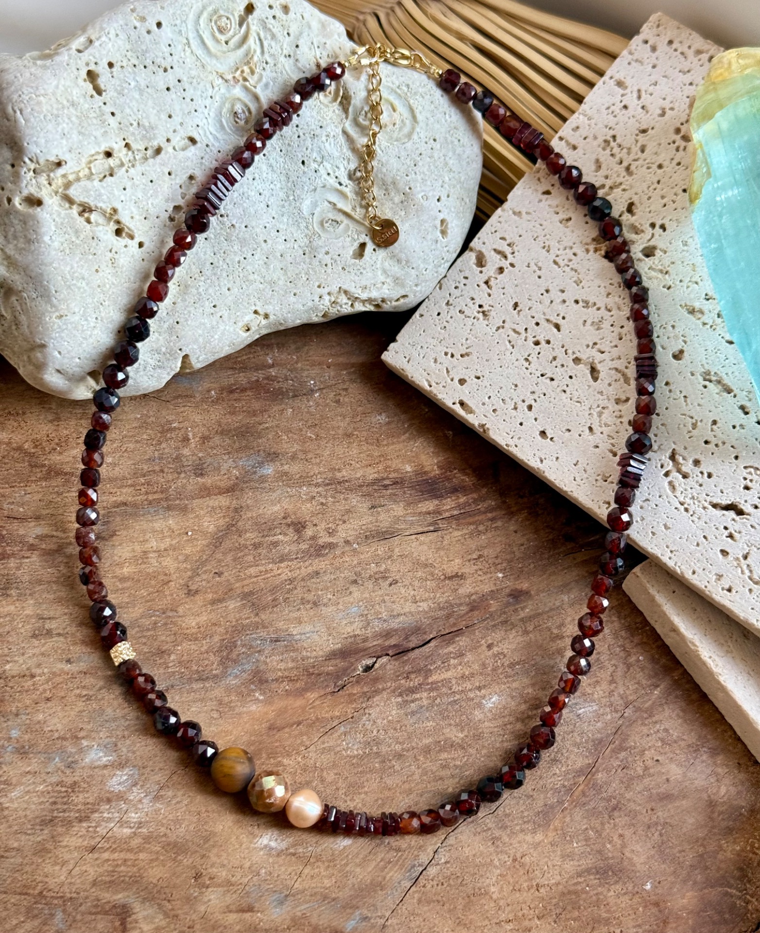 Plodnosť života – choker z indického granátu, tigrieho oka, achátu a marhuľovej perly