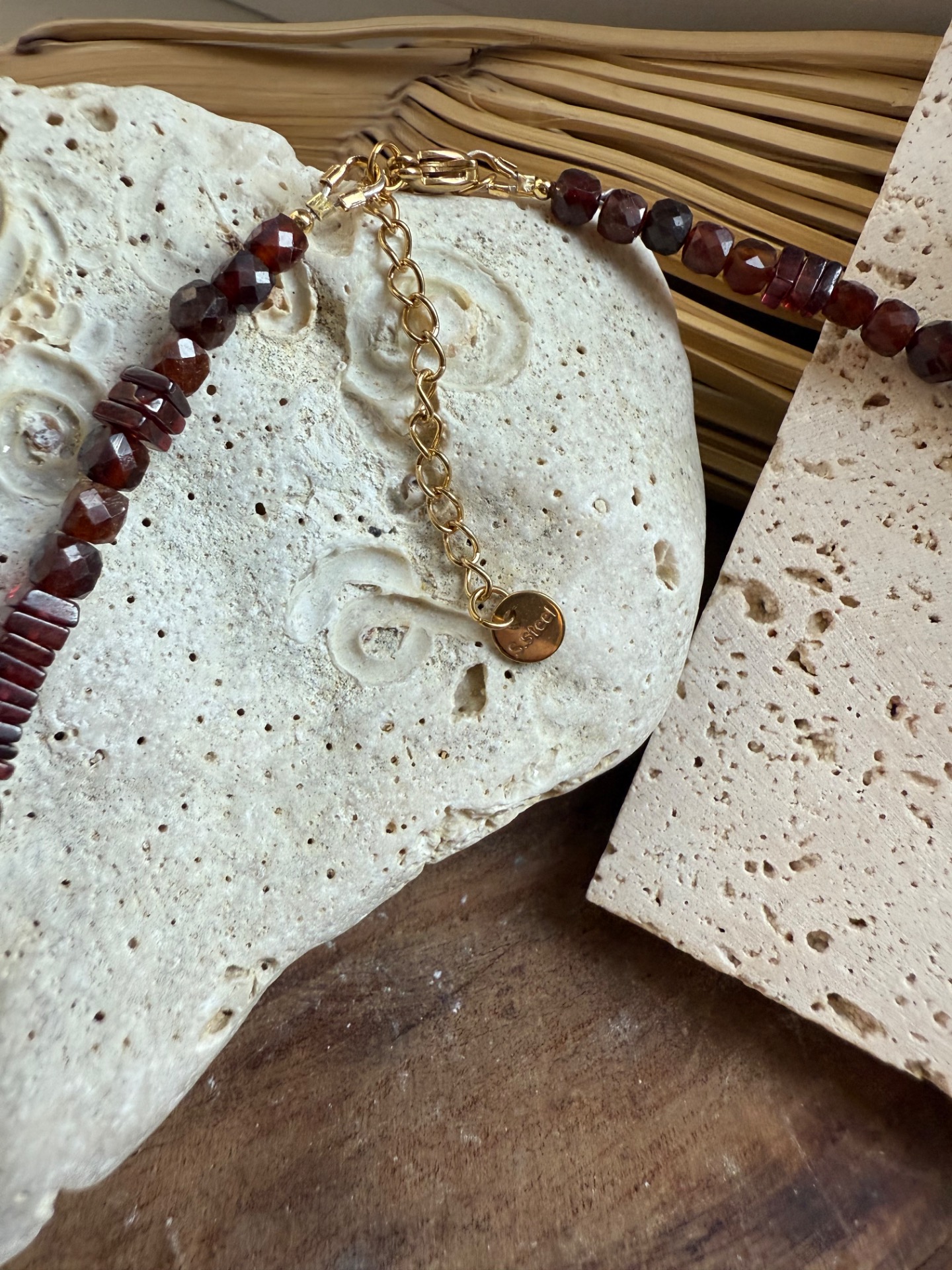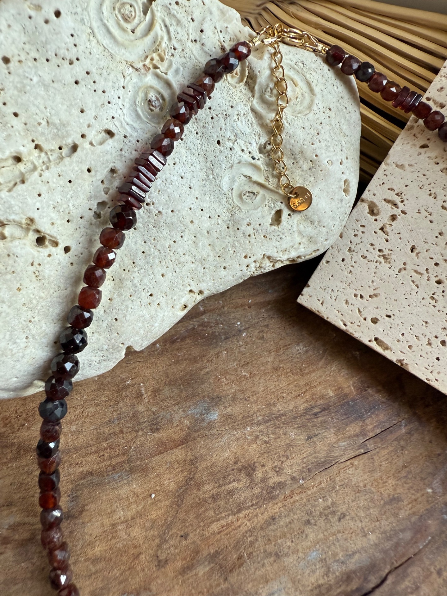 V srdci náhrdelníka pulzuje indický granát, kameň krvi, ohňa a plodnosti. Oživuje vnútorný oheň, prebúdza radosť z bytia a navracia spojenie so ženskou energiou – s telom, so zmyselnosťou, s cyklom života.
