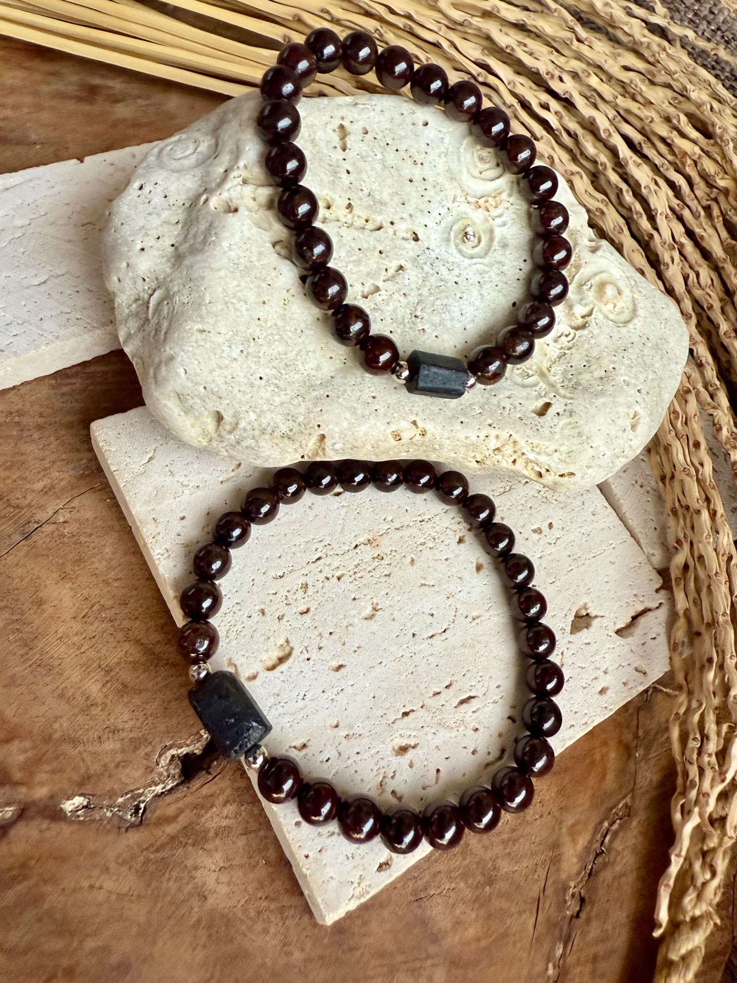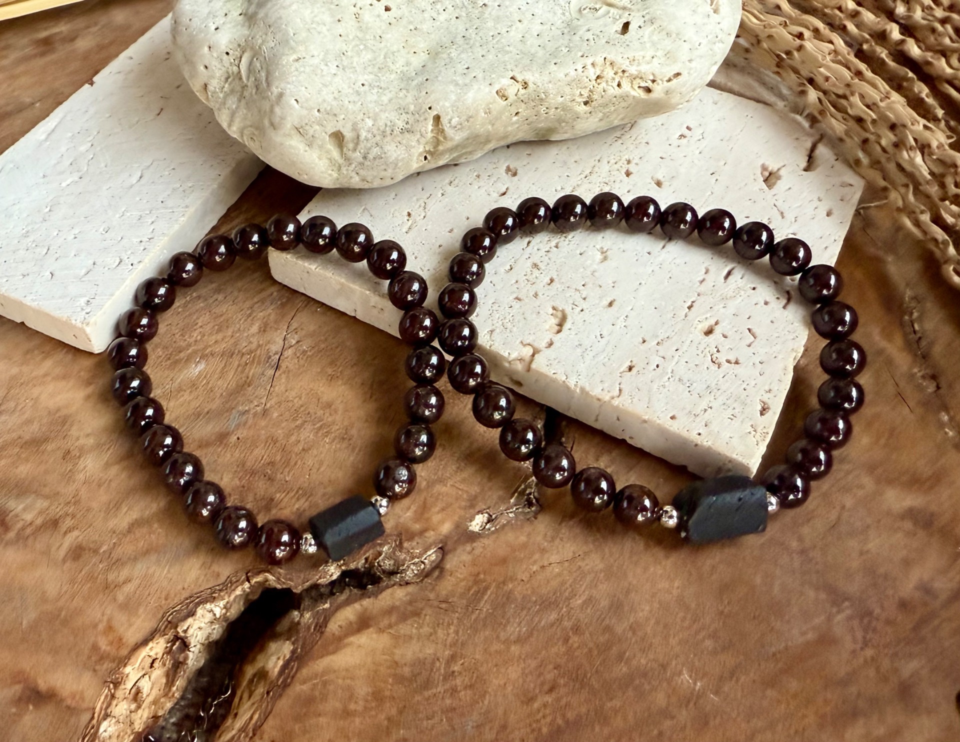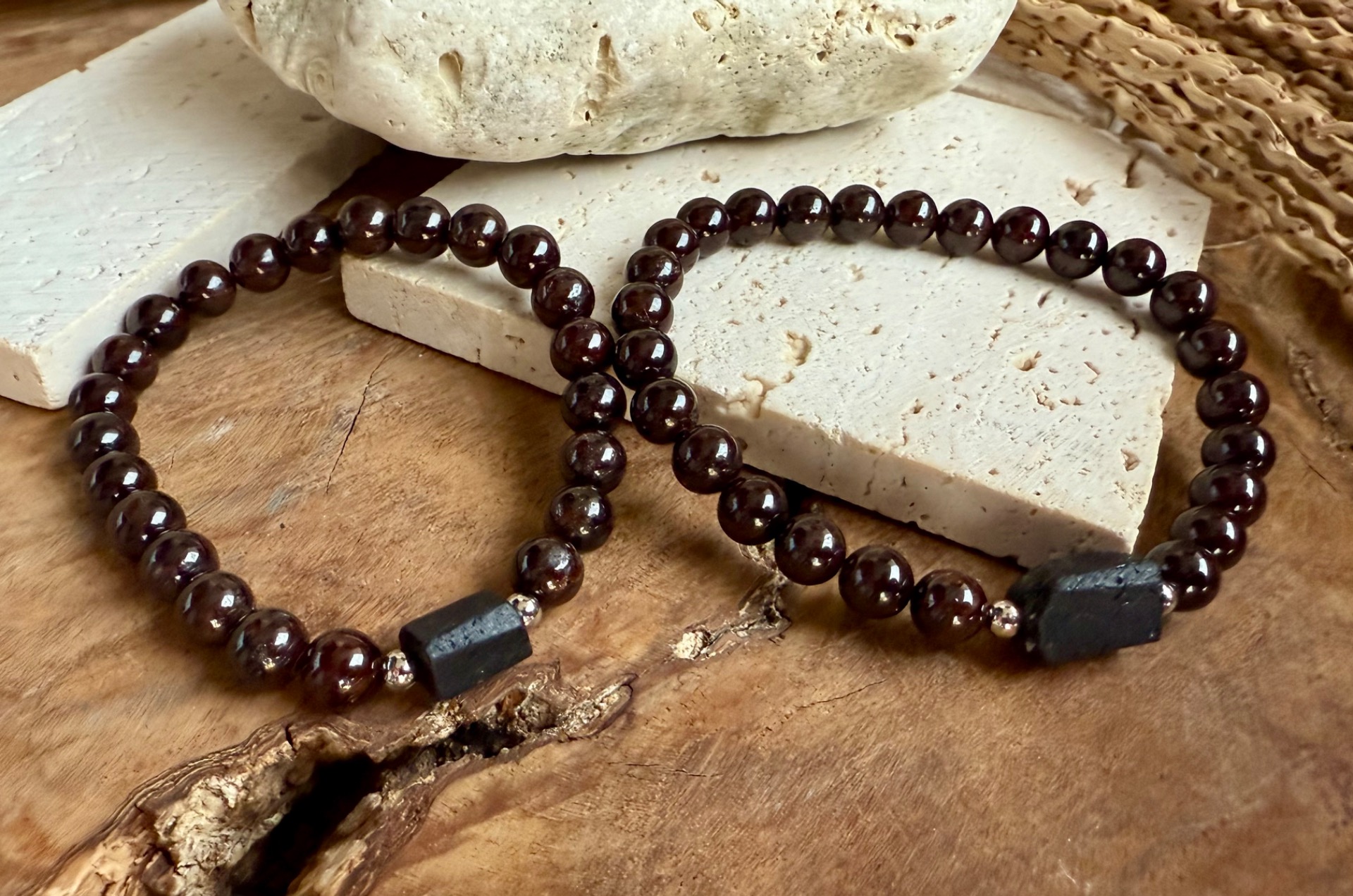 Tieto jedinečné partnerské náramky spájajú indický granát a surový čierny turmalín, ktoré podporujú vášeň, sexualitu a harmóniu vo vzťahu.
