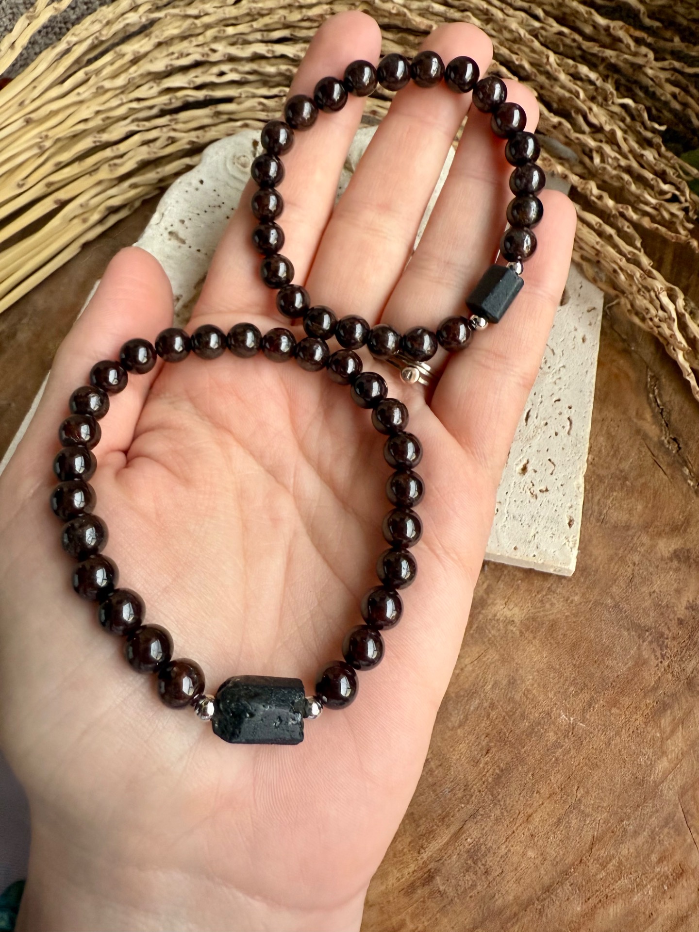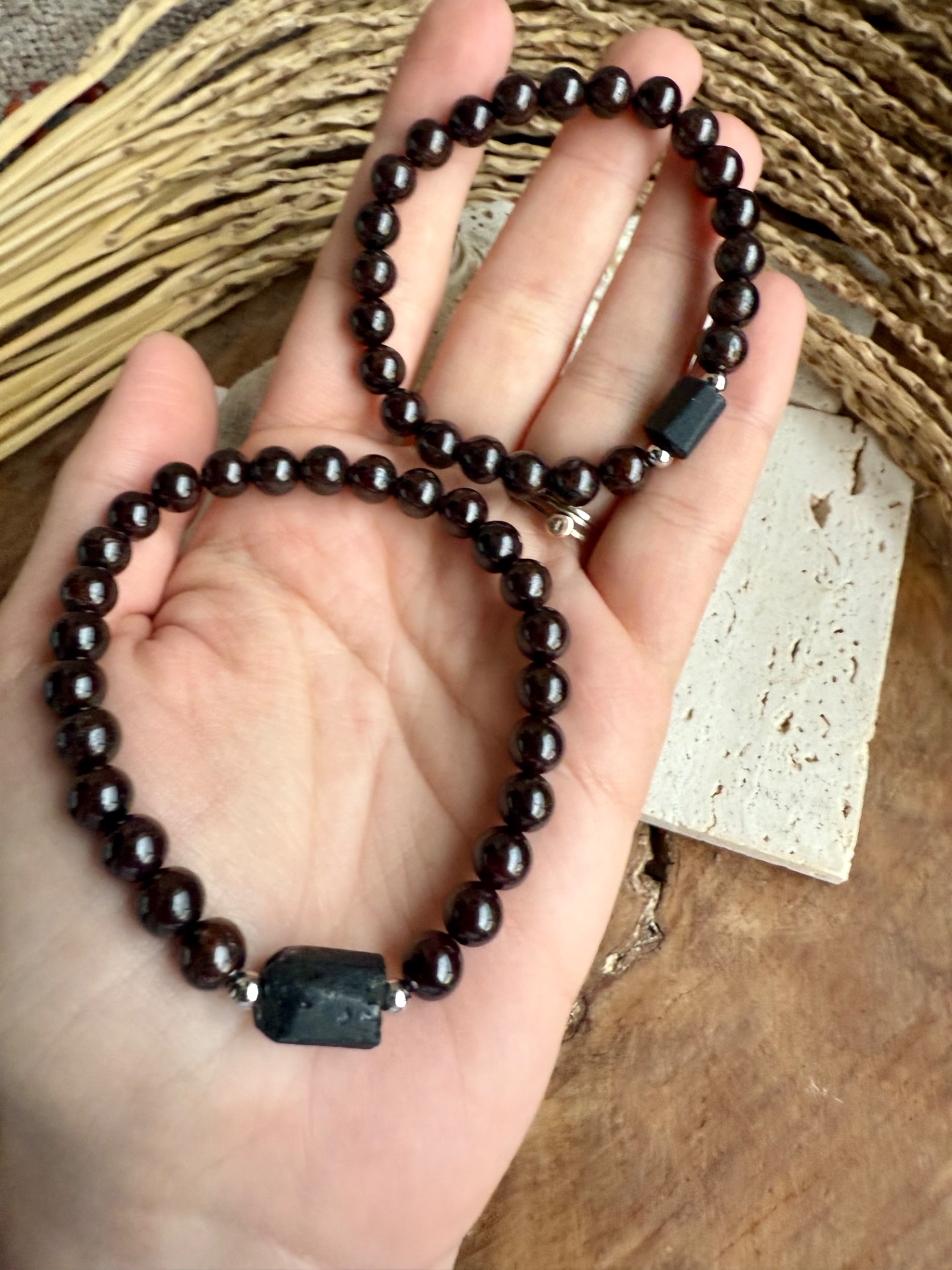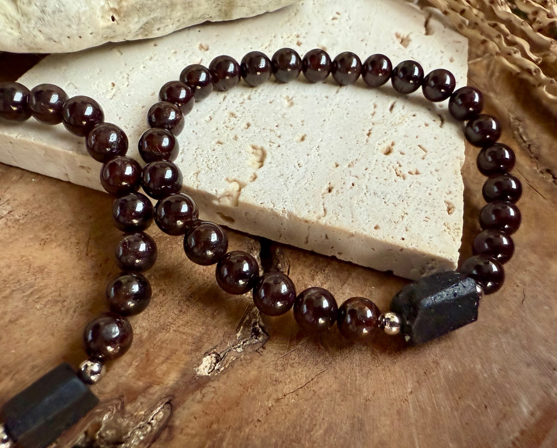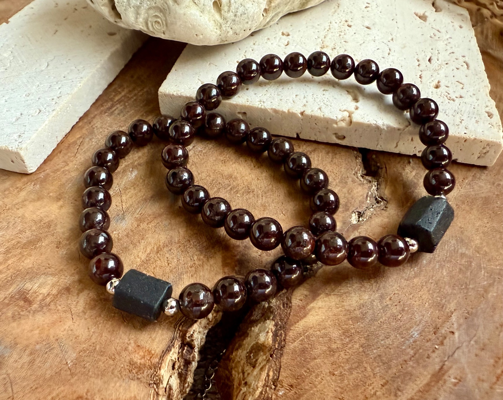 Tieto jedinečné partnerské náramky spájajú indický granát a surový čierny turmalín, ktoré podporujú vášeň, sexualitu a harmóniu vo vzťahu.