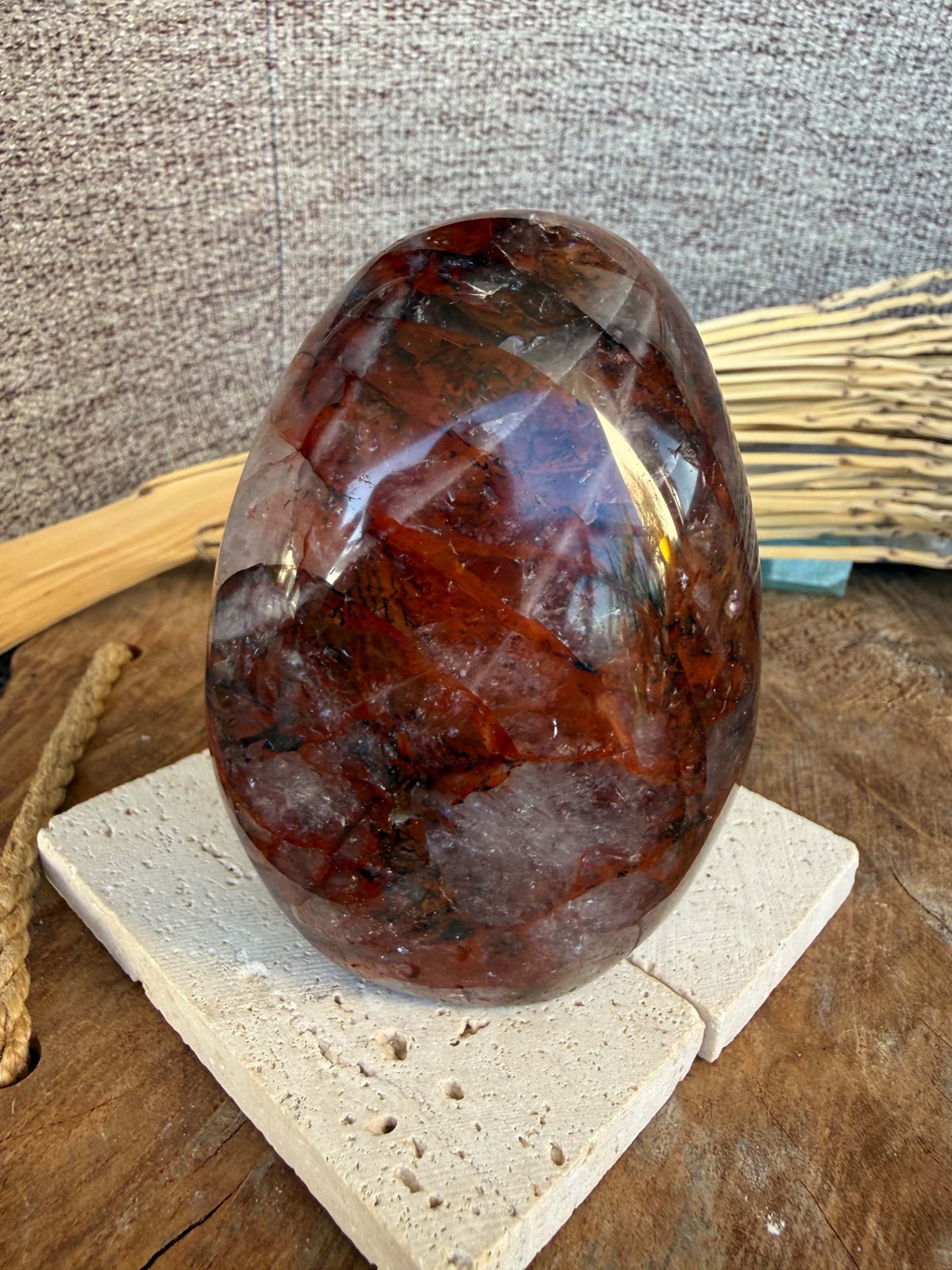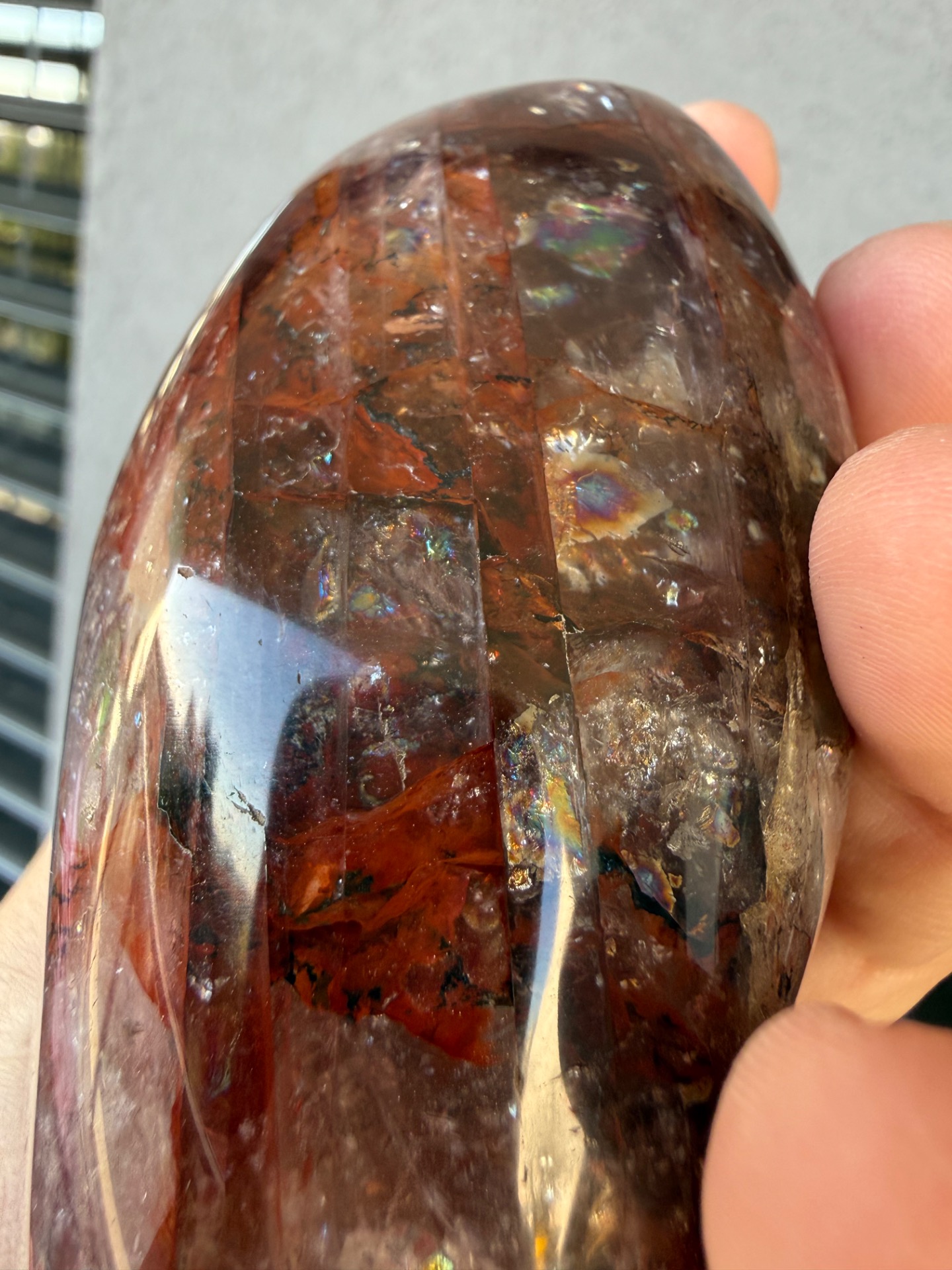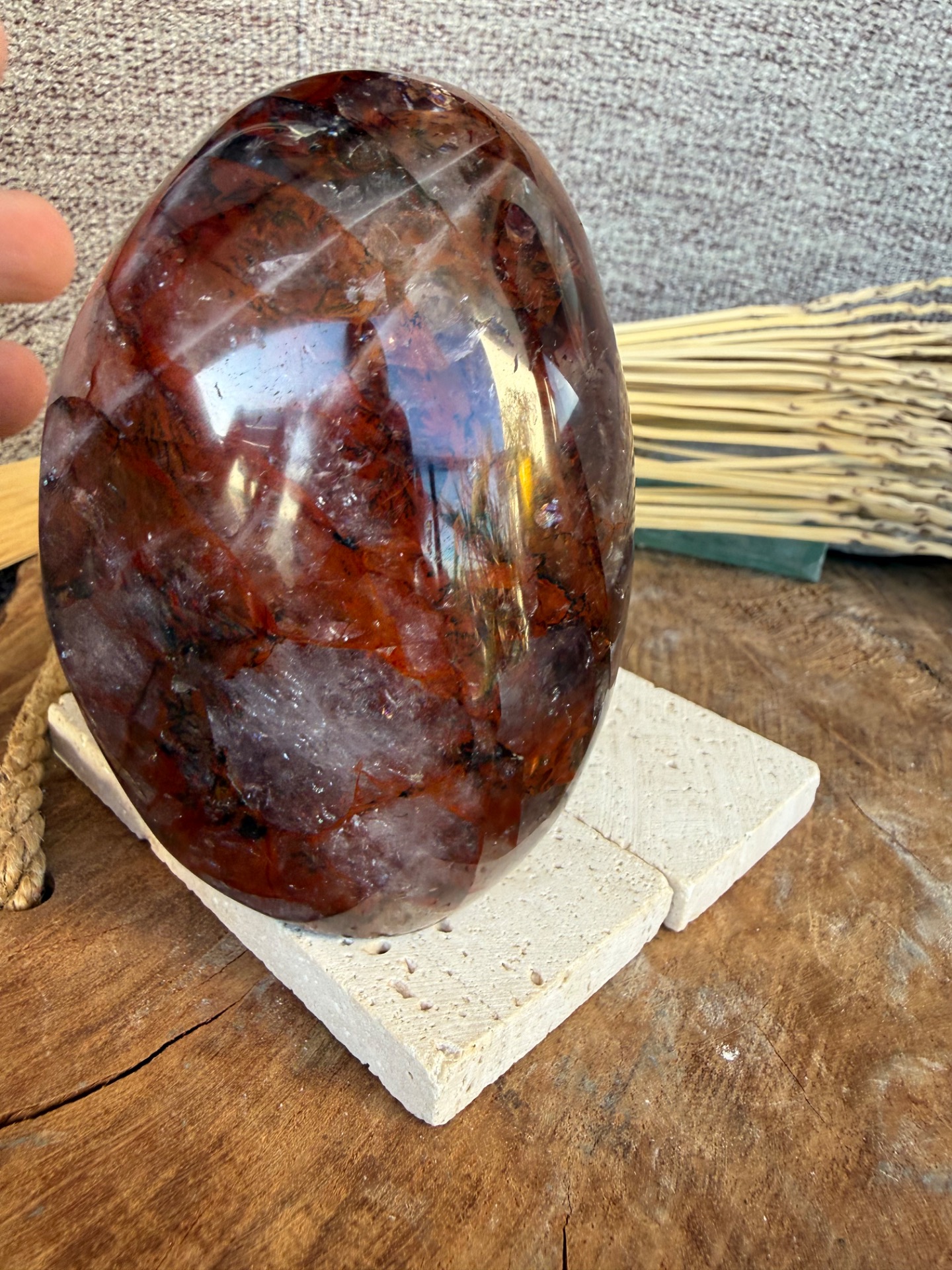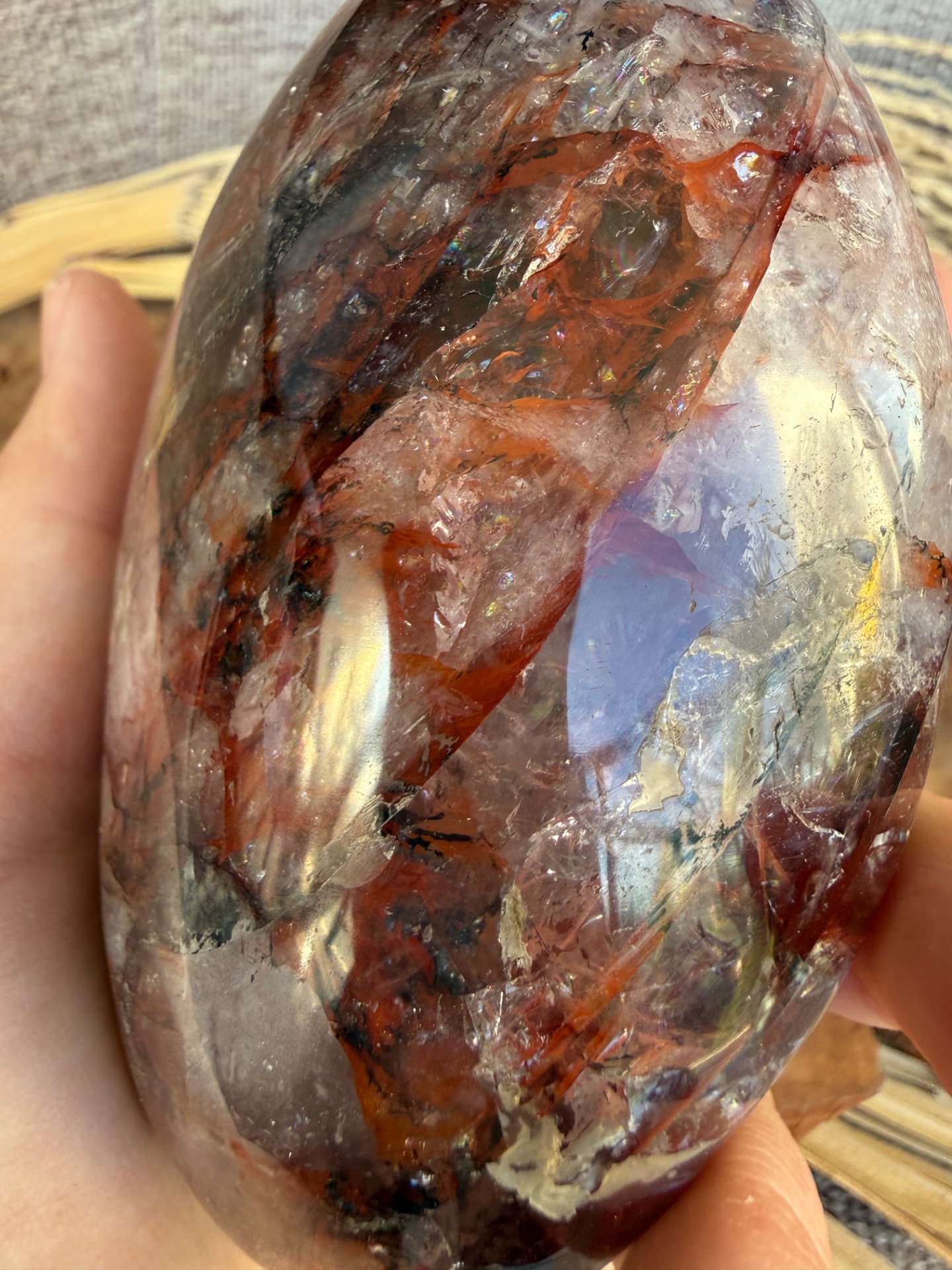 Tento mimoriadne kvalitný AAA hematoid krištáľ je výnimočný svojou intenzívnou, sýto červenou energiou a výraznými vnútornými dúhami, ktoré sa v jeho štruktúre rozžiarujú pri dopade svetla. Ide o veľmi silný a vizuálne dominantný kúsok, ktorý pôsobí ako živý zdroj energie.