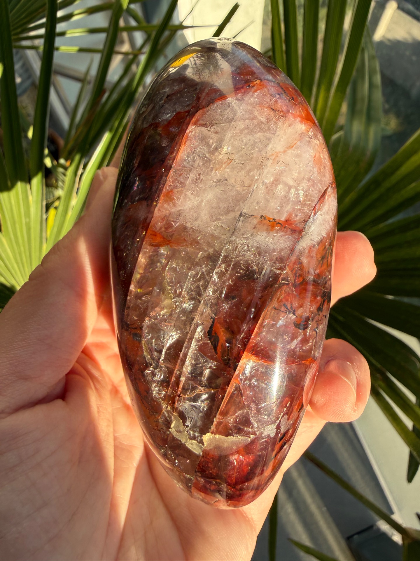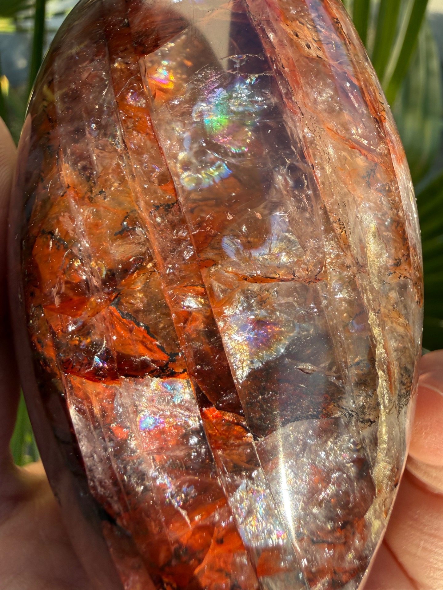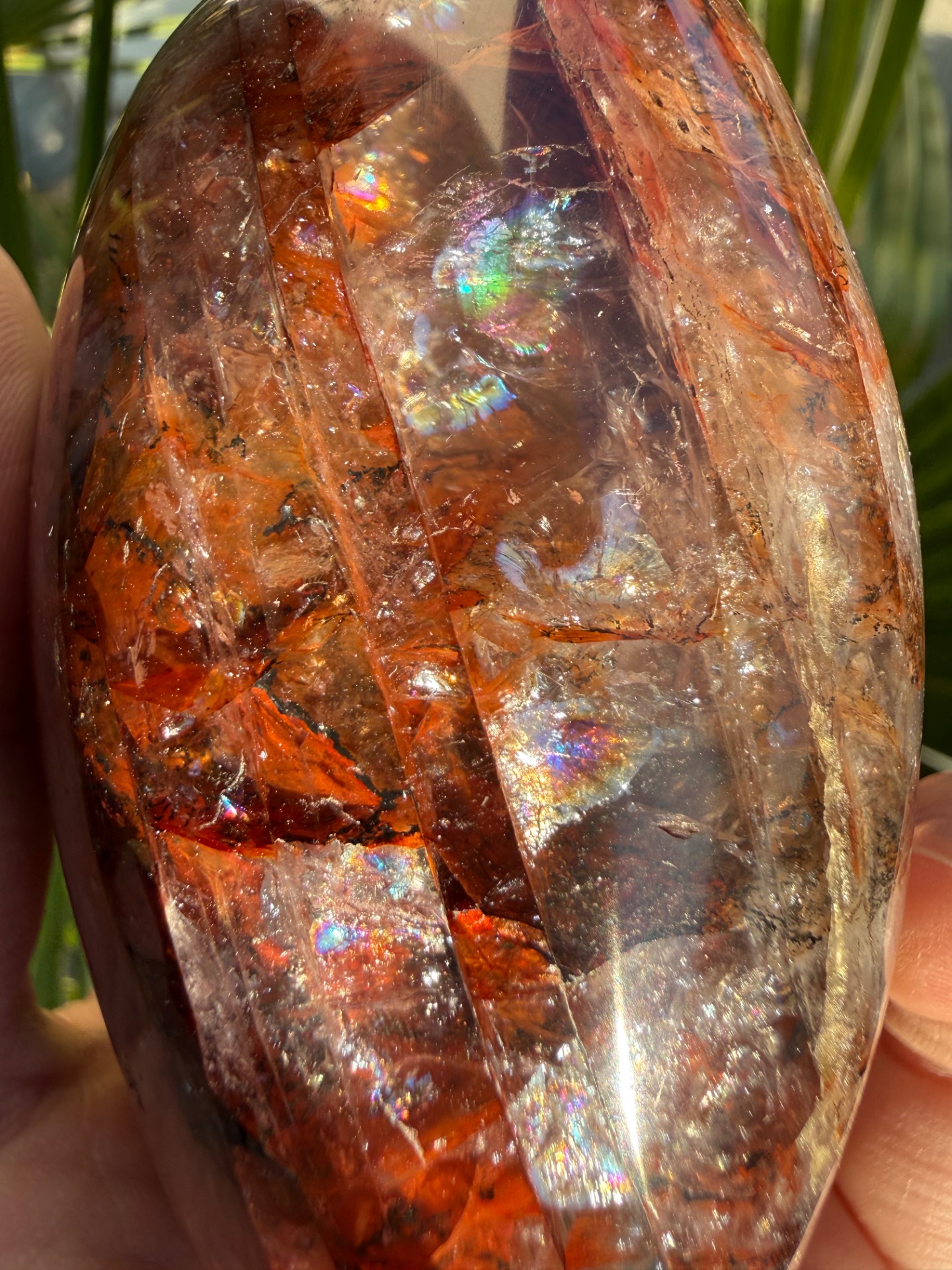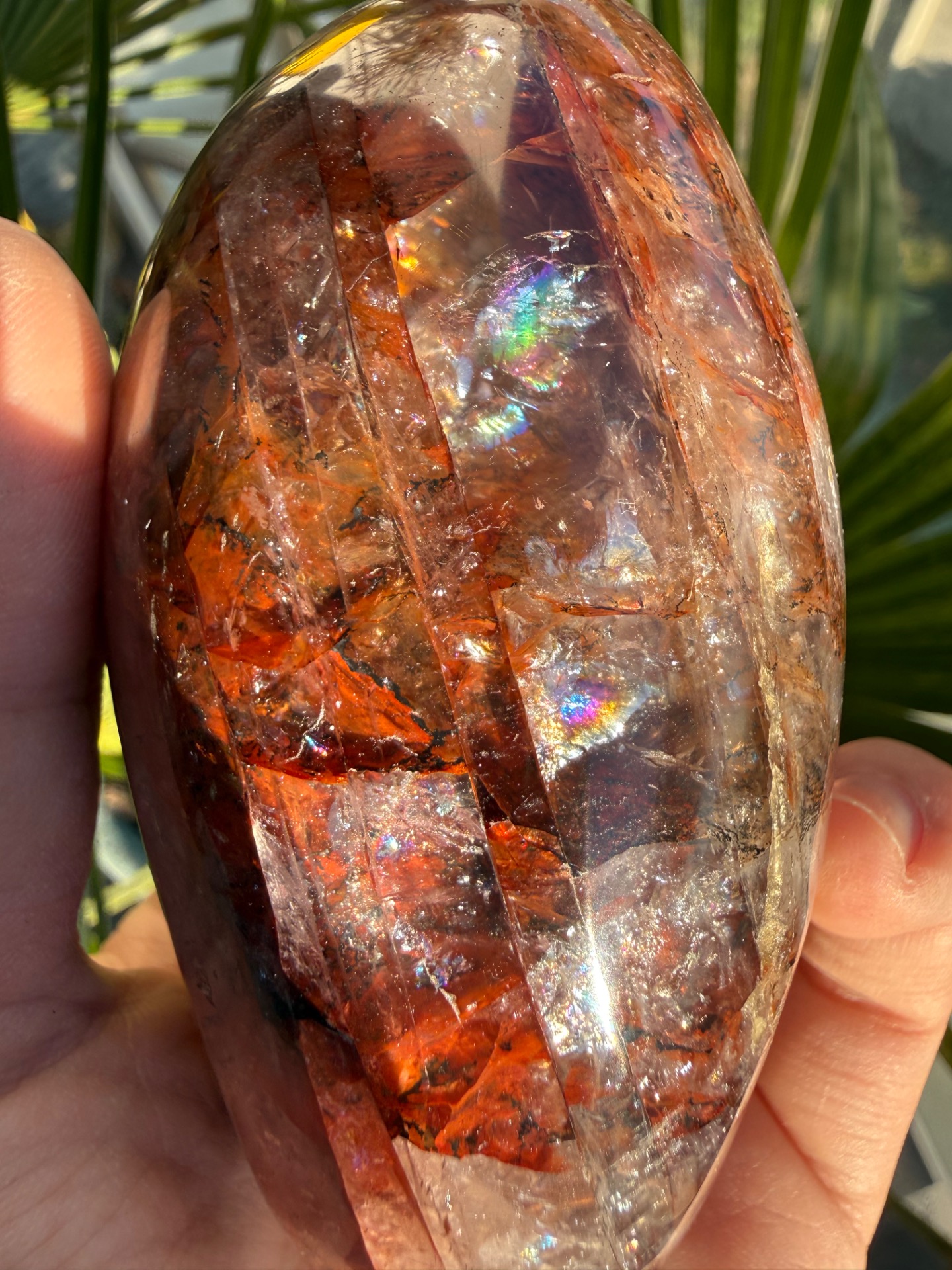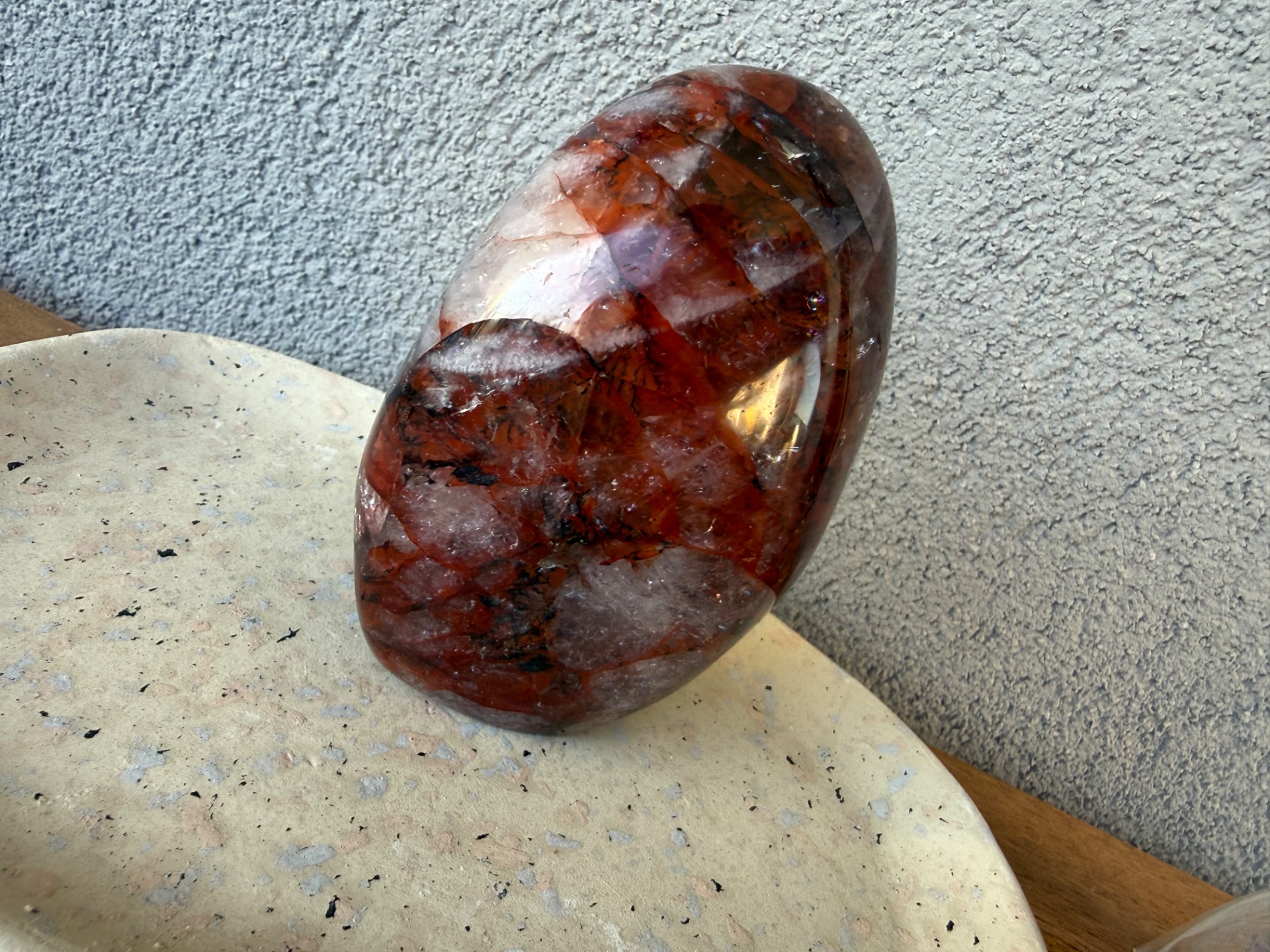 Tento mimoriadne kvalitný AAA hematoid krištáľ je výnimočný svojou intenzívnou, sýto červenou energiou a výraznými vnútornými dúhami, ktoré sa v jeho štruktúre rozžiarujú pri dopade svetla. Ide o veľmi silný a vizuálne dominantný kúsok, ktorý pôsobí ako živý zdroj energie.