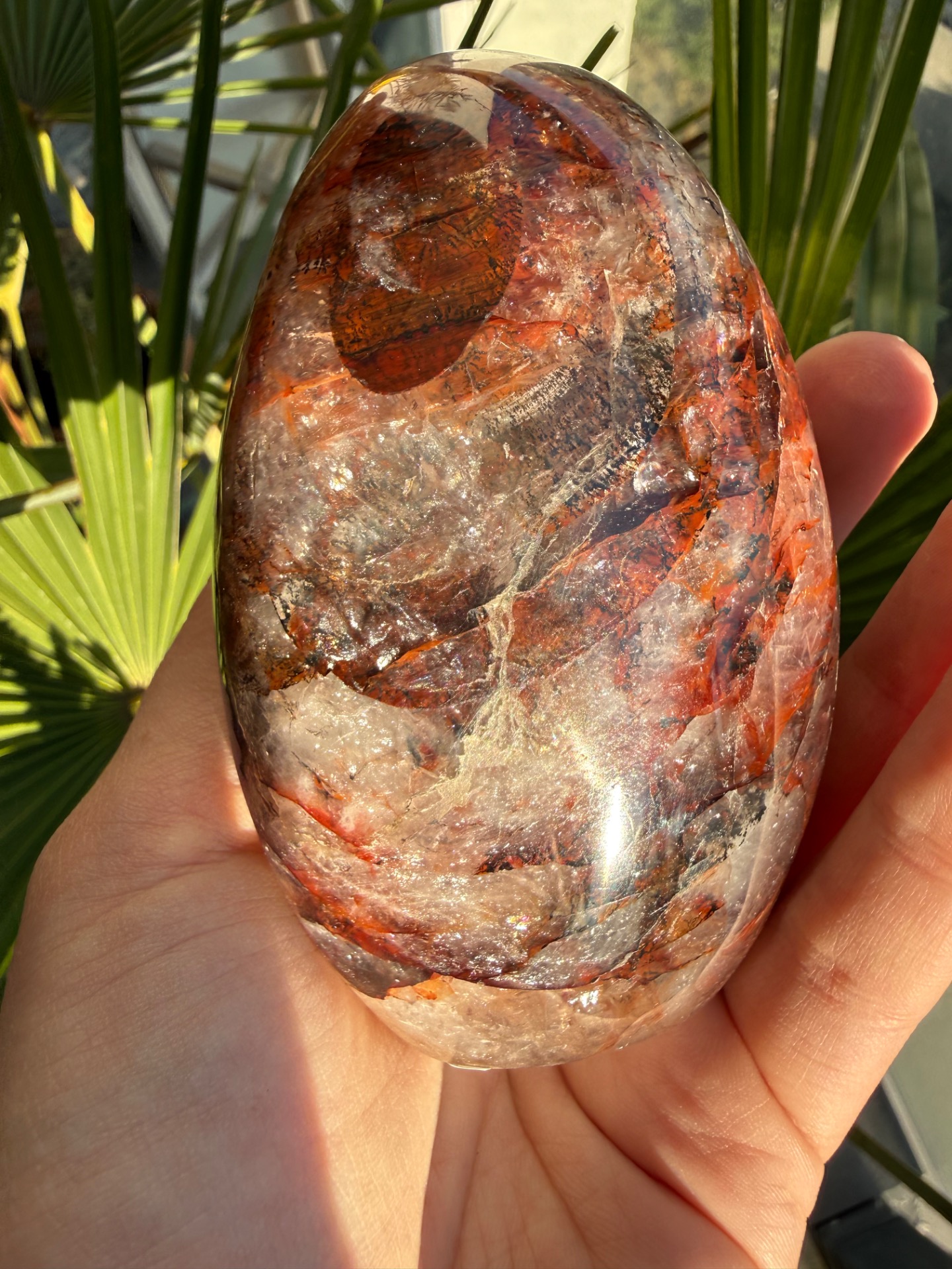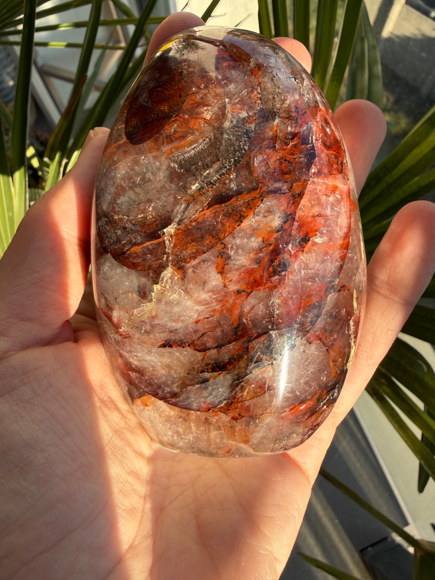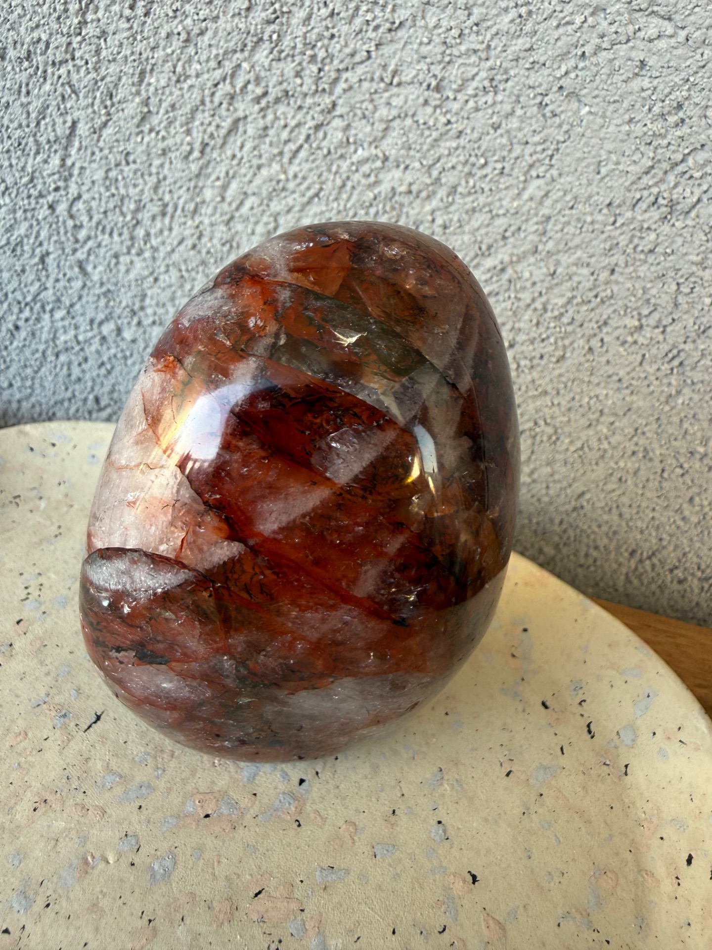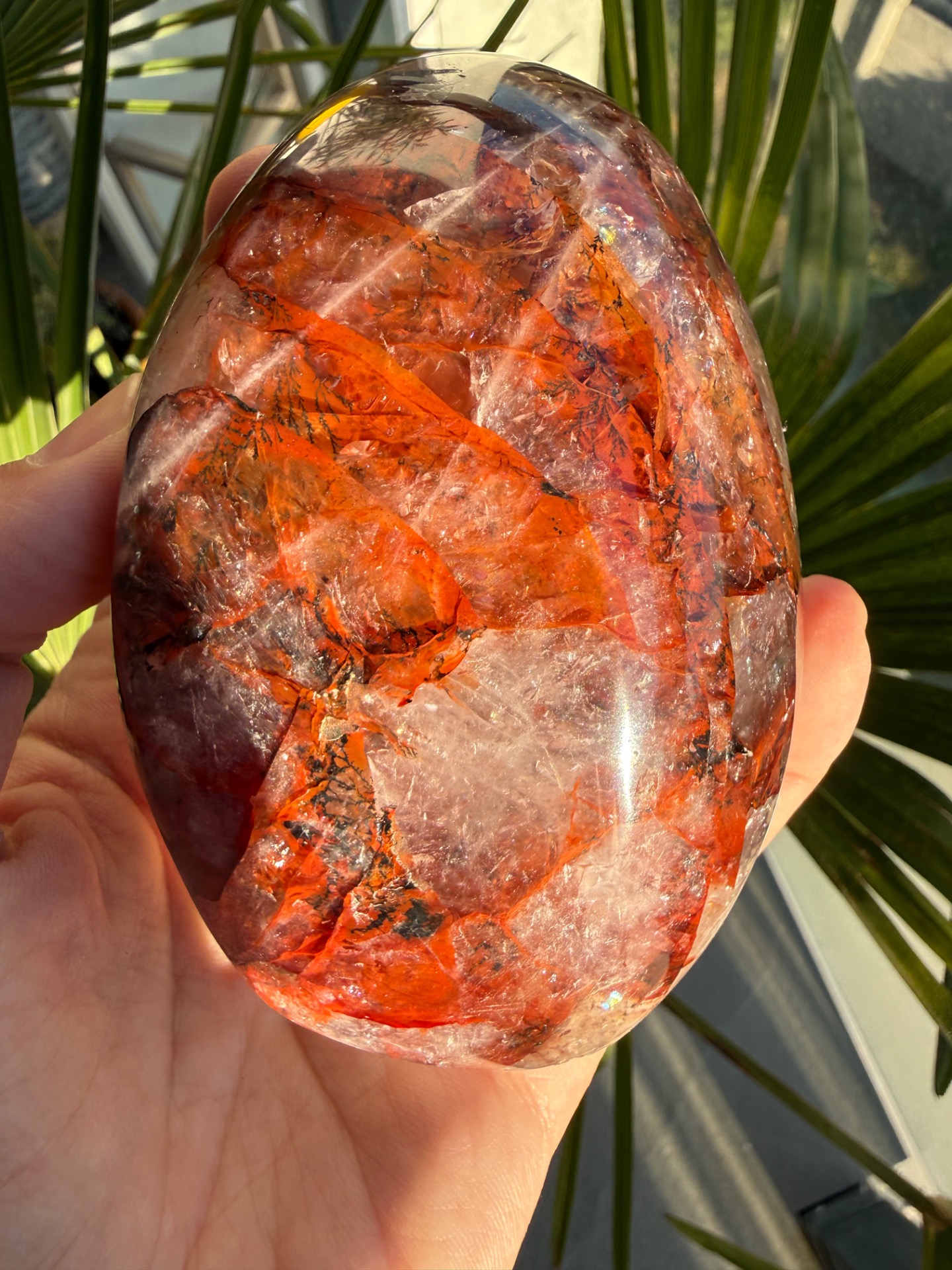Tento mimoriadne kvalitný AAA hematoid krištáľ je výnimočný svojou intenzívnou, sýto červenou energiou a výraznými vnútornými dúhami, ktoré sa v jeho štruktúre rozžiarujú pri dopade svetla. Ide o veľmi silný a vizuálne dominantný kúsok, ktorý pôsobí ako živý zdroj energie.