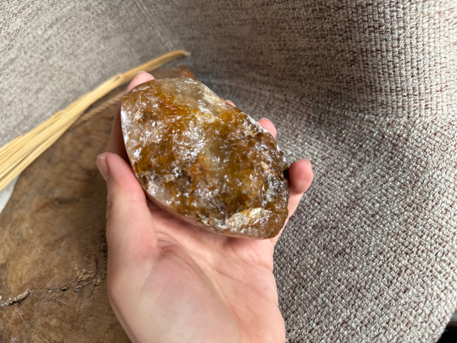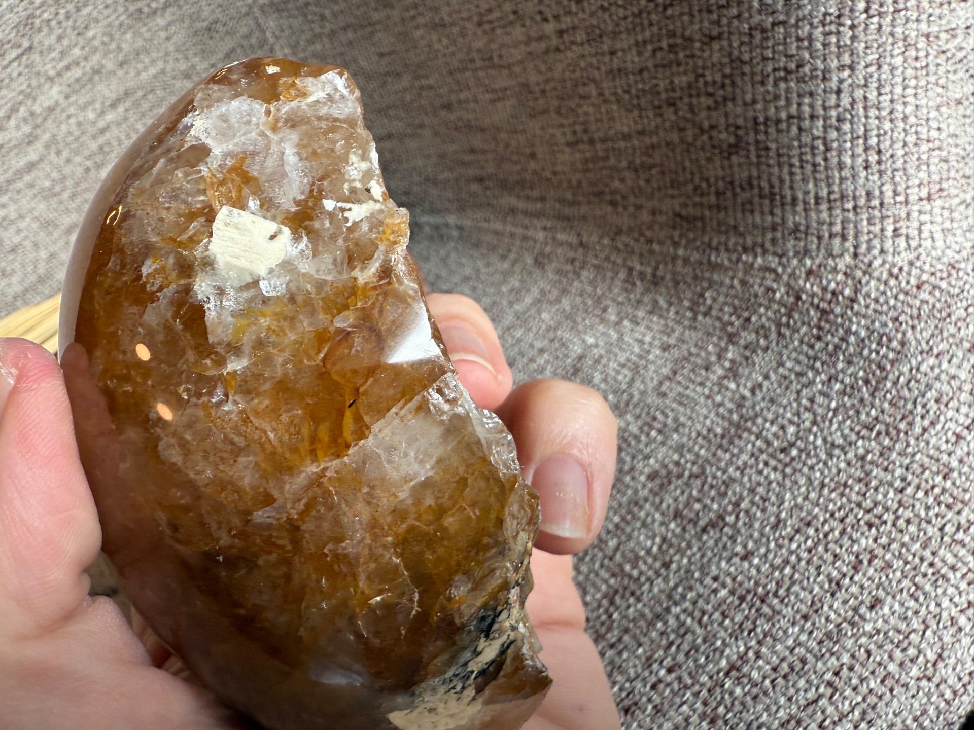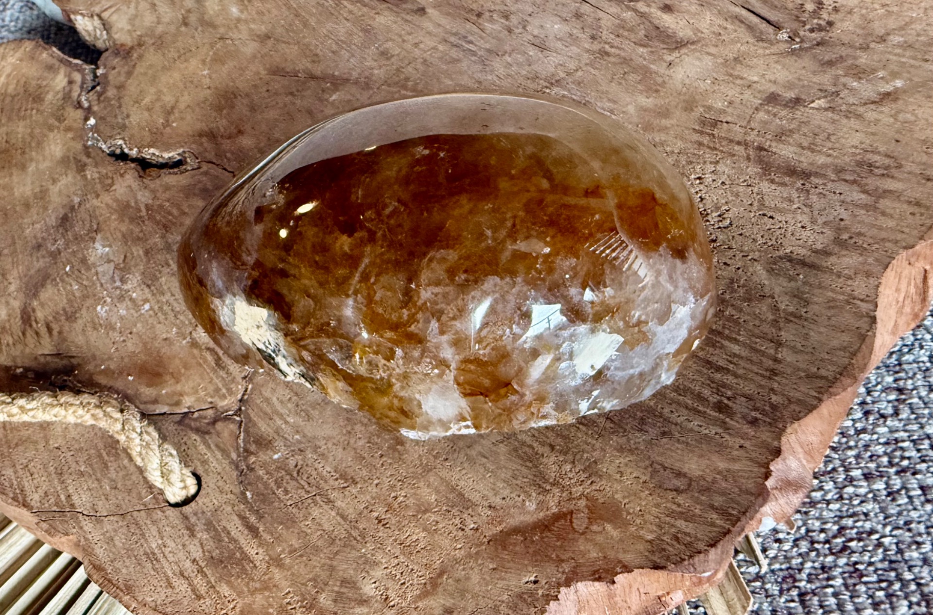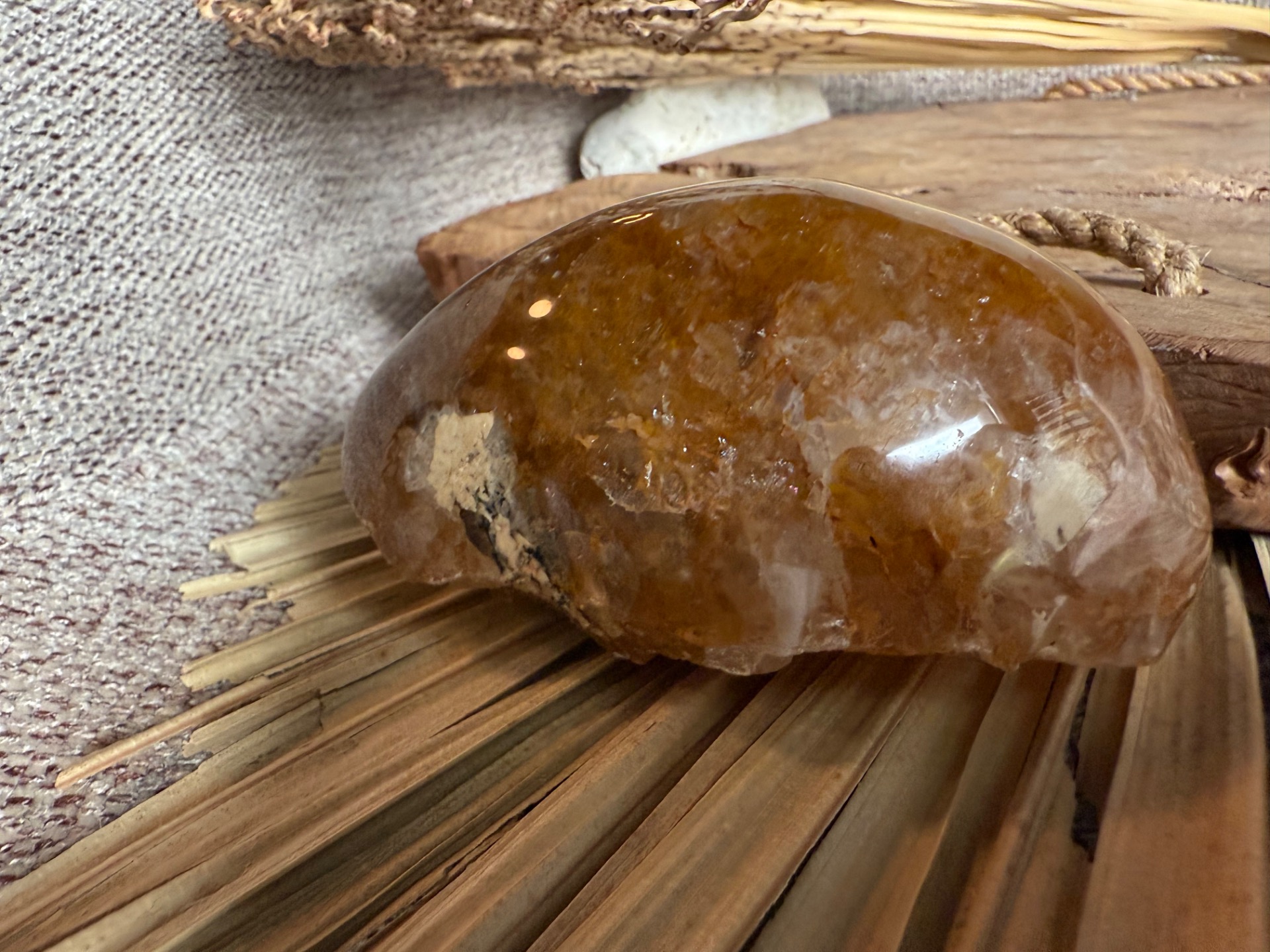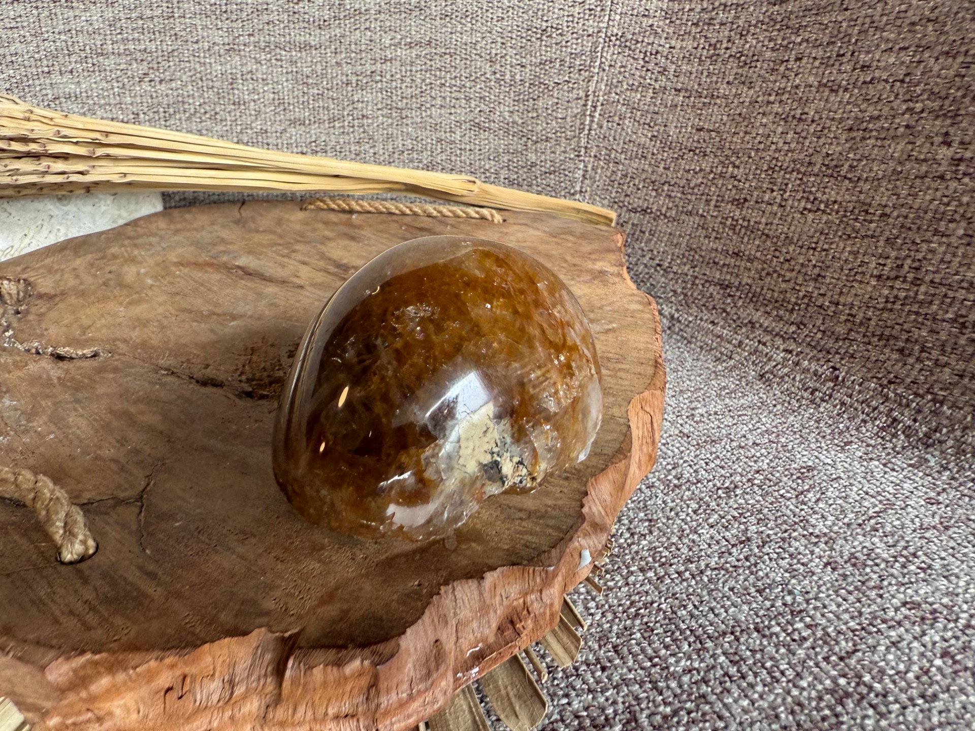 Objavte silnú uzemňujúcu energiu hematoidu v tomto jedinečnom mineráli. Tento kameň spája čistotu krištáľu s uzemňujúcou energiou železa, čím prináša stabilitu, ochranu a rovnováhu. Každý kus je výnimočný – jedna strana je leštená, aby vynikli žilky a lesk hematoidu, zatiaľ čo druhá strana je ponechaná v surovom stave, čím sa zachováva autentická krása minerálu.