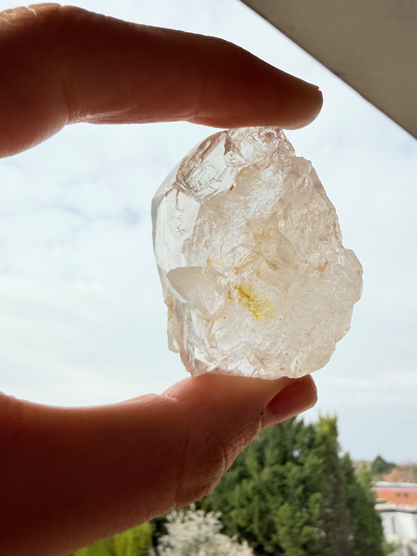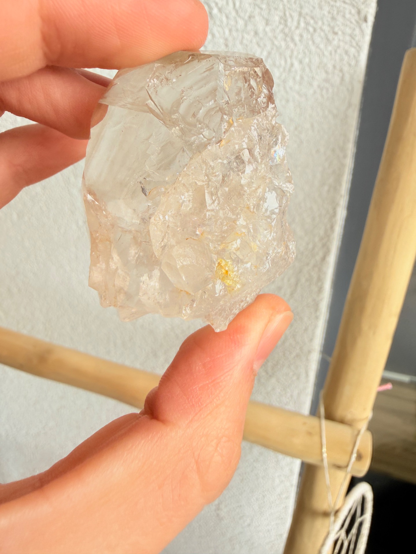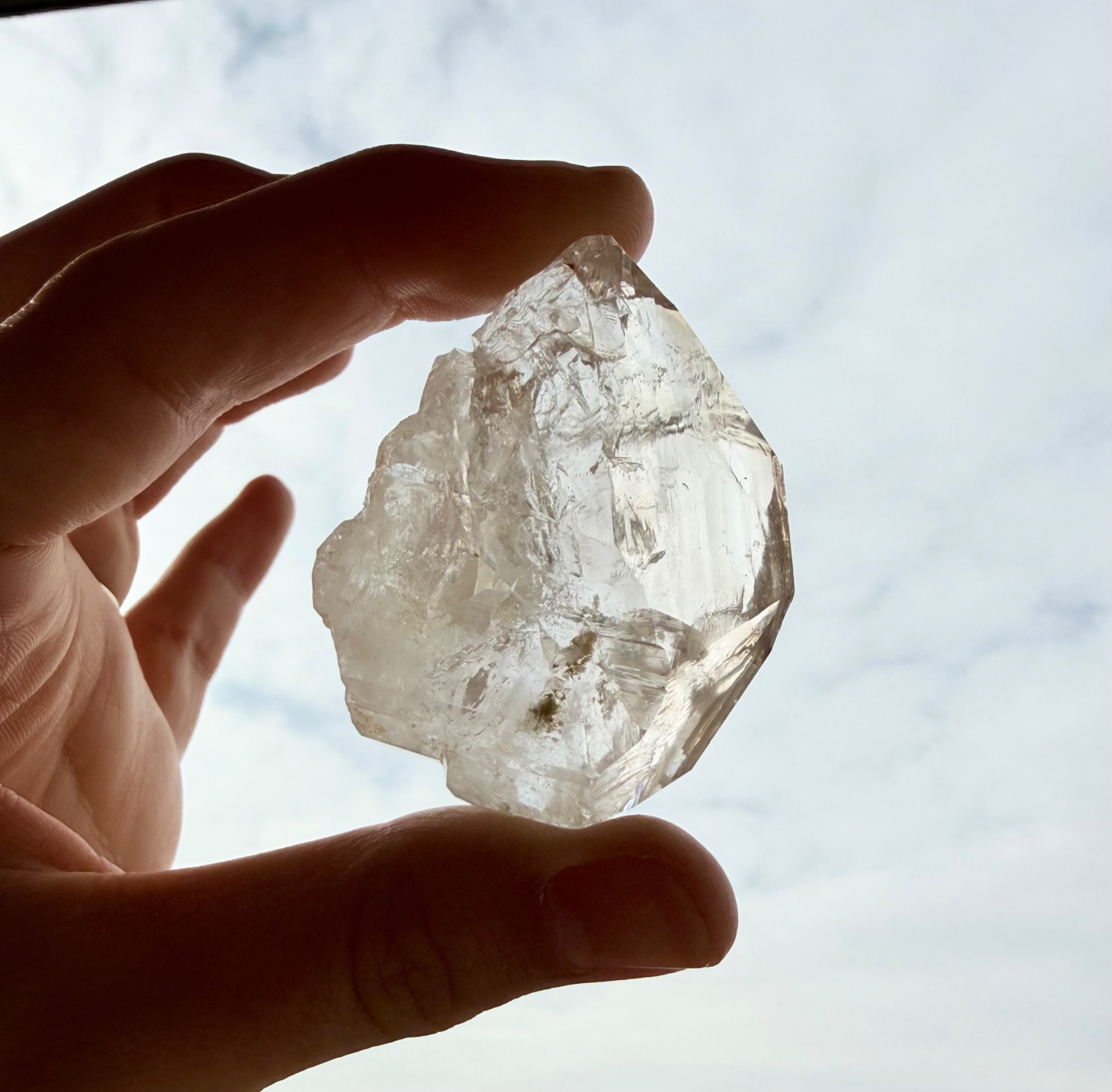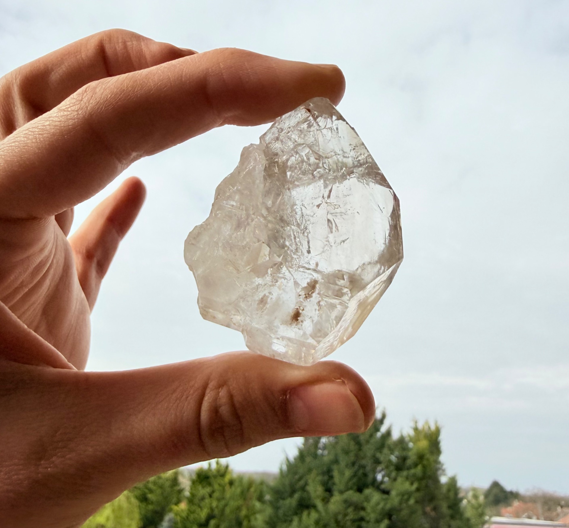 Tento jedinečný Herkimer diamant v surovej forme je výnimočný svojou prirodzenou krásou a silnou energiou. Kryštál má nádhernú kombináciu čírej a jemne tmavšej časti, ktorá vytvára fascinujúcu hru svetla a tieňa – ako symbol duality života.