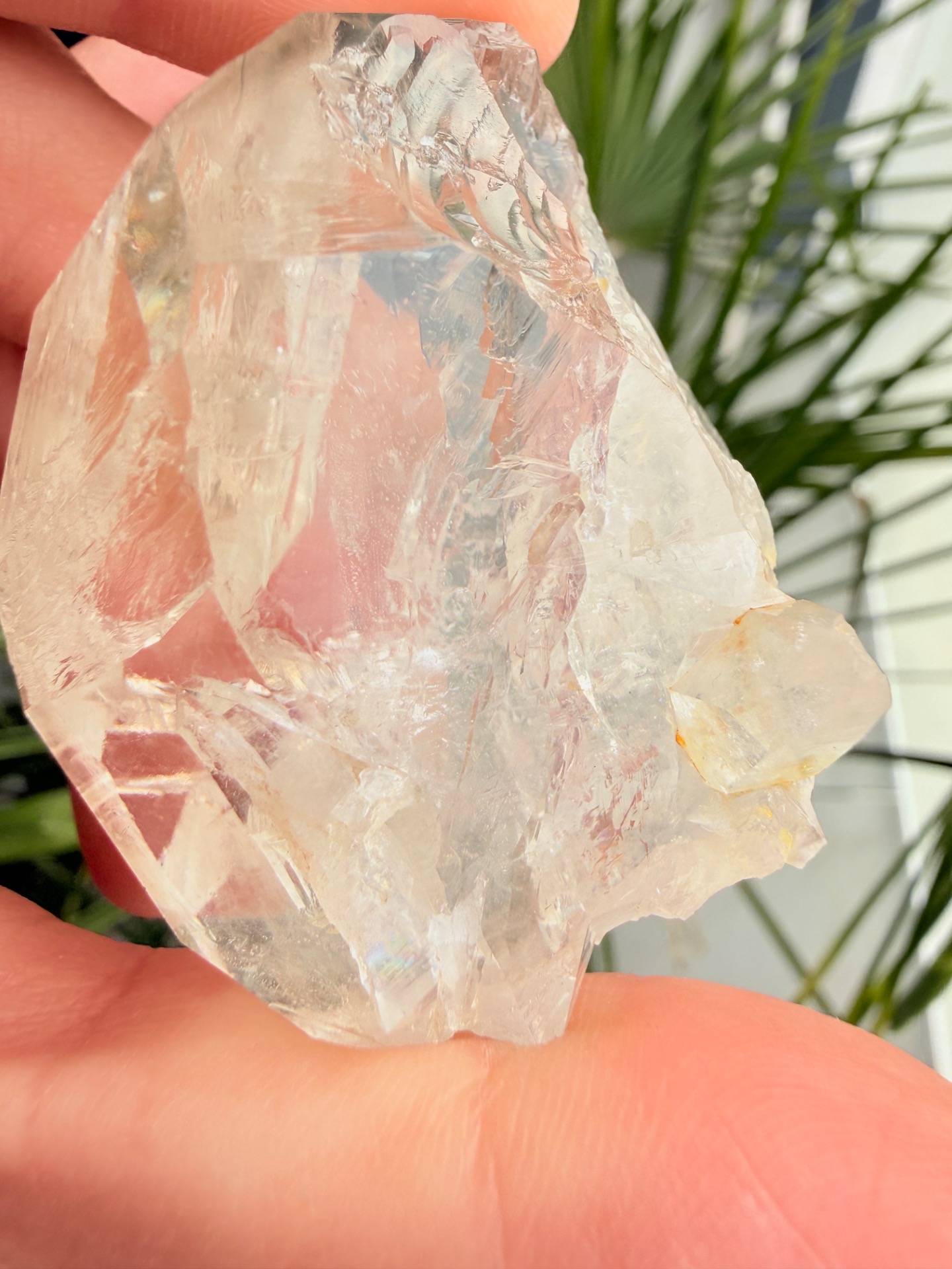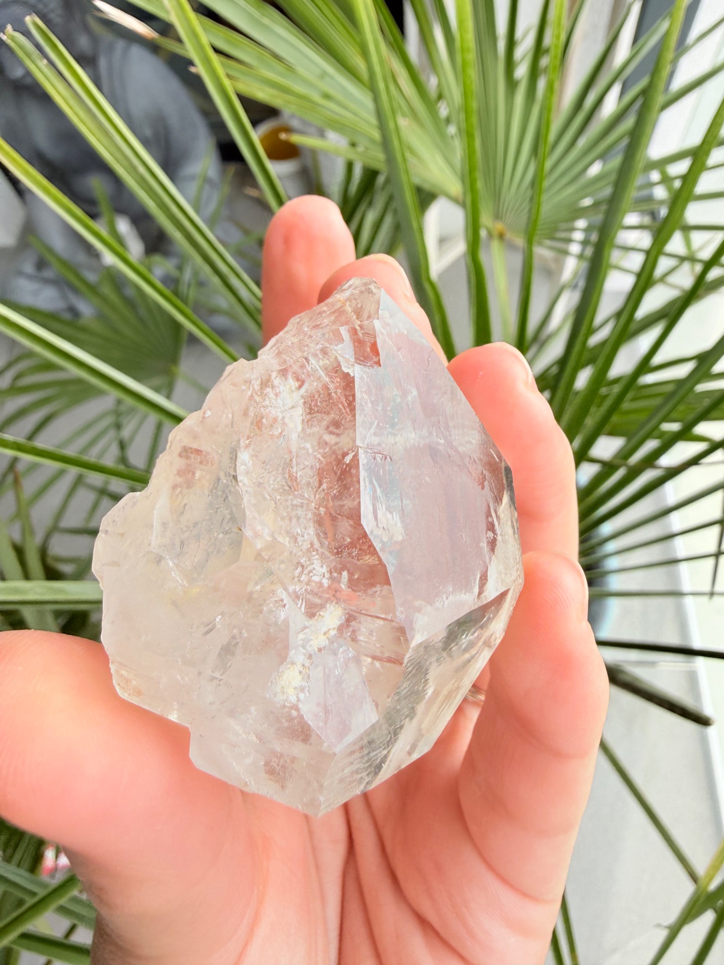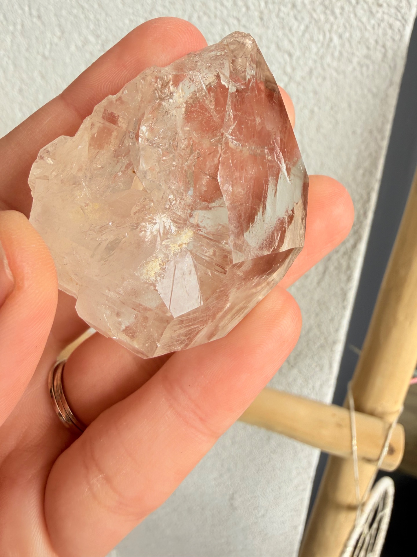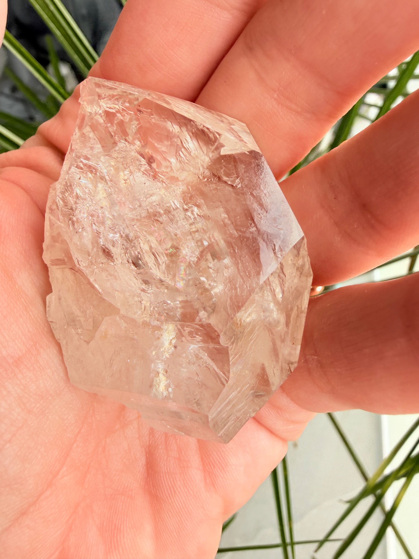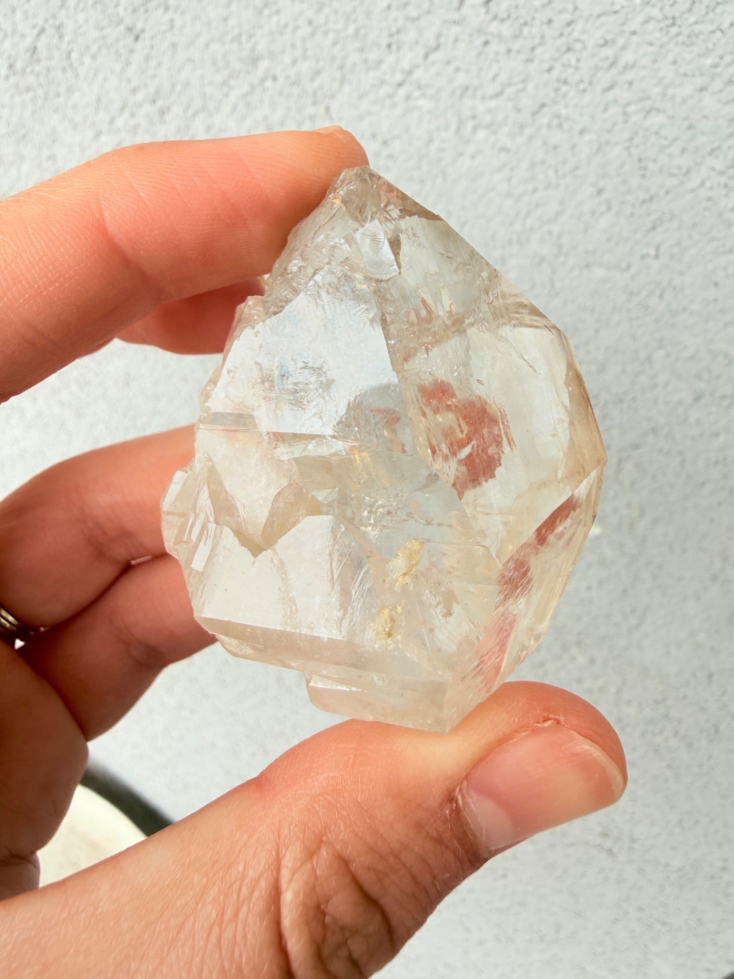 Tento jedinečný Herkimer diamant v surovej forme je výnimočný svojou prirodzenou krásou a silnou energiou. Kryštál má nádhernú kombináciu čírej a jemne tmavšej časti, ktorá vytvára fascinujúcu hru svetla a tieňa – ako symbol duality života.