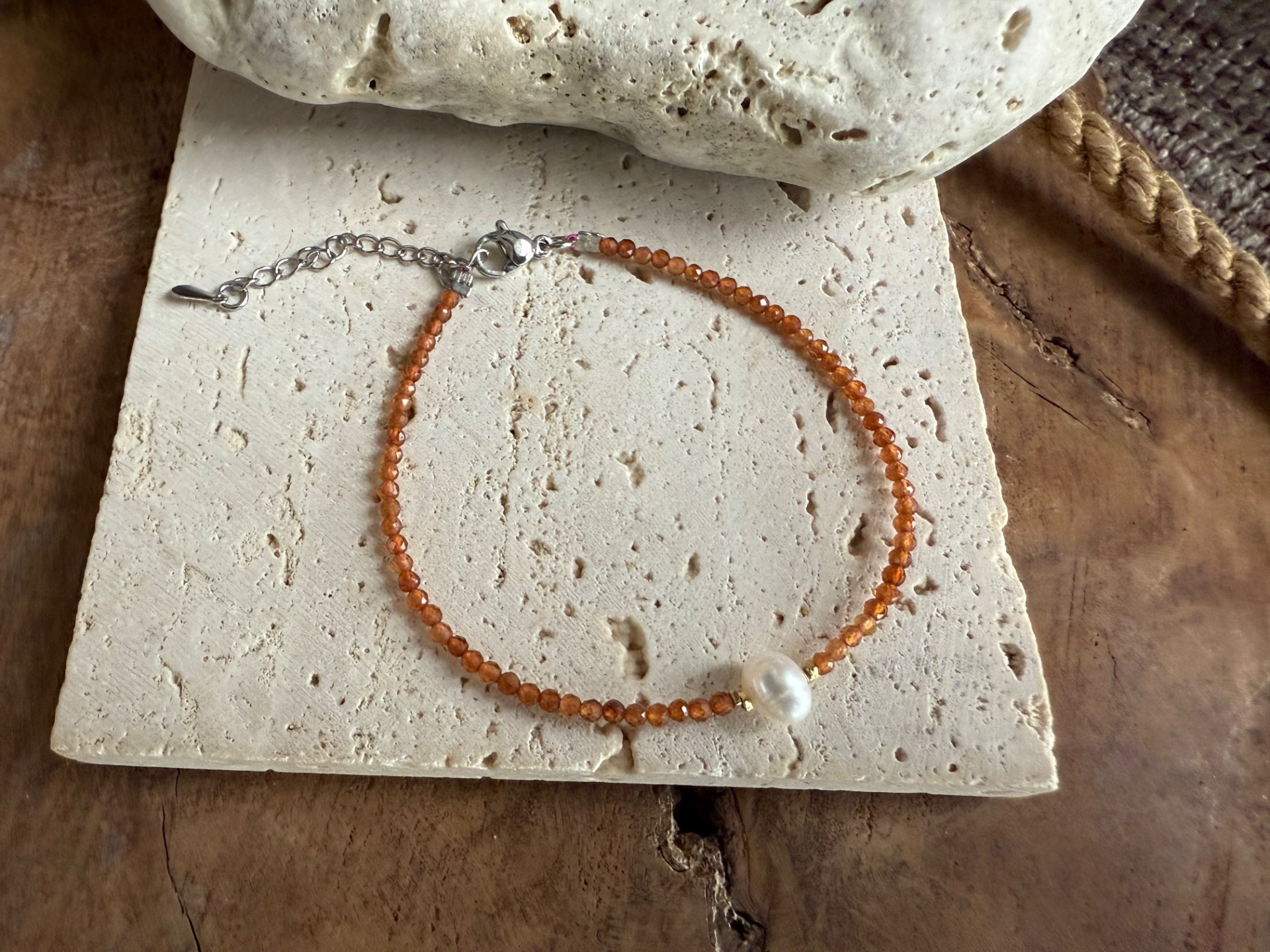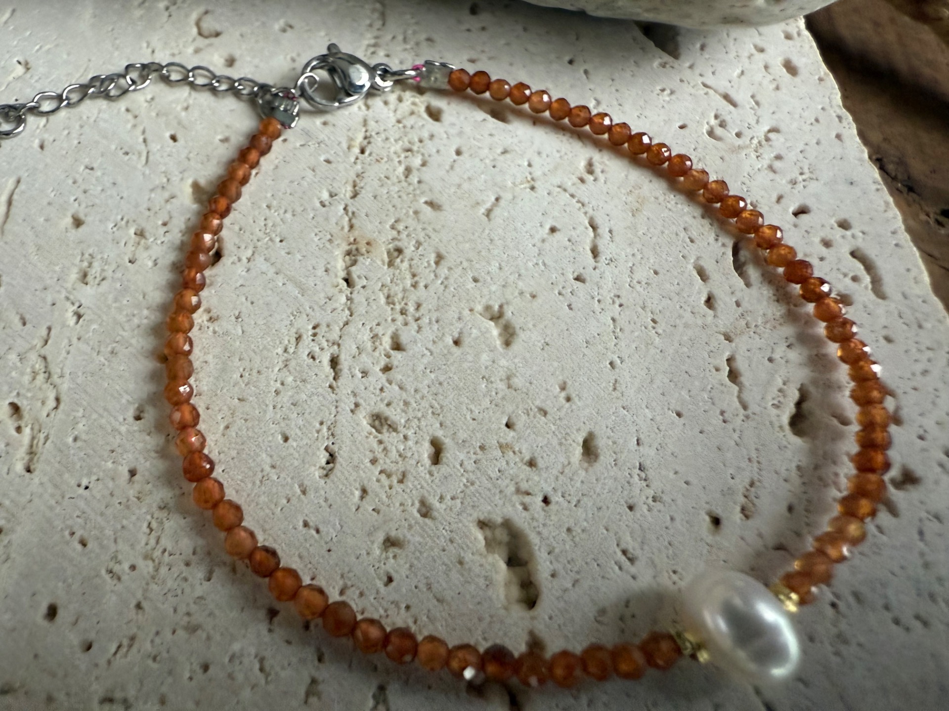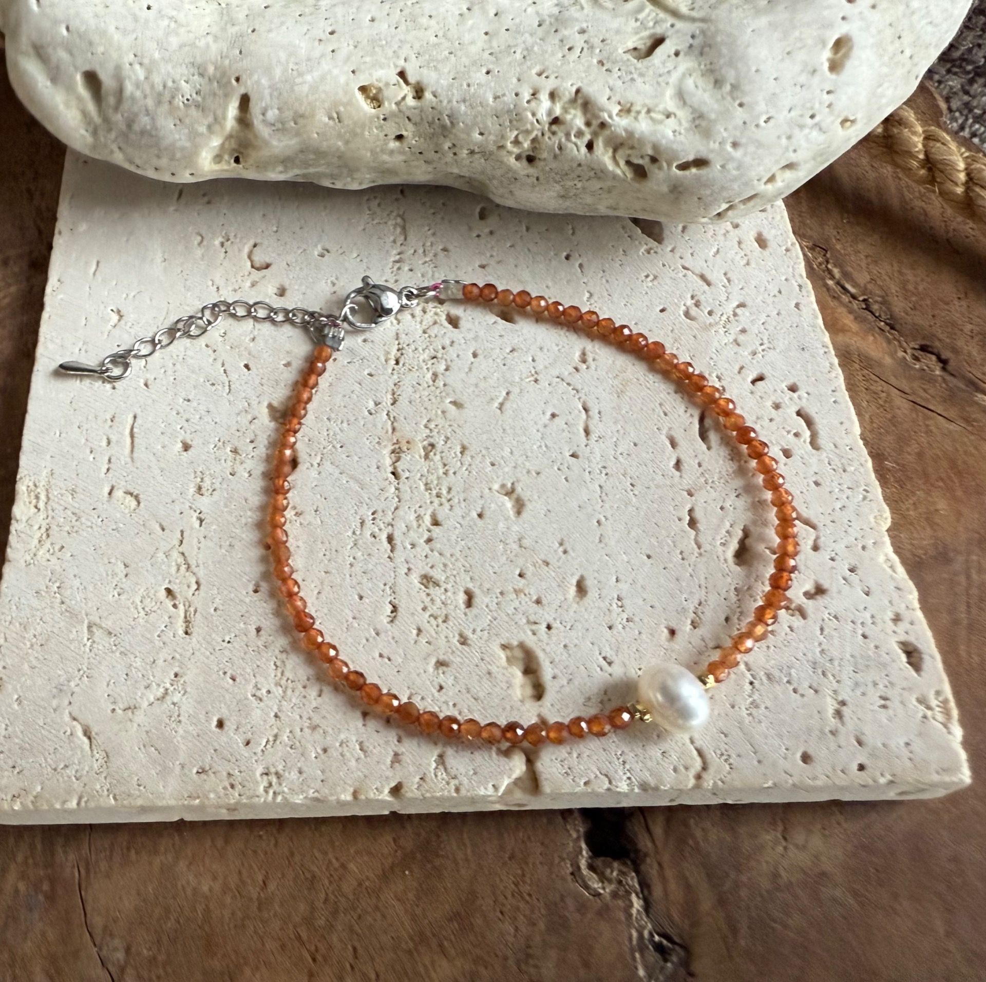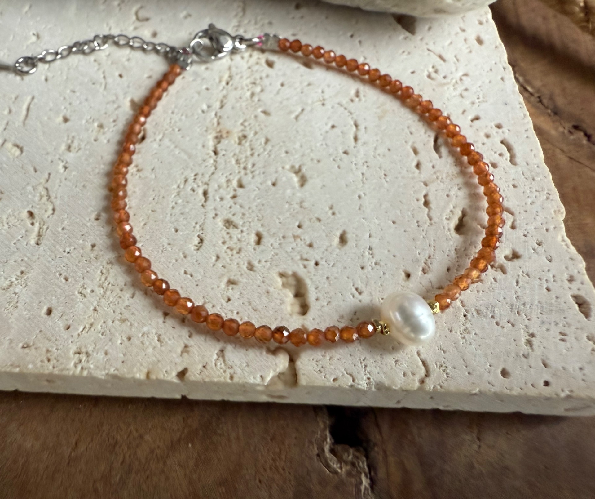 Elegantný náramok z 2 mm korálok hessonitu, doplnený jedinečnou riečnou perlou v strede, s jemnými striebornými komponentmi. Tento kúsok spája teplú, zlatistú energiu hessonitu a jemnú krásu perly, vytvára harmonický šperk vhodný na každodenné nosenie alebo ako výnimočný darček.
