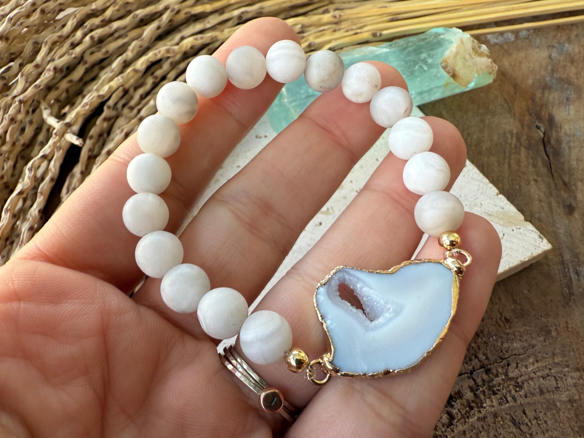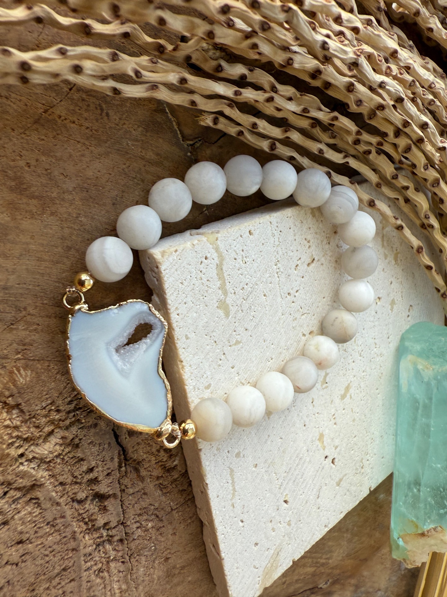 Ľahkosť bytia – Matný sivo-biely achát 8mm + Achátová drúza náramok