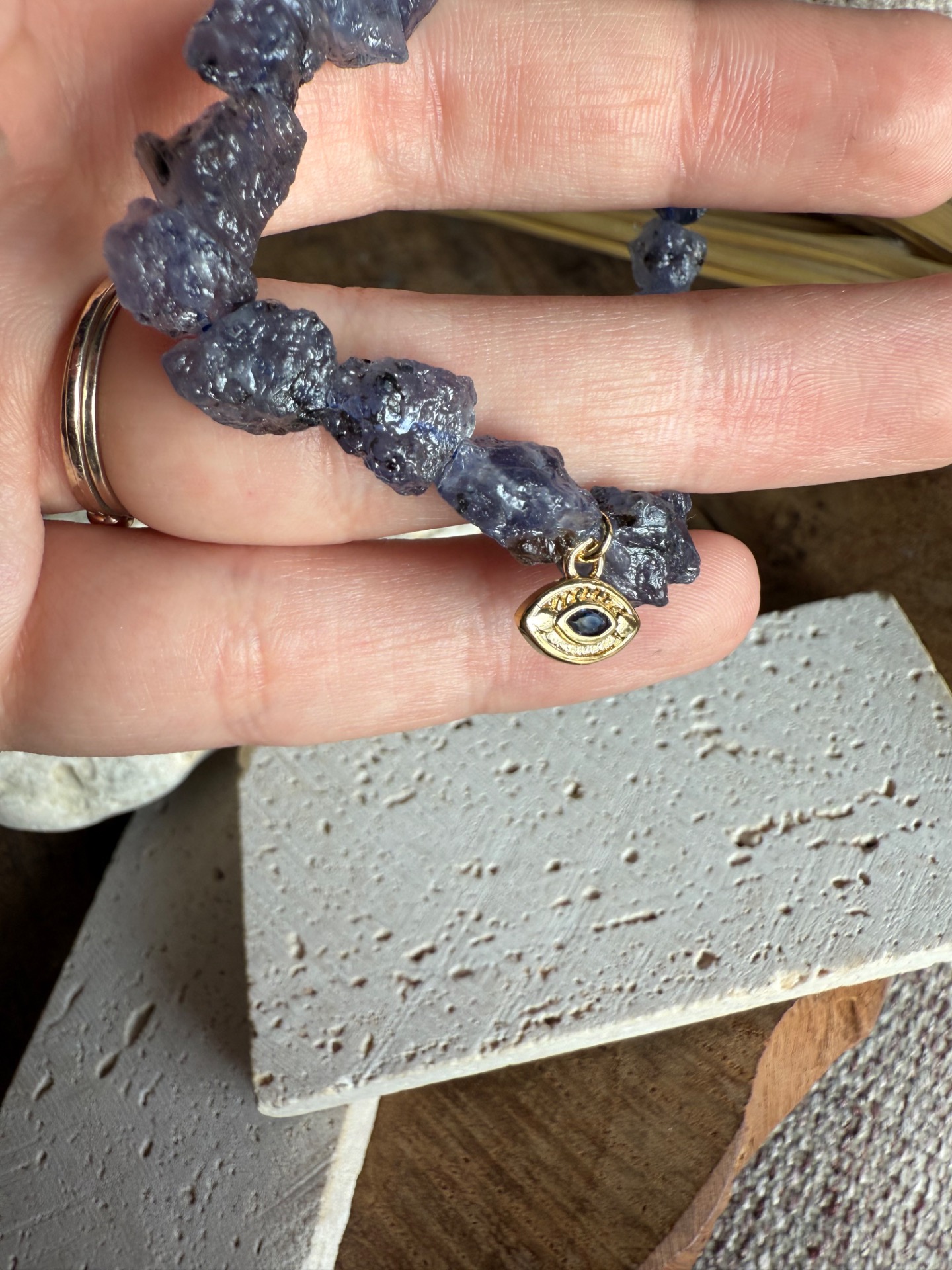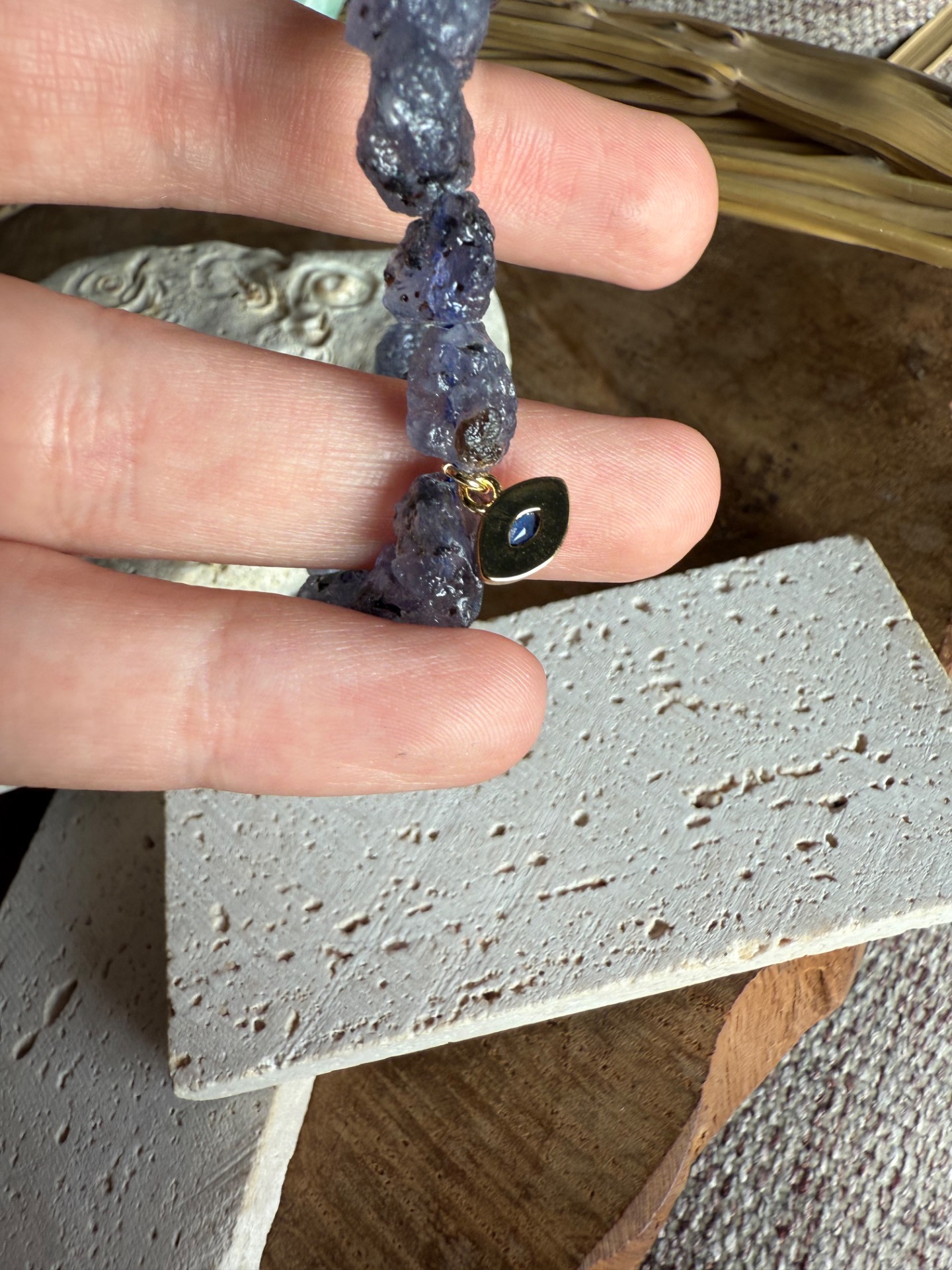 Rozmery: 17 cm, ručne vyrobený, surové kúsky iolitu, doplnený nerezovým okom s modrým kamienkom