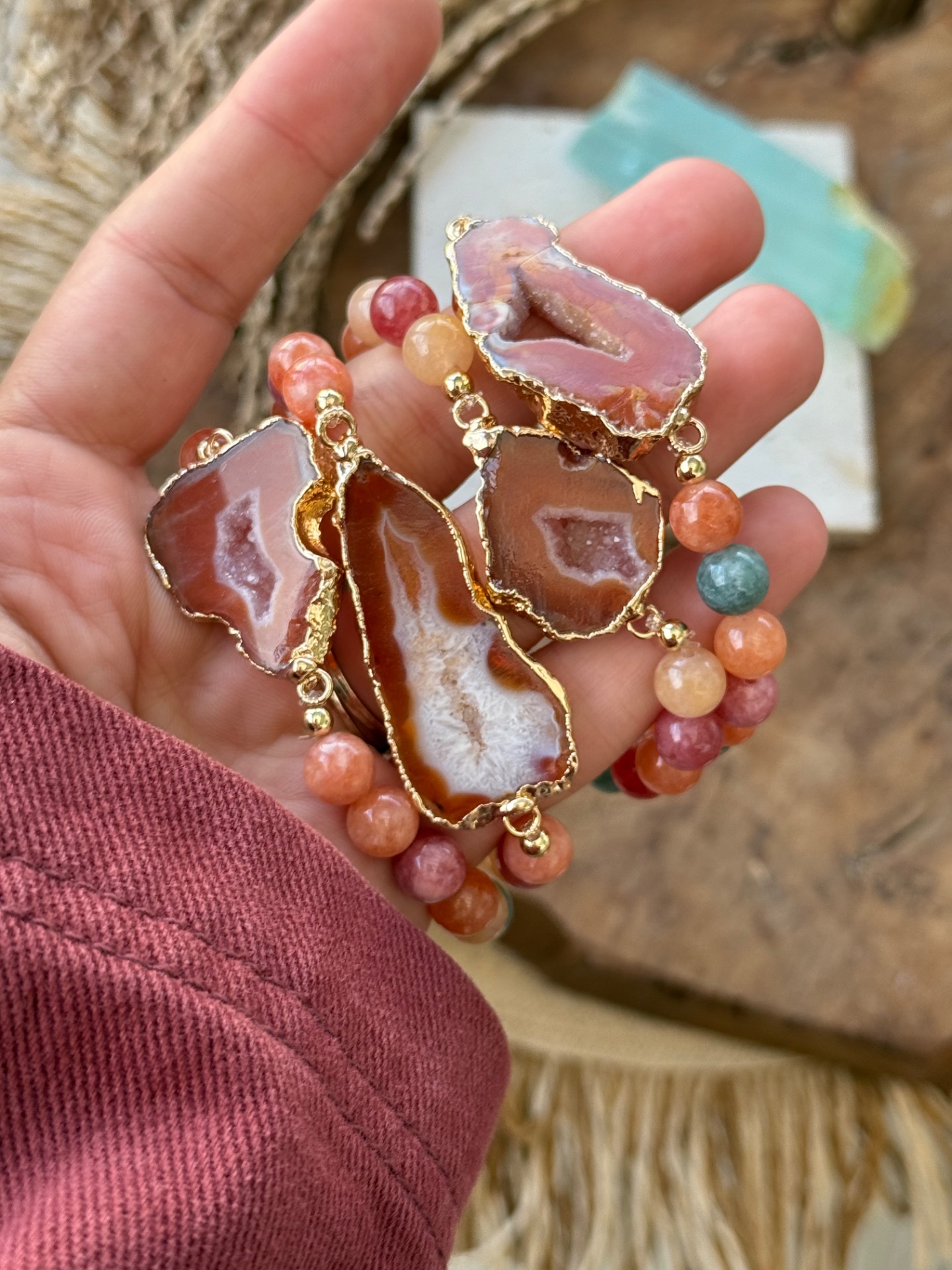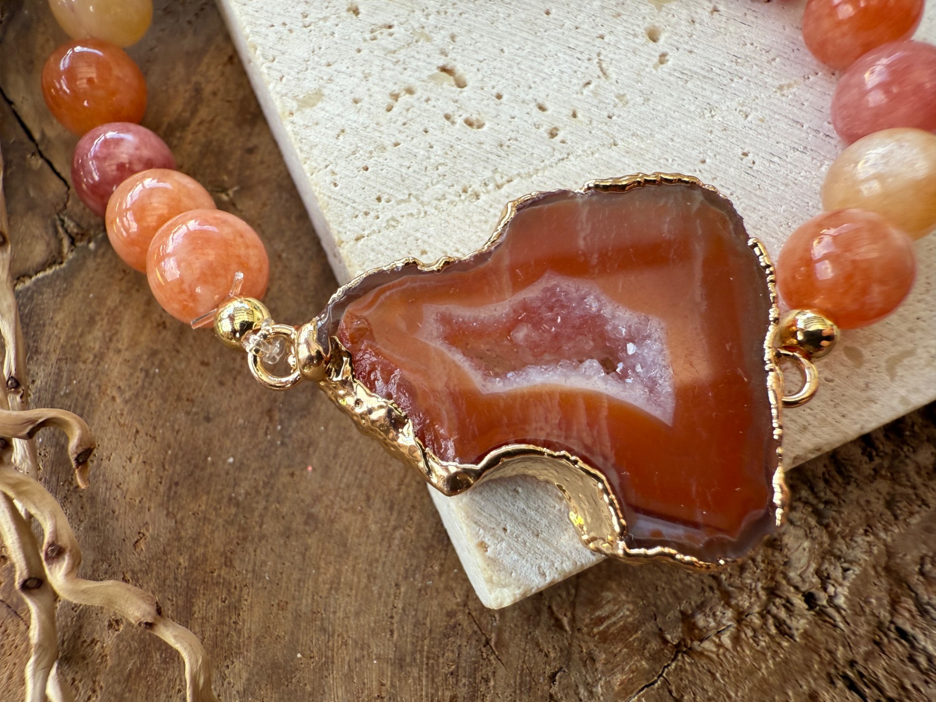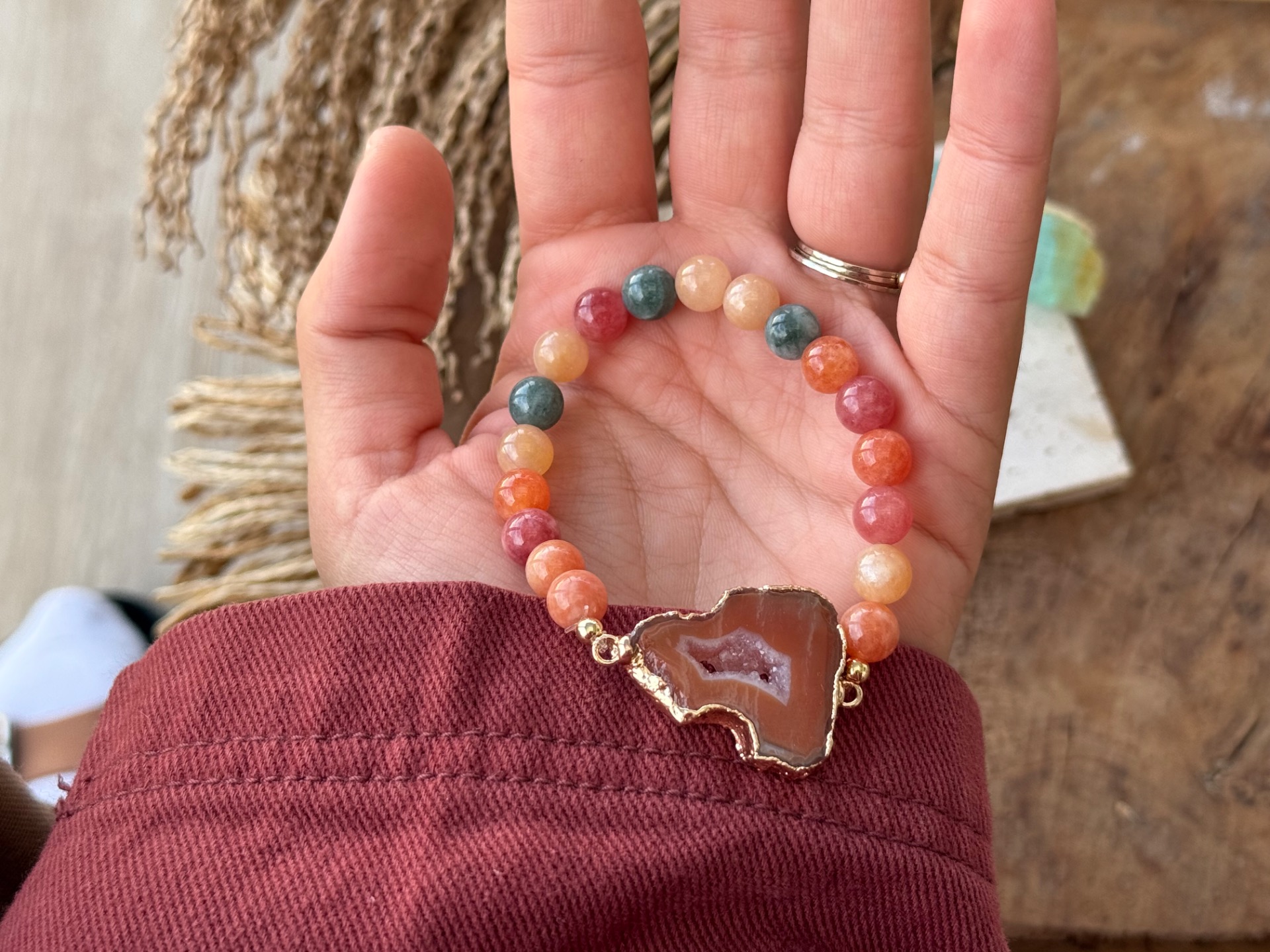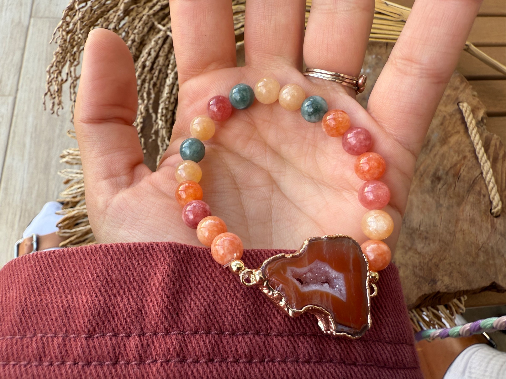 Objavte kúzlo jesene v tomto jedinečnom náramku. Oranžová achátová drúza, doplnená kalcitom v teplých odtieňoch oranžovej, zelenej a žltej, prináša rovnováhu, energiu a pozitívnu náladu. Každý náramok je unikátny – jediný kus, ktorý nemá svoj ekvivalent.