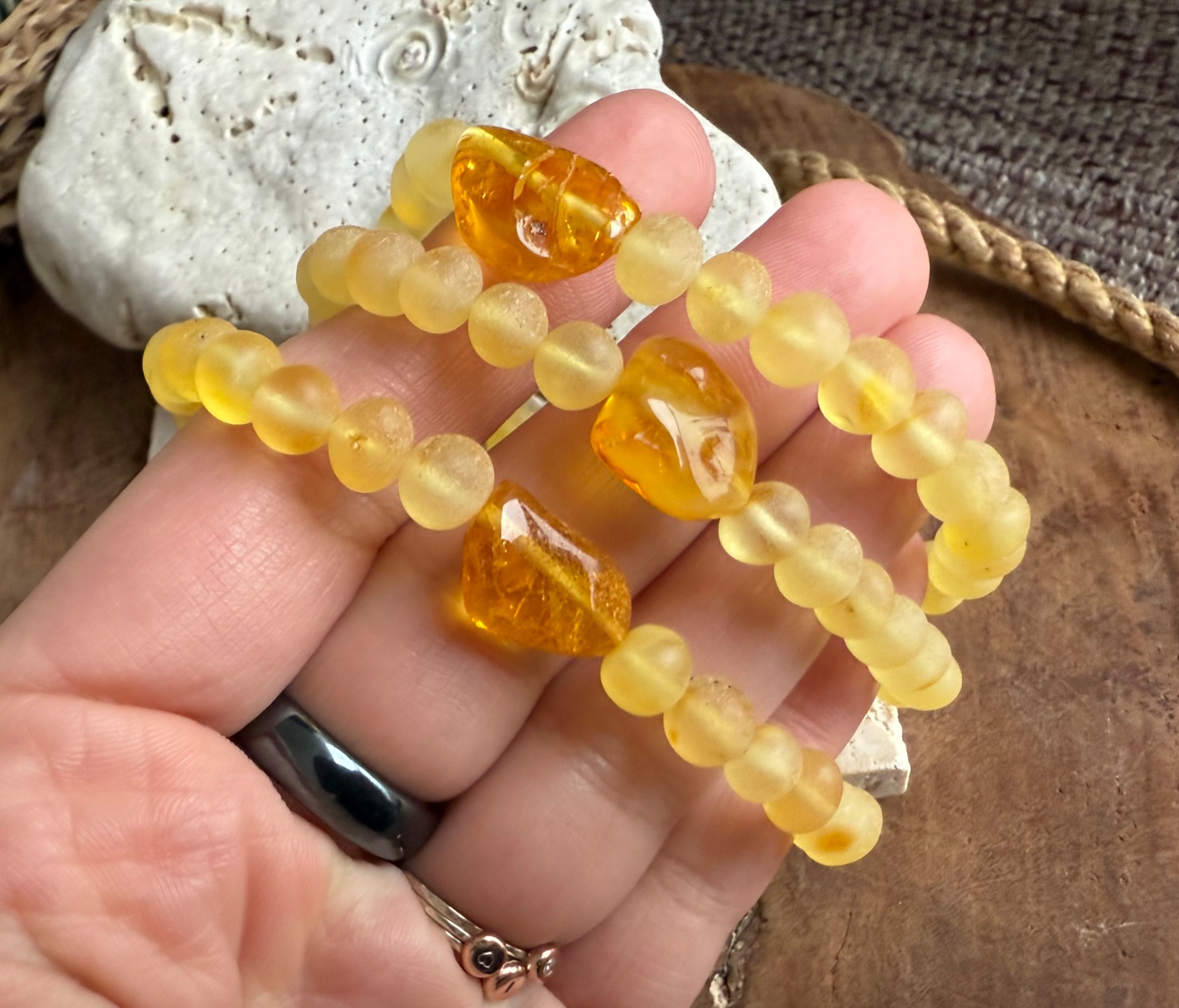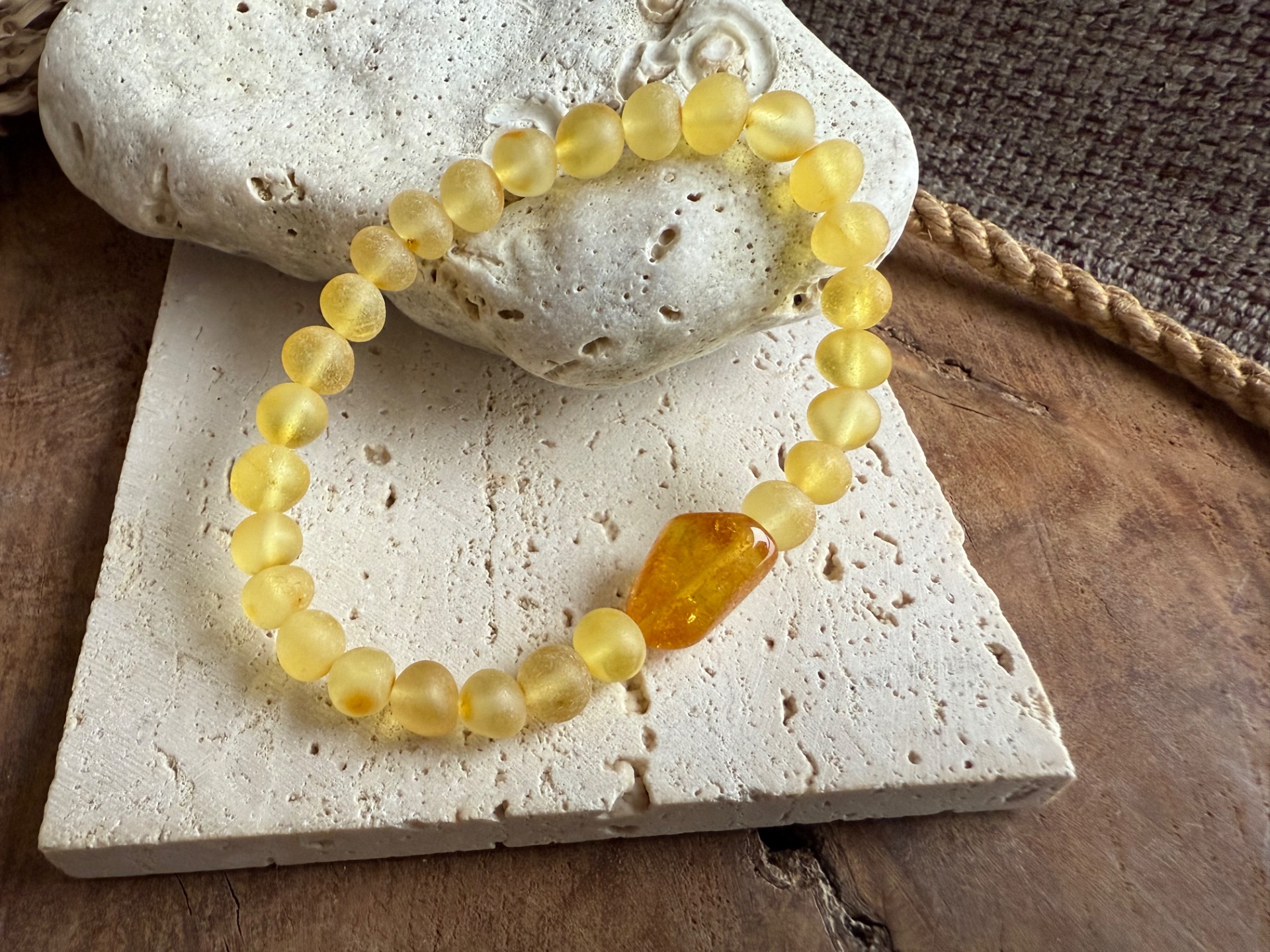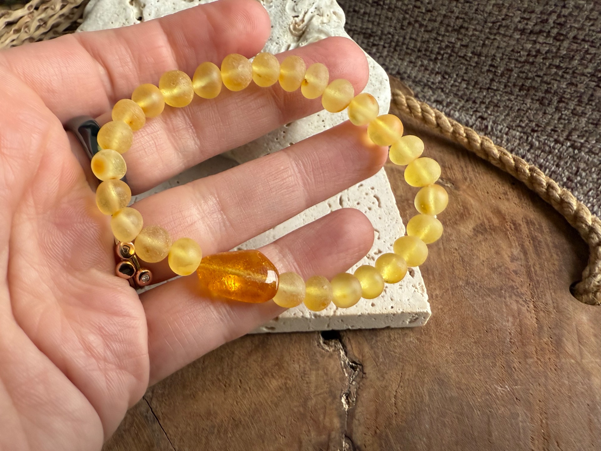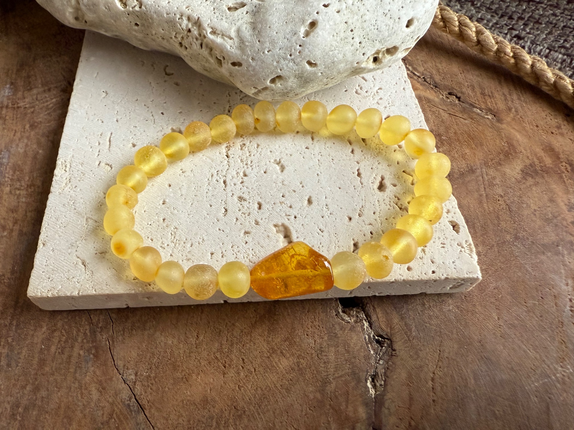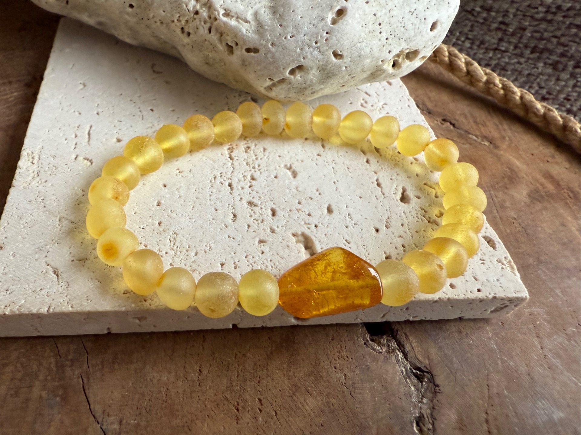 Tento výnimočný jantárový náramok z pravého baltického jantáru v sebe spája jemnú krásu matných korálok a dominantný leštený stredový kameň, ktorý žiari teplým zlatým svetlom ako zachytené slnko.