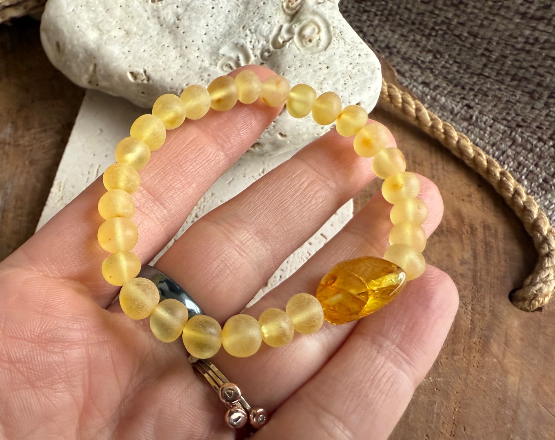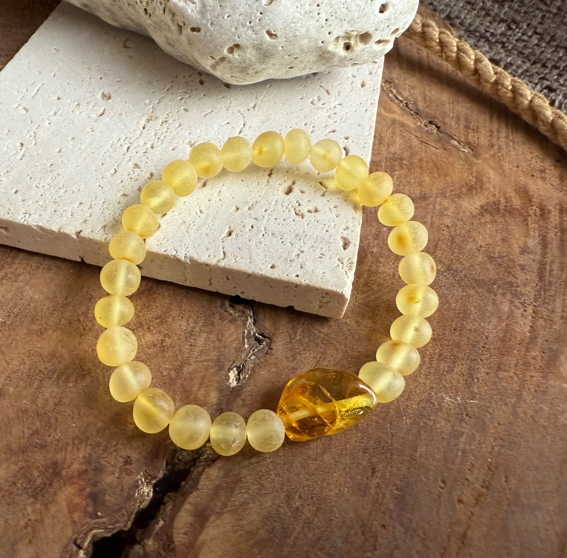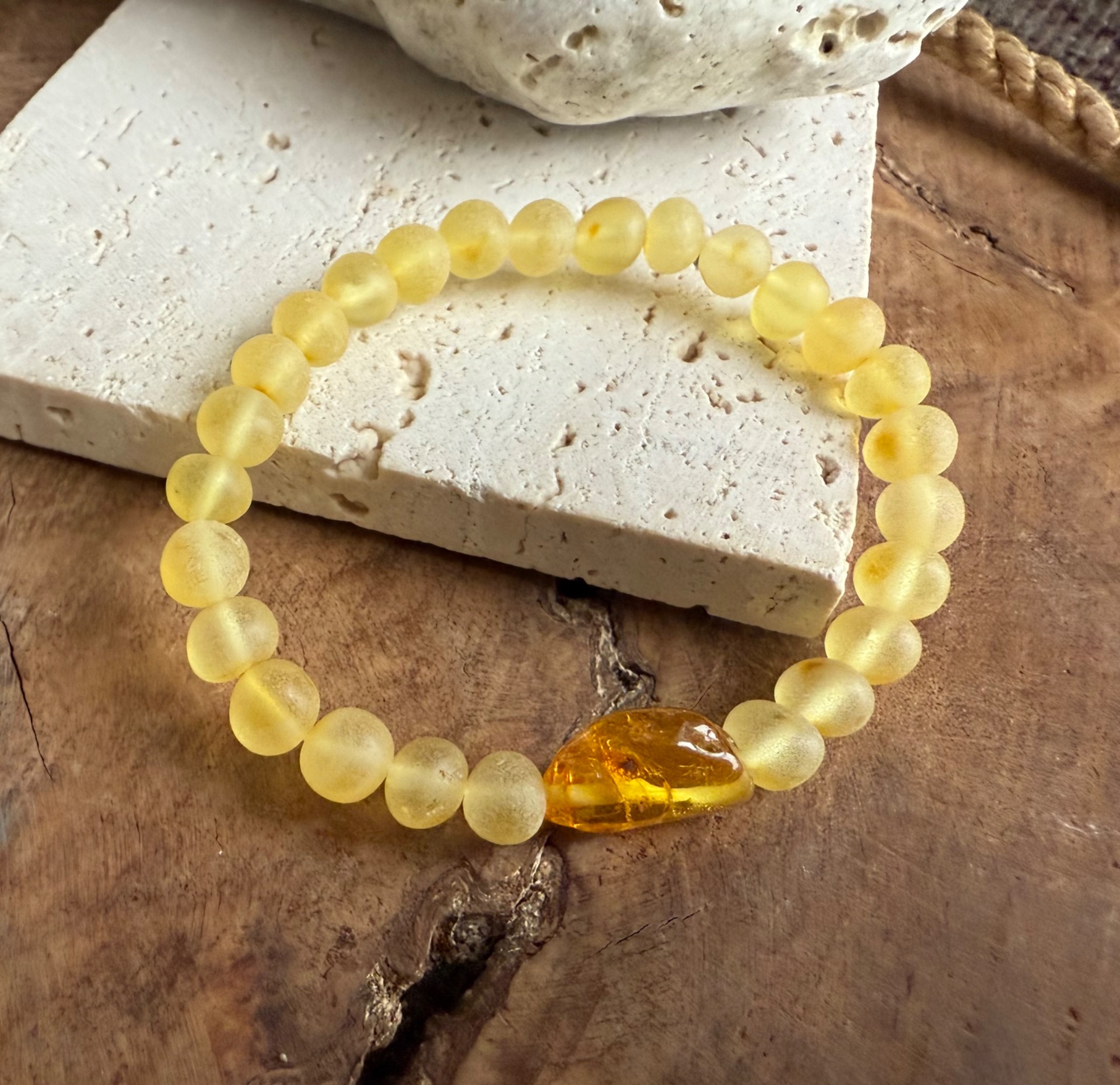 Tento výnimočný jantárový náramok z pravého baltického jantáru v sebe spája jemnú krásu matných korálok a dominantný leštený stredový kameň, ktorý žiari teplým zlatým svetlom ako zachytené slnko.