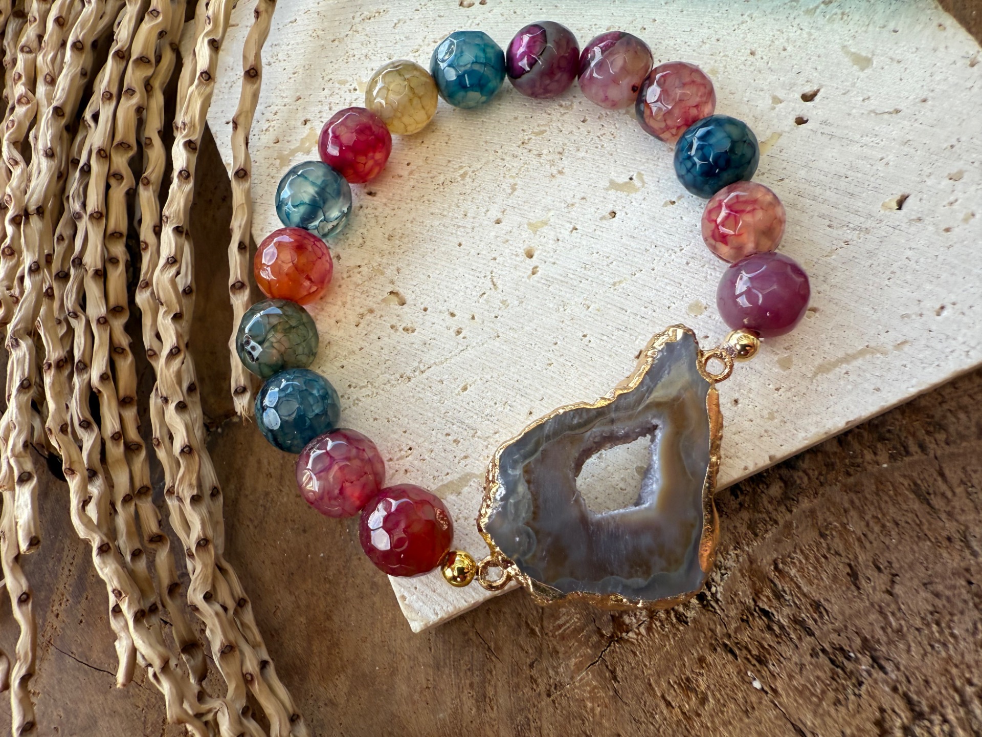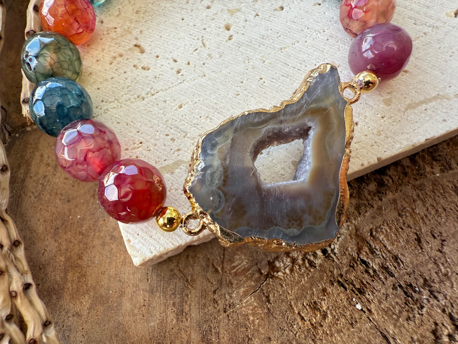 Kombinácia pestrofarebného achátu vo facetovanom výbruse a achátovej drúzy v hnedých tónoch vytvára energiu radosti, hravosti a vnútornej stability.