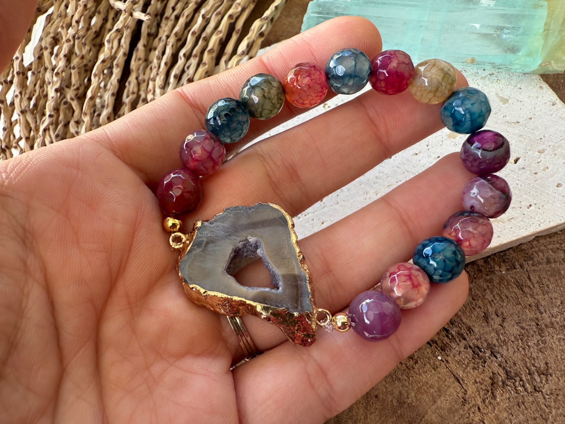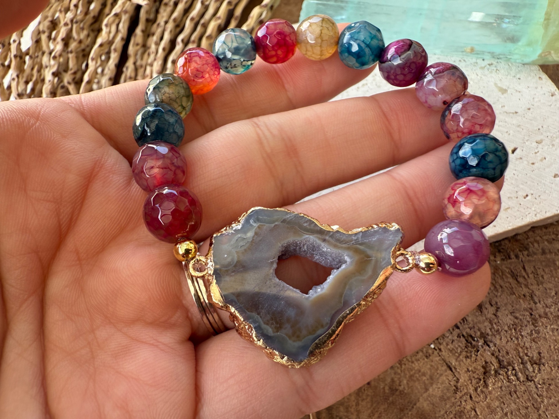 Pestrý achát – kameň, ktorý prináša do života farebnosť, optimizmus a ľahkosť. Dofarbovanie zvýrazňuje jeho jasné tóny, zatiaľ čo facetovaný výbrus umožňuje, aby sa každý lúč svetla krásne odrážal. Achát pomáha vyrovnávať emócie a prináša harmóniu do každodenného života.