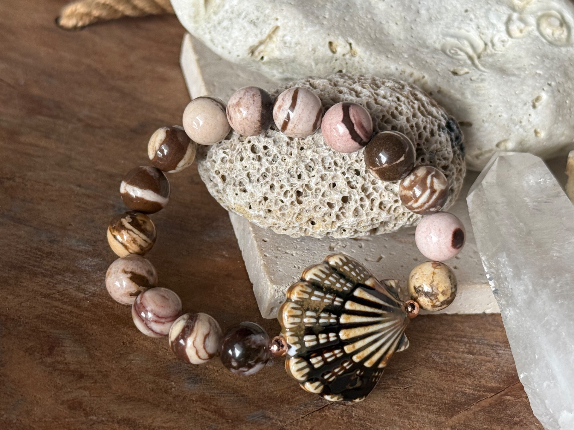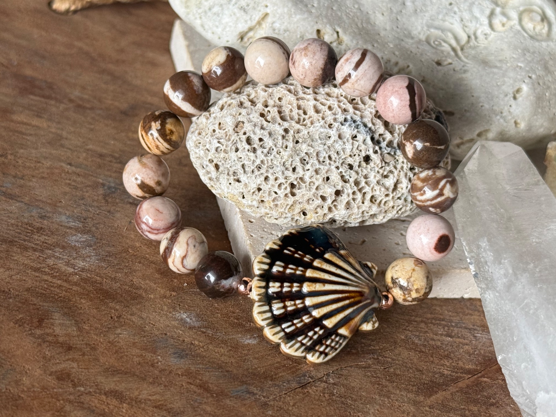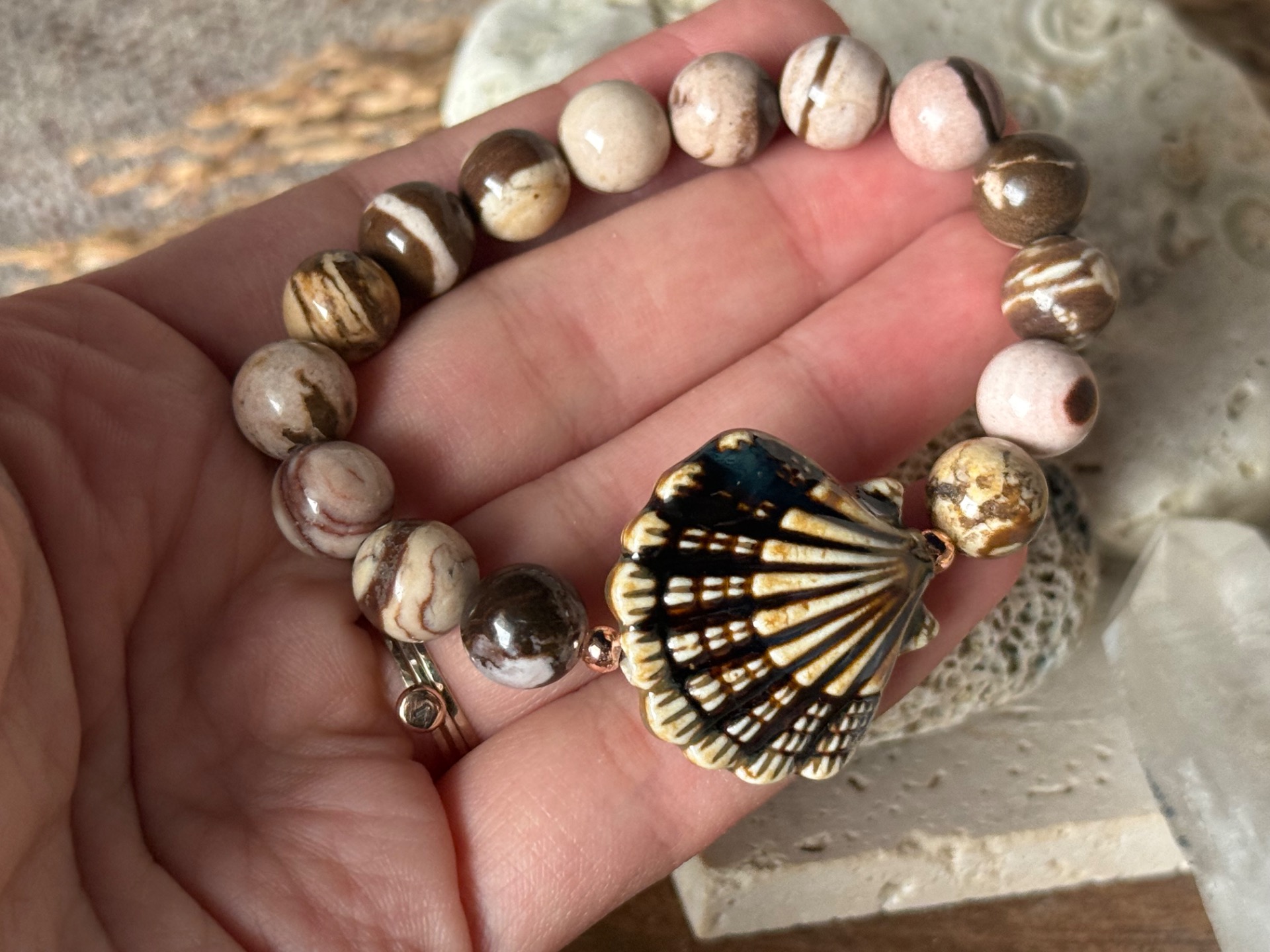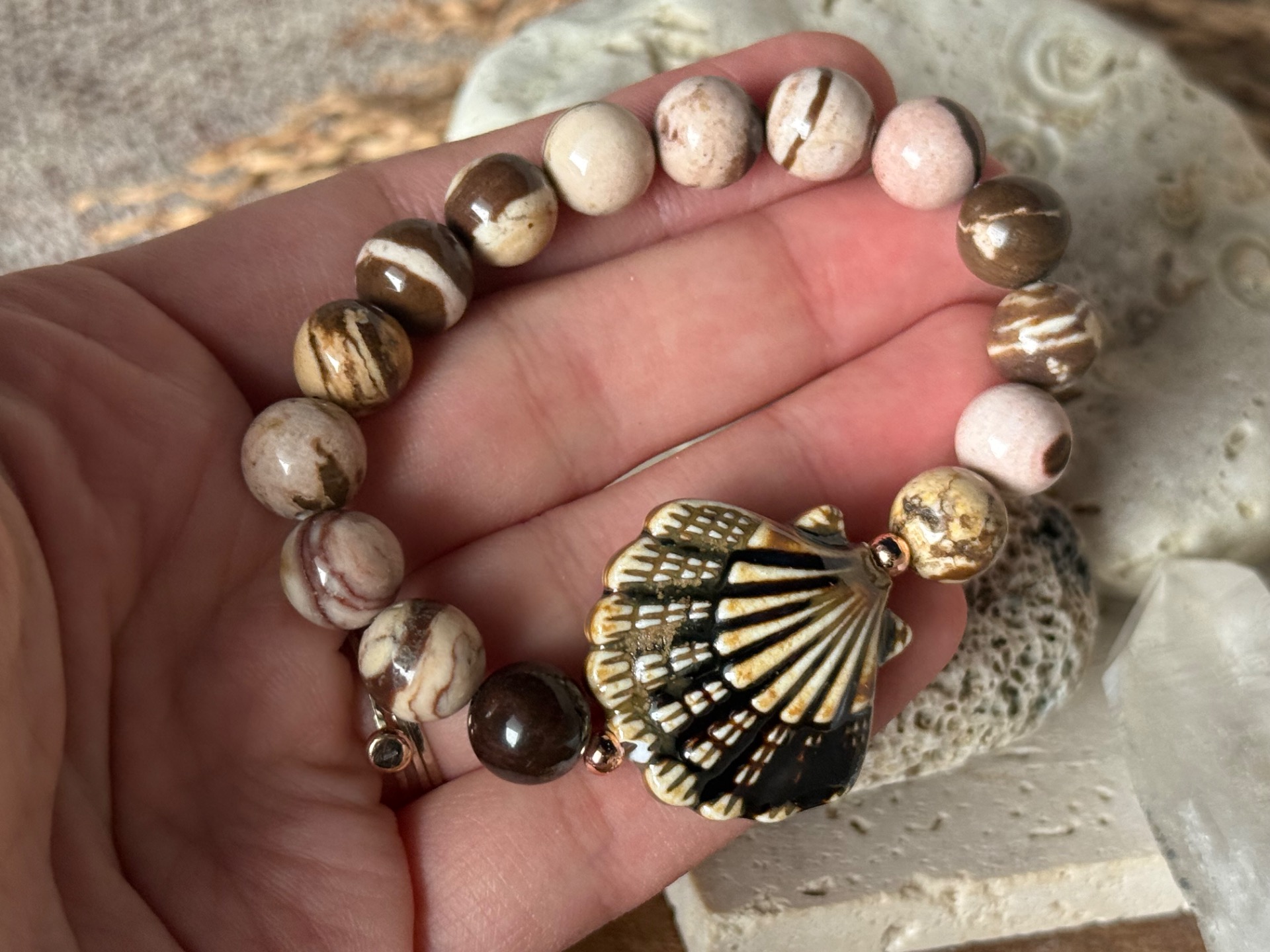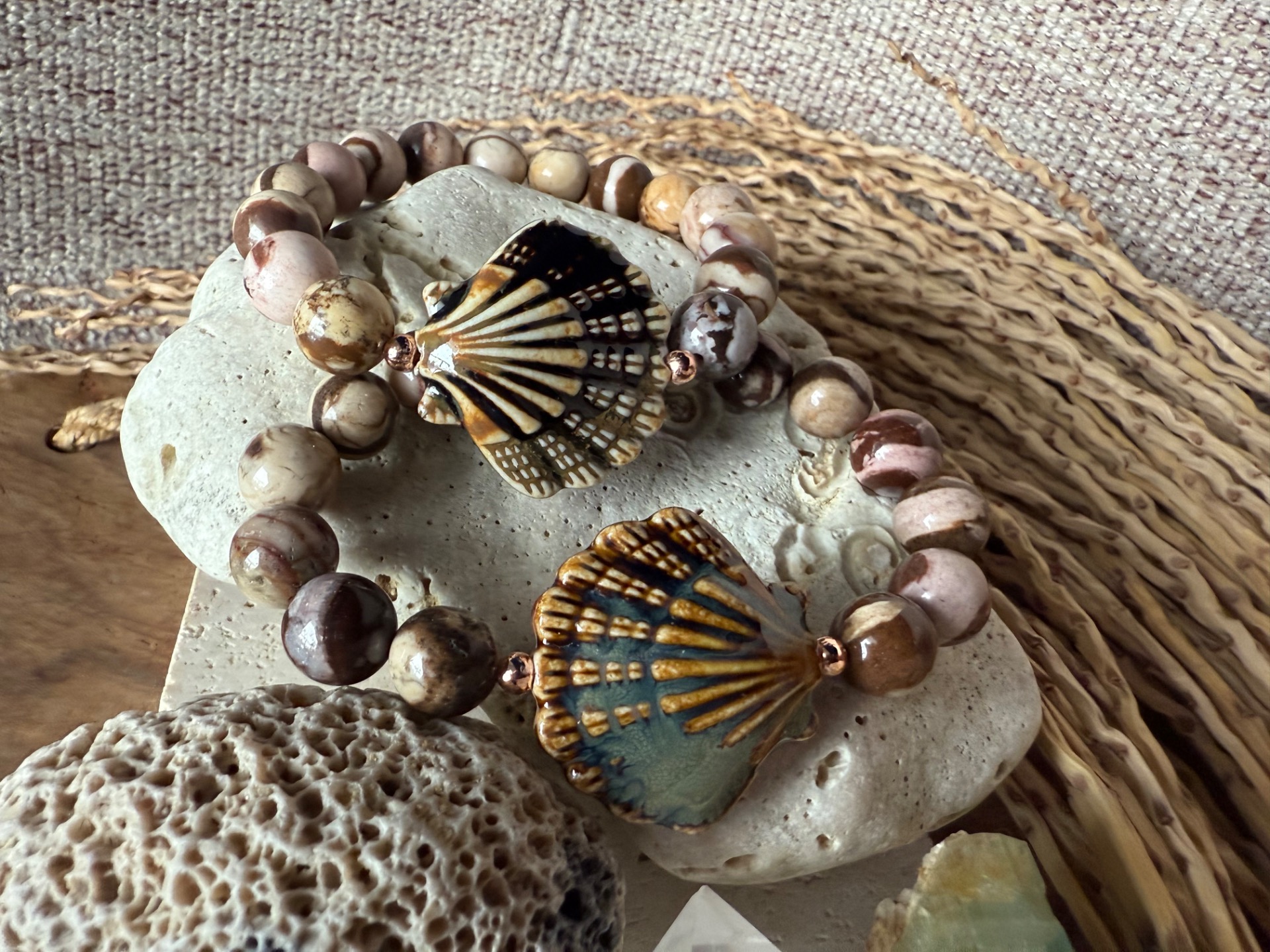 Náramok je doplnený porcelánovou mušľou v podobných prírodných tónoch, ktorá vnáša do šperku jemnosť, ženskosť a symboliku ochrany. Spolu vytvárajú harmonický celok, ktorý pôsobí pokojne, prirodzene a nadčasovo.