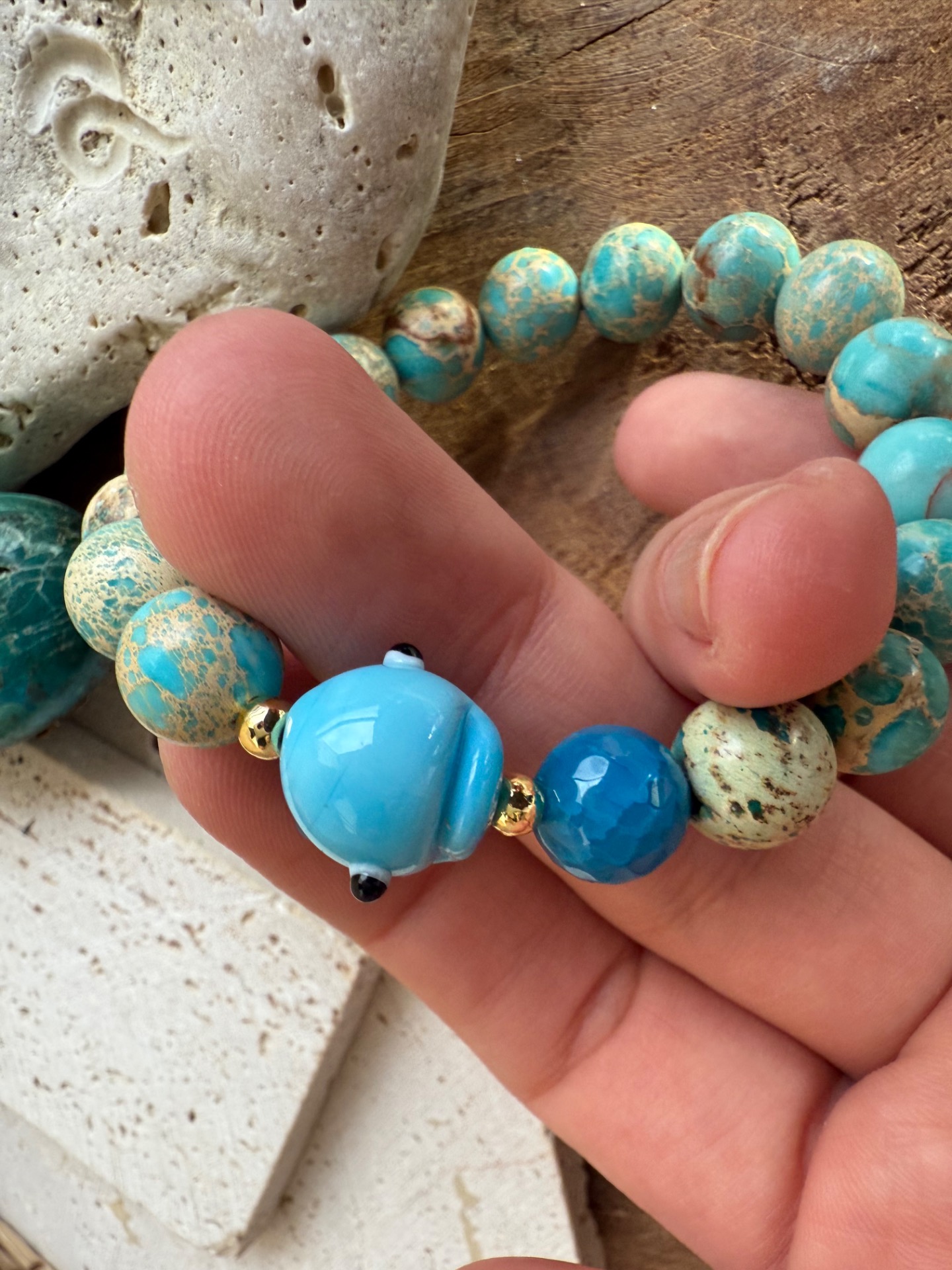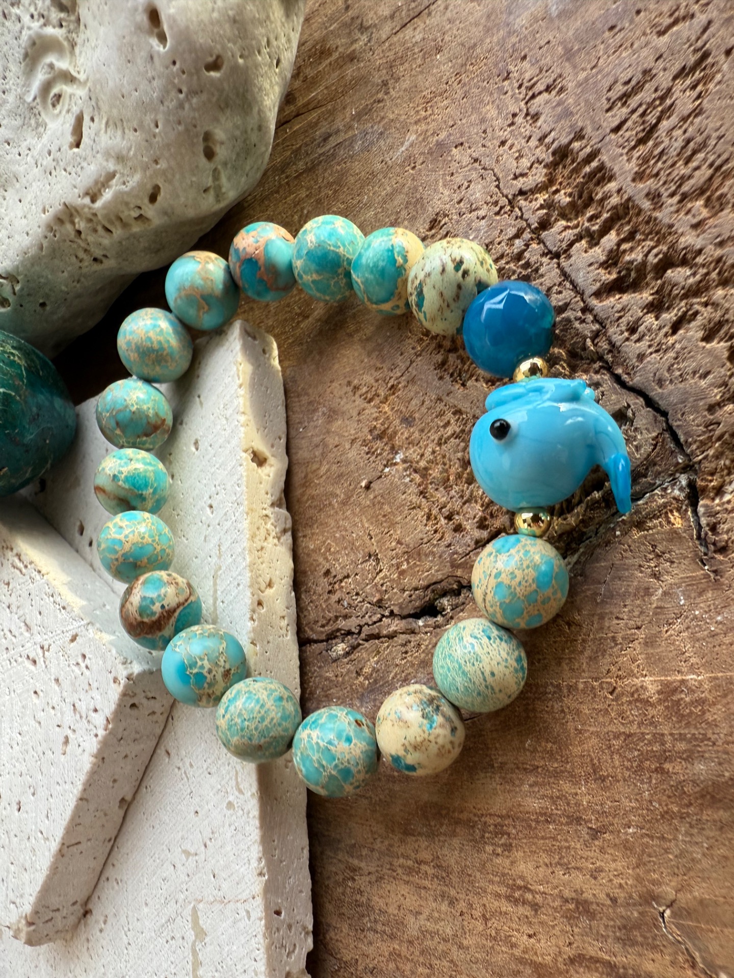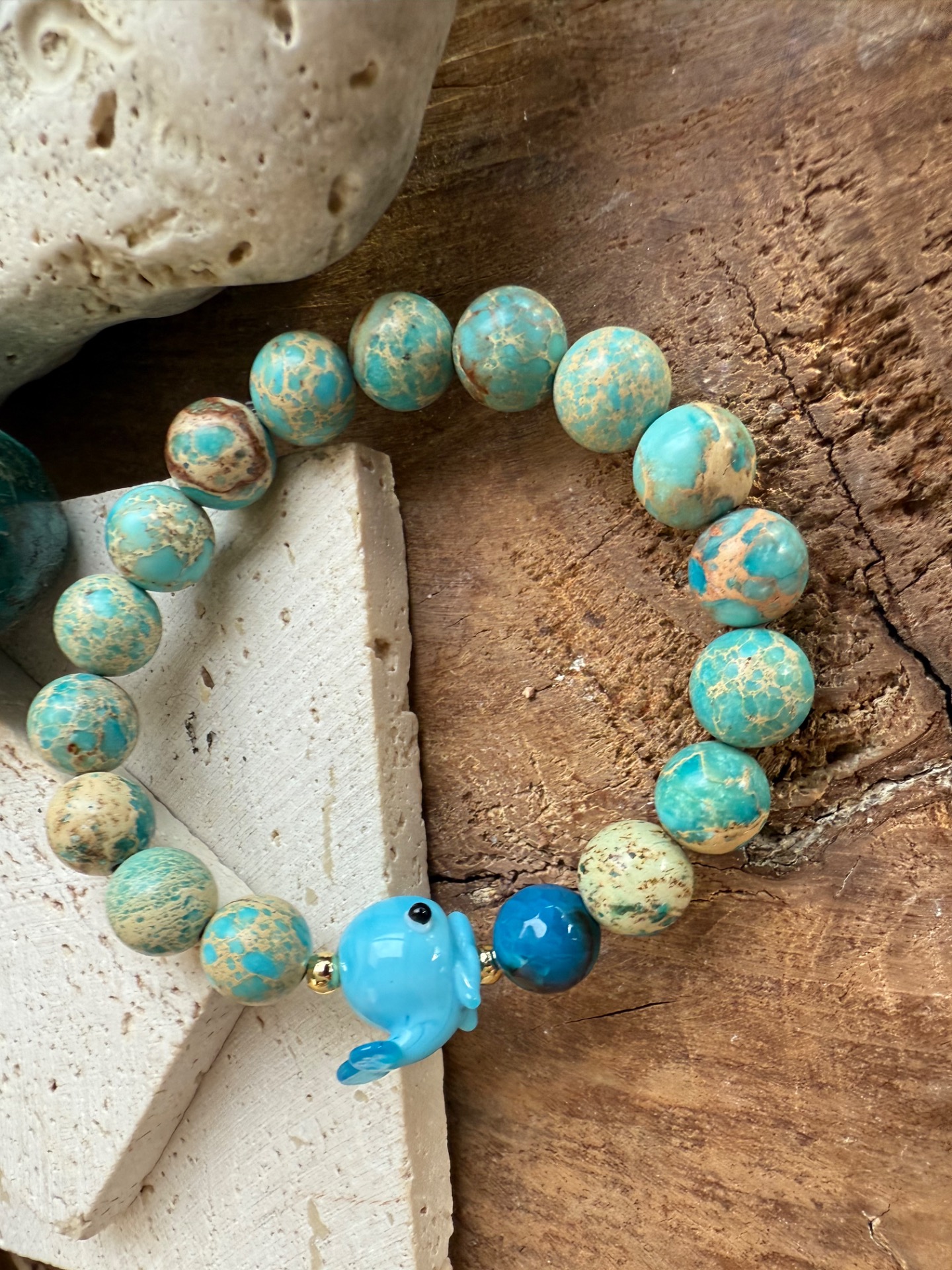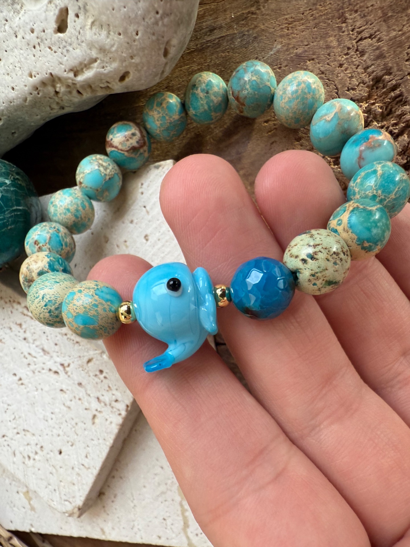Niekedy stačí jediný detail a úsmev sa objaví sám. Tento náramok z tyrkysového regalitu so sklenenou veľrybkou v sebe nesie ľahkosť oceánu, hravosť vody a tichú silu hlbín.