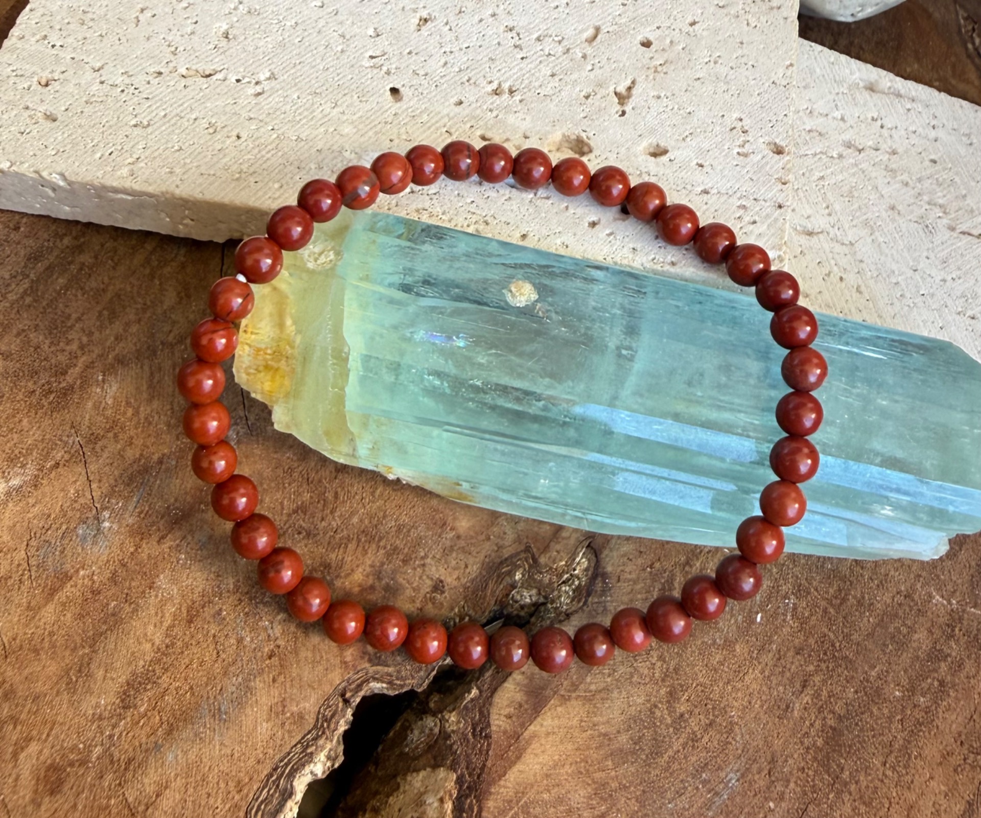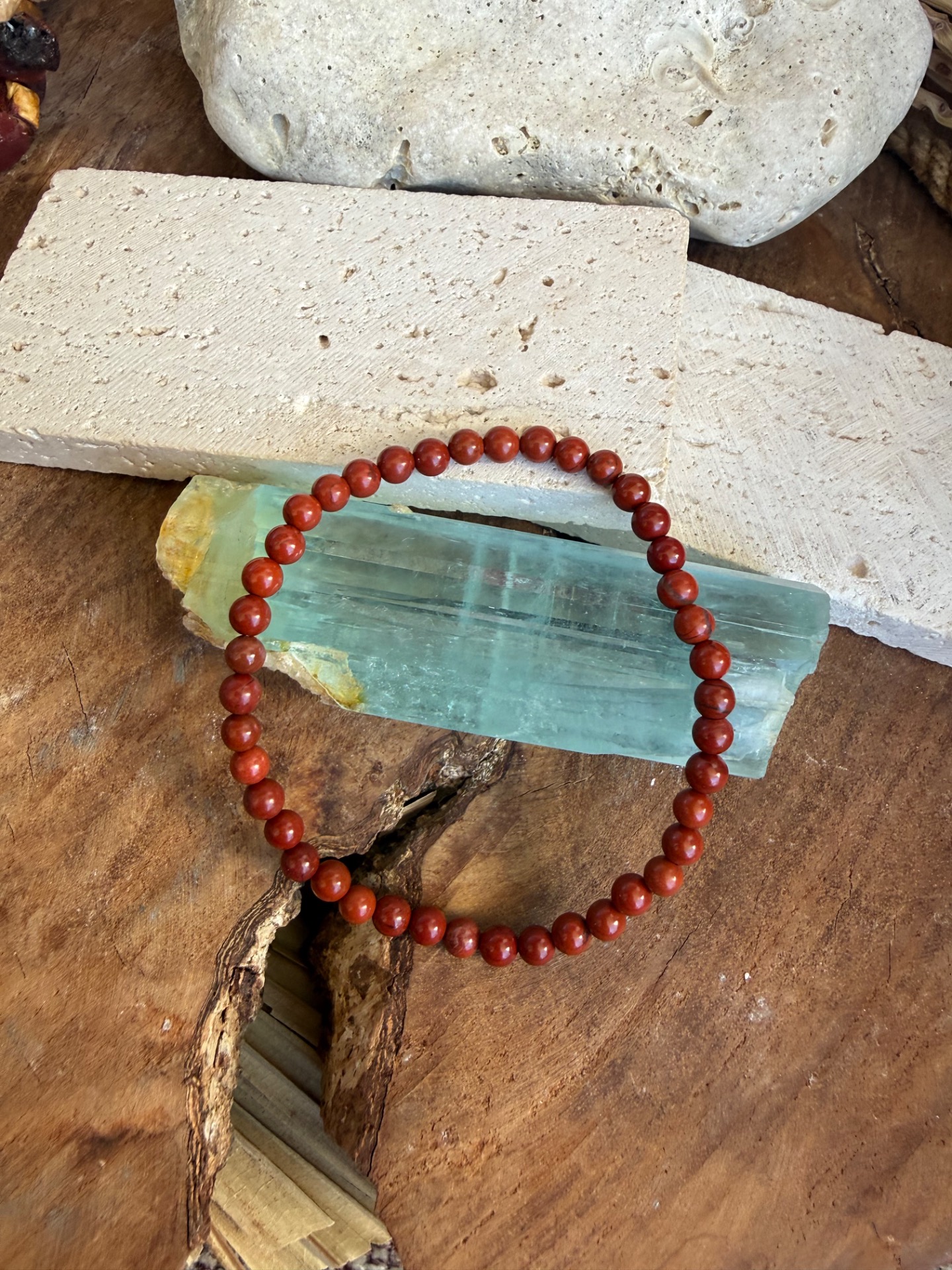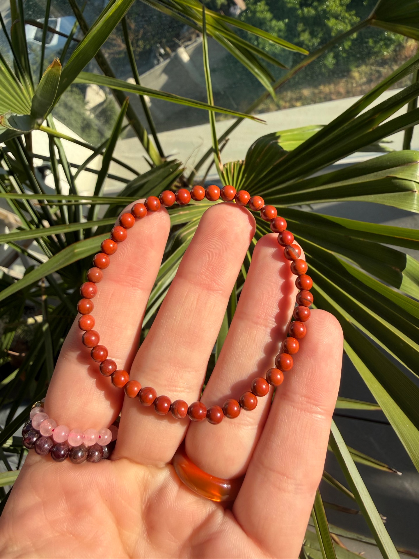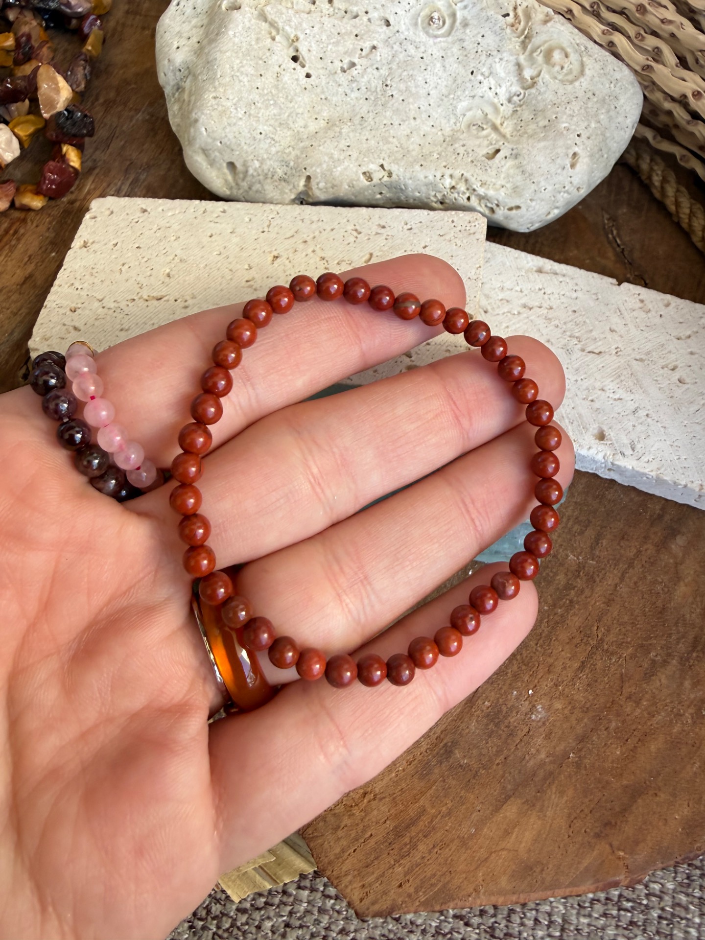 Tento jemný náramok z prírodného červeného jaspisu je jednoduchý, minimalistický šperk z drobných 4 mm korálok v teplých zemitých červenohnedých tónoch. Pôsobí prirodzene, stabilne a veľmi "uzemňujúco", vďaka čomu je ideálny na každodenné nosenie.