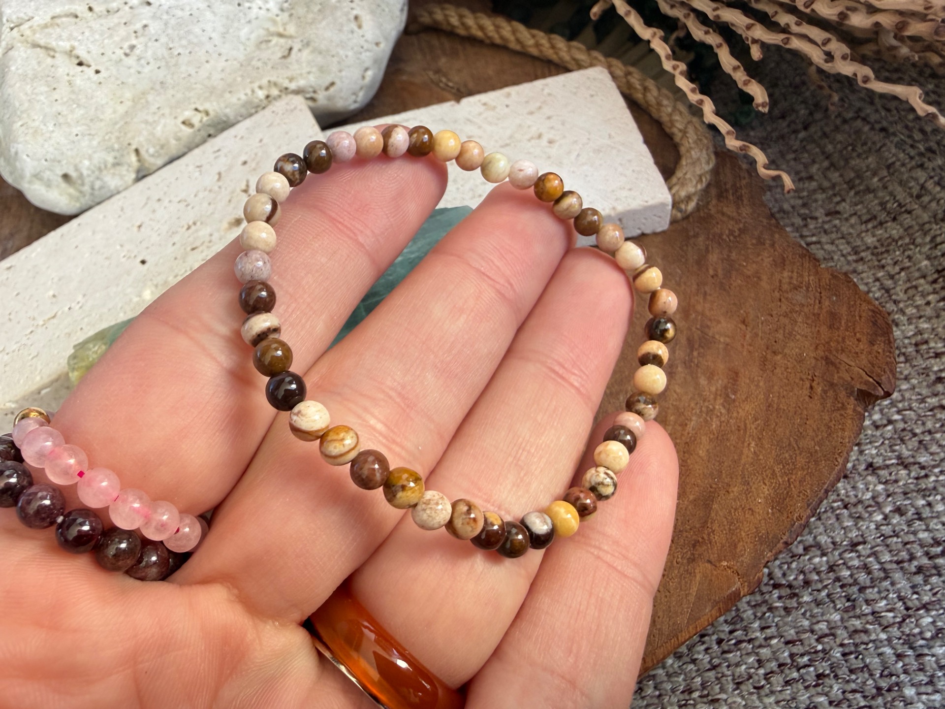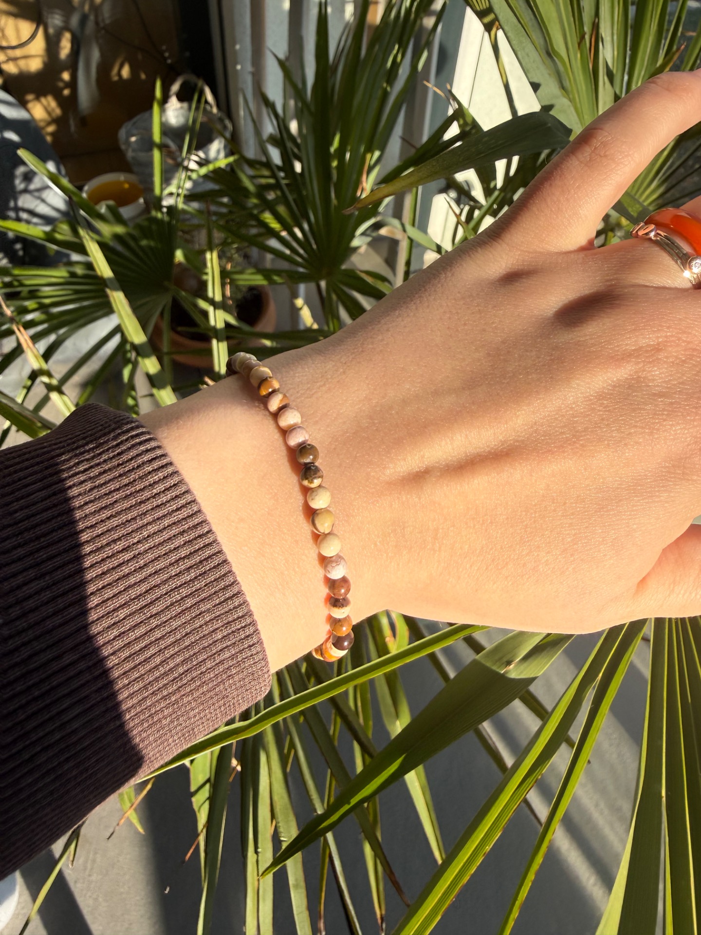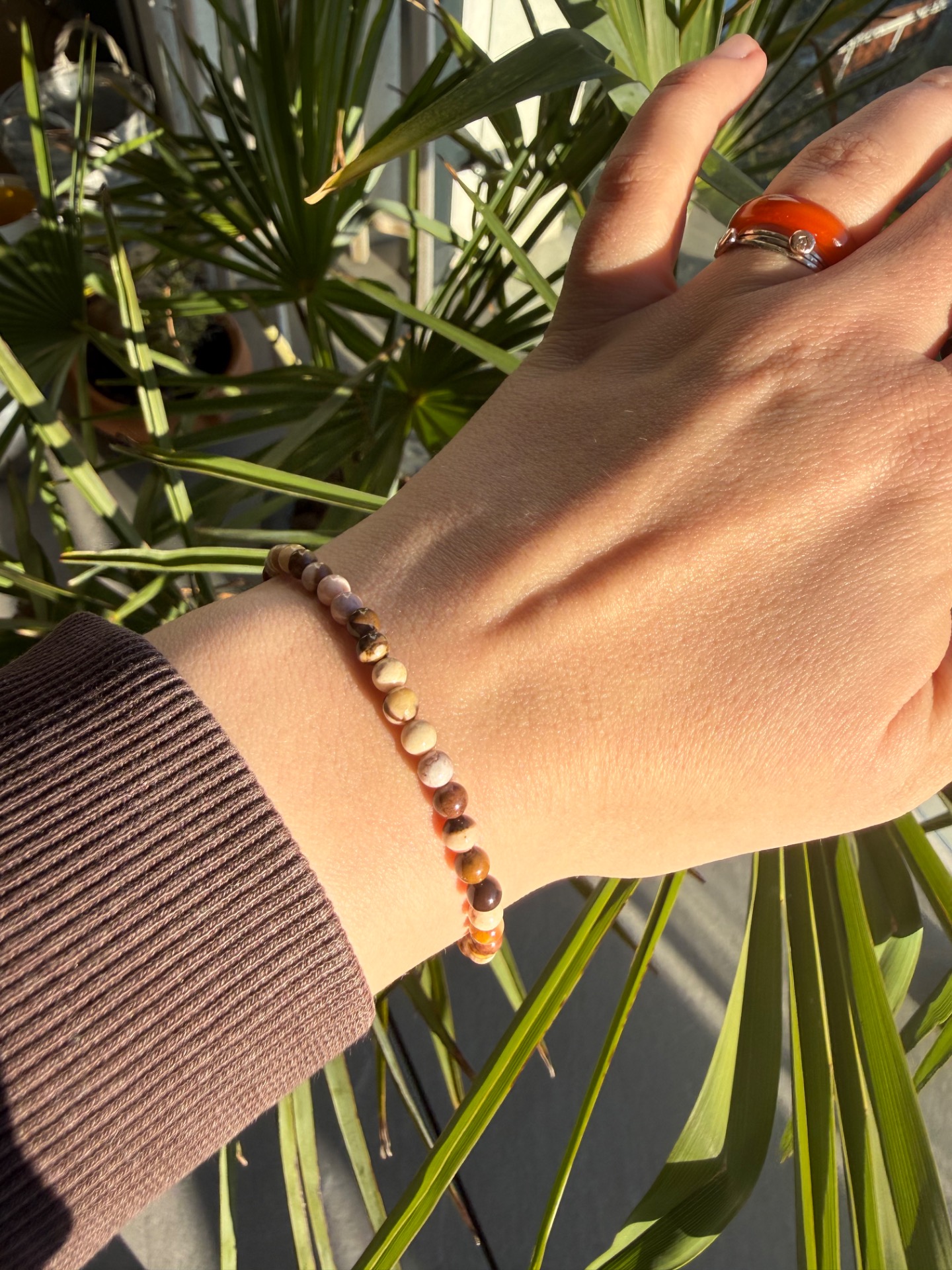 Tento jemný náramok z jaspisu Kalahari je minimalistický šperk z drobných 4 mm korálok v krásnych kakaových, zemitých odtieňoch. Pôsobí prirodzene, teplo a veľmi stabilne – ako kúsok púštnej krajiny prenesený do šperku.