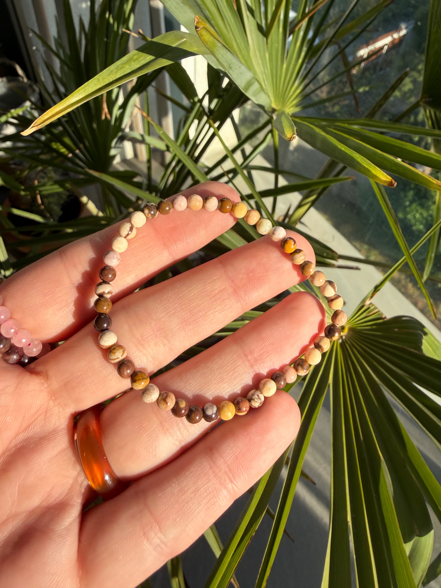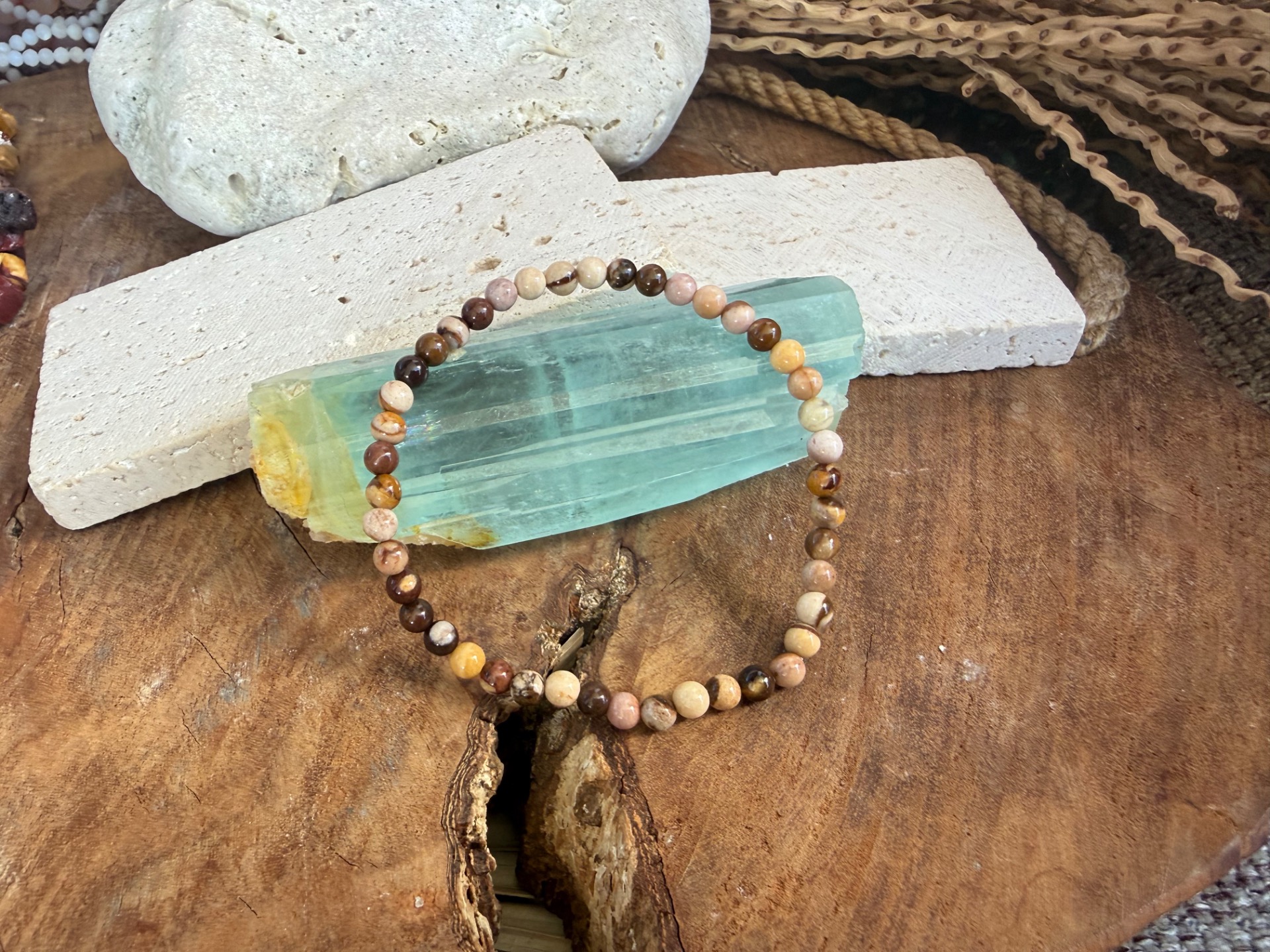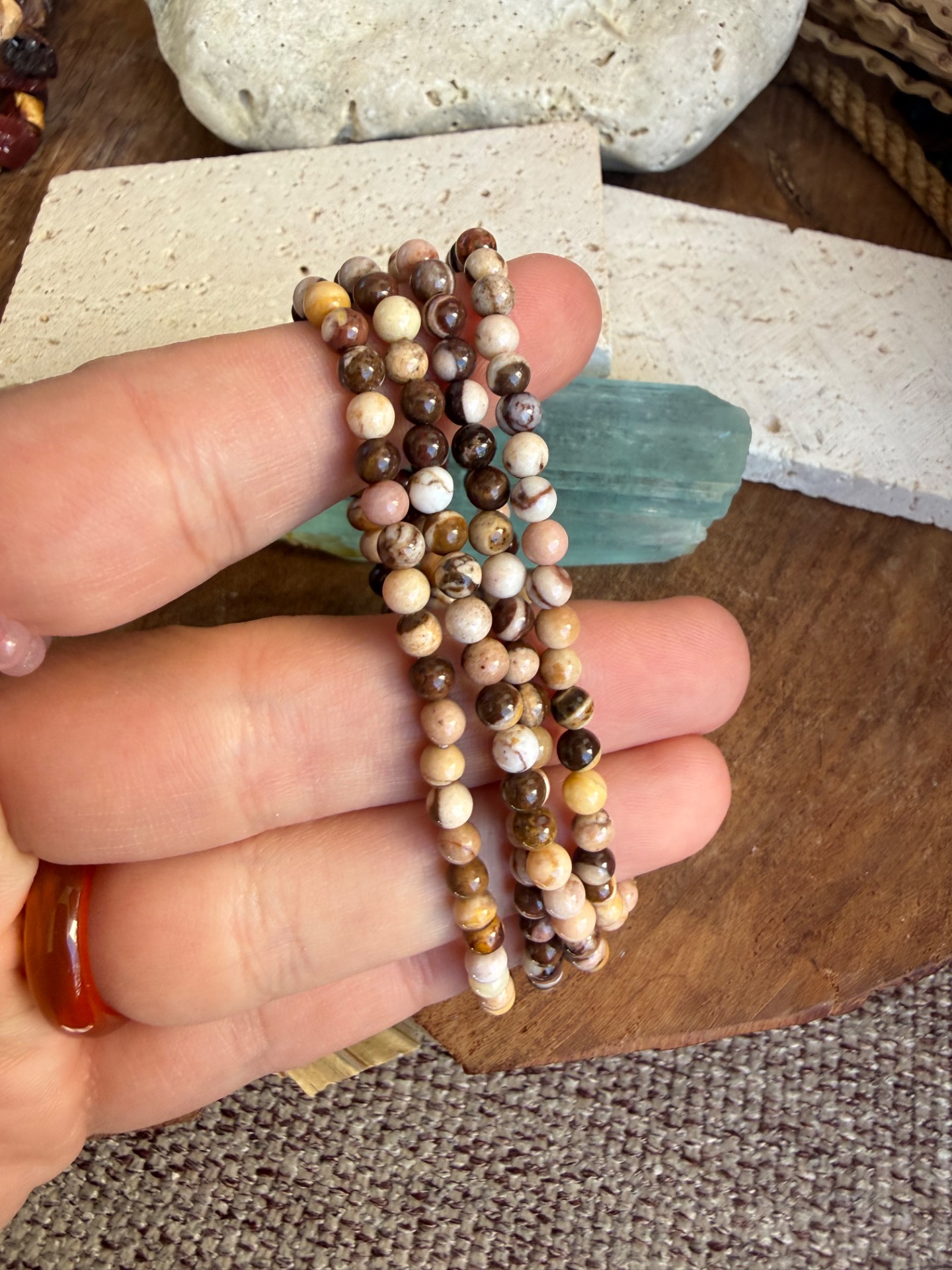 Tento jemný náramok z jaspisu Kalahari je minimalistický šperk z drobných 4 mm korálok v krásnych kakaových, zemitých odtieňoch. Pôsobí prirodzene, teplo a veľmi stabilne – ako kúsok púštnej krajiny prenesený do šperku.