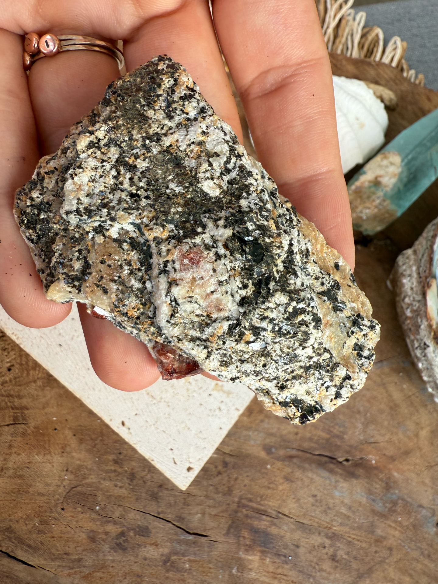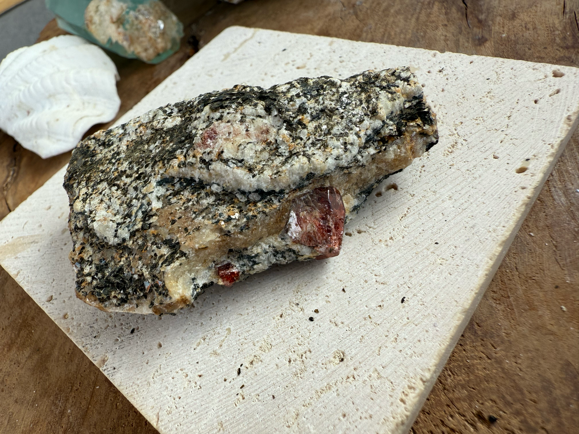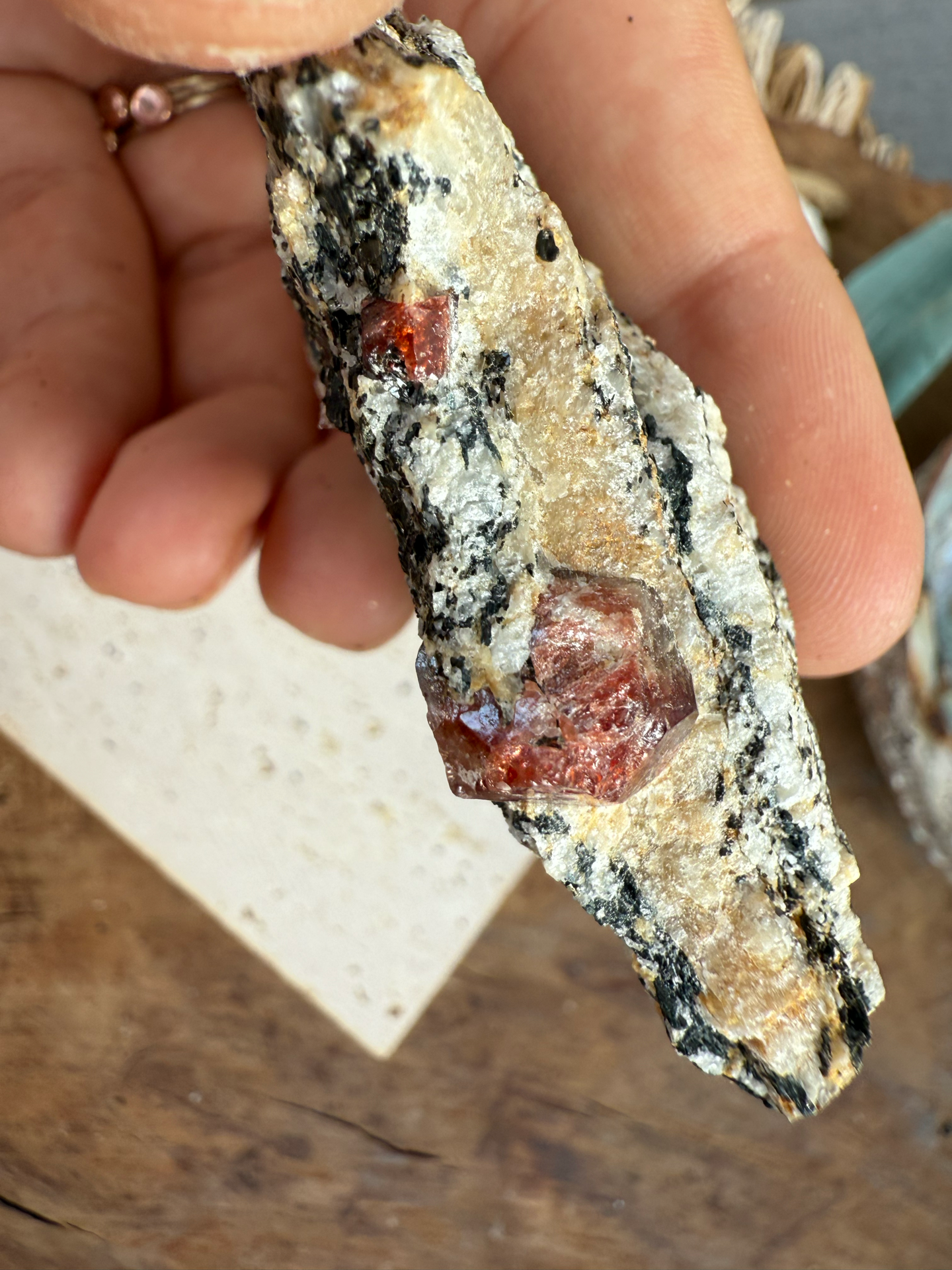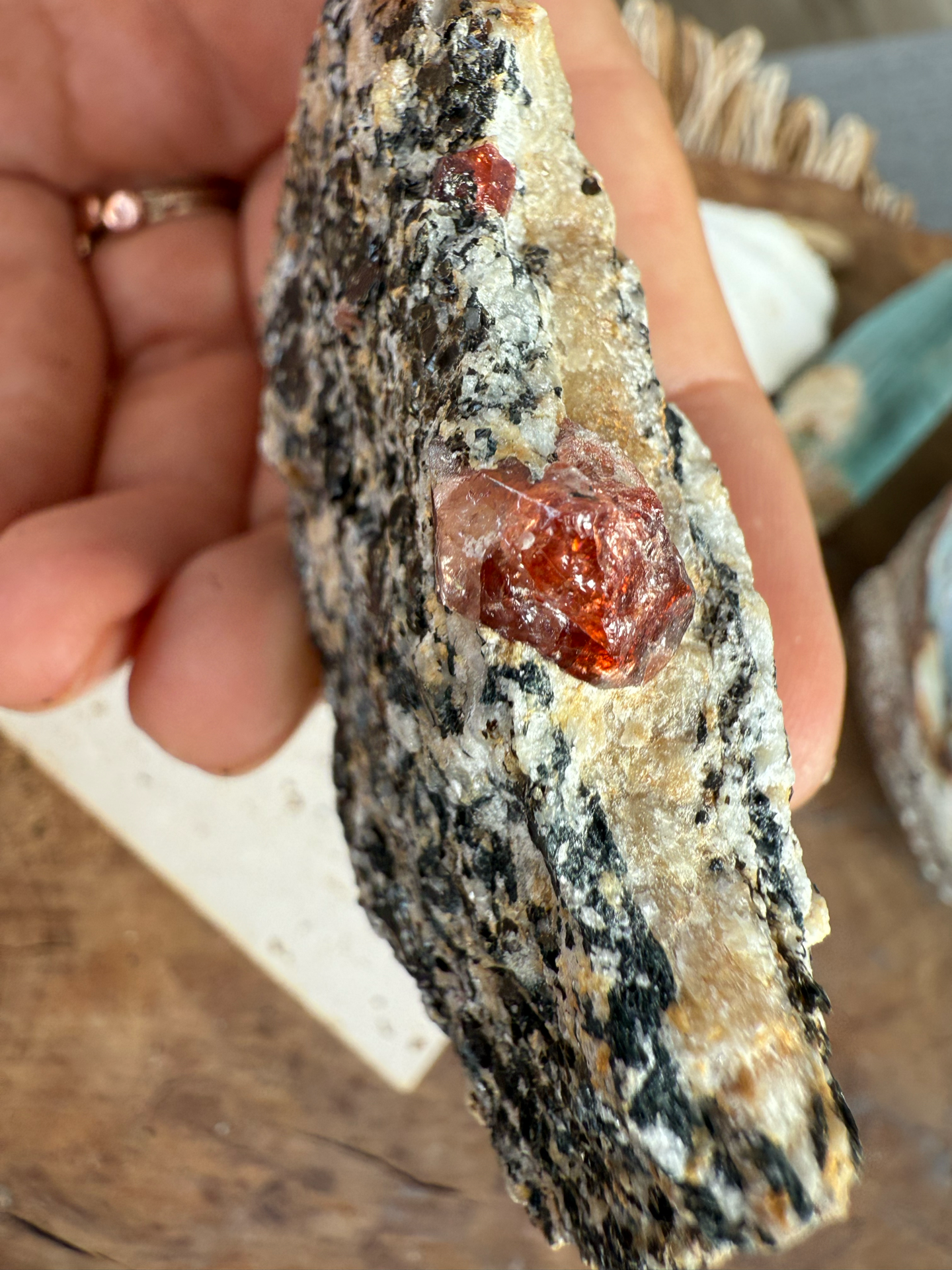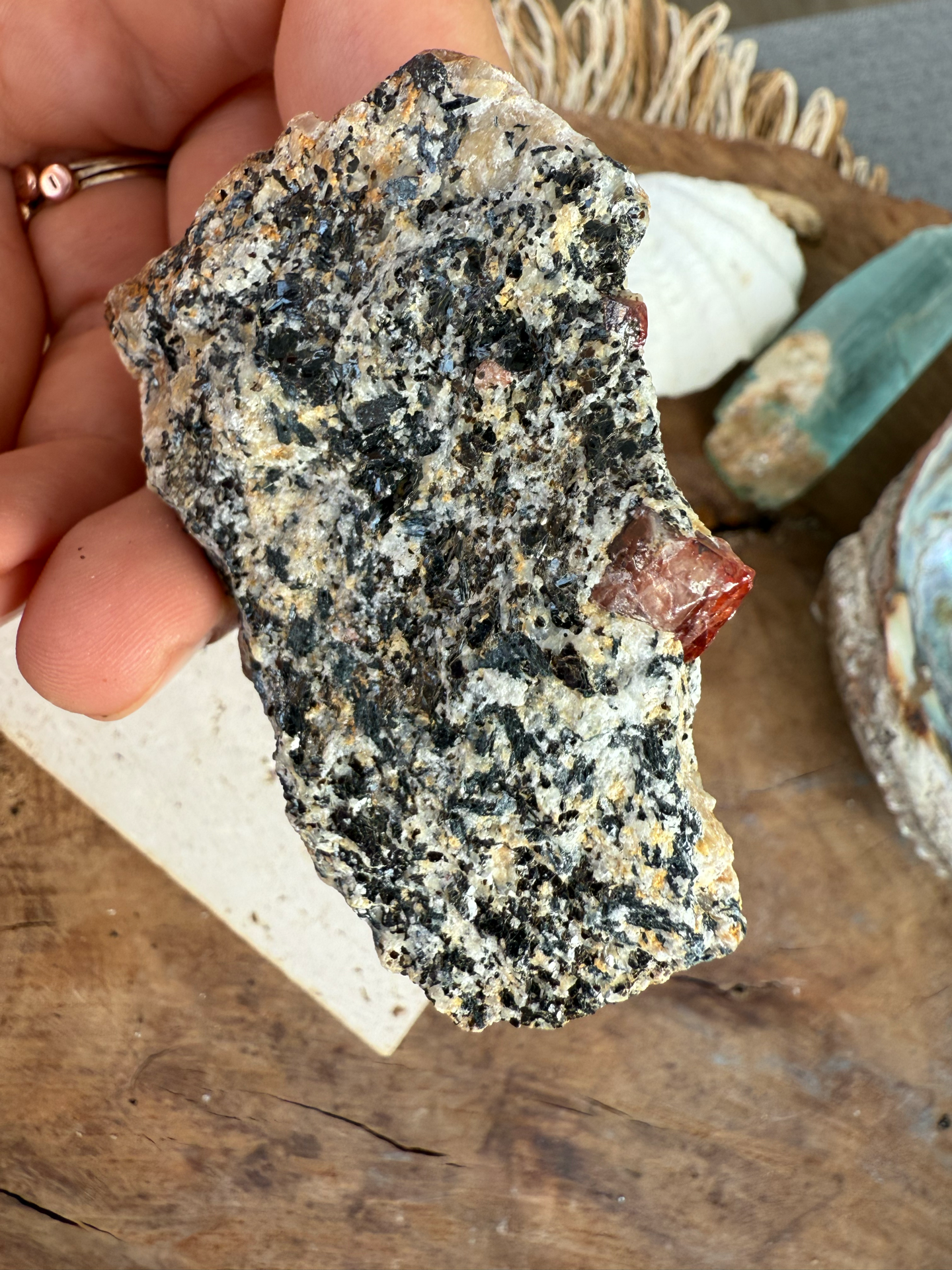 Jeho sýte červeno-krvavé odtiene žiaria v kontraste s horninou, z ktorej sa zrodil. Tento minerál v matrici pôsobí mimoriadne surovo, silno a pravdivo – ako by v sebe niesol samotný dych Zeme.