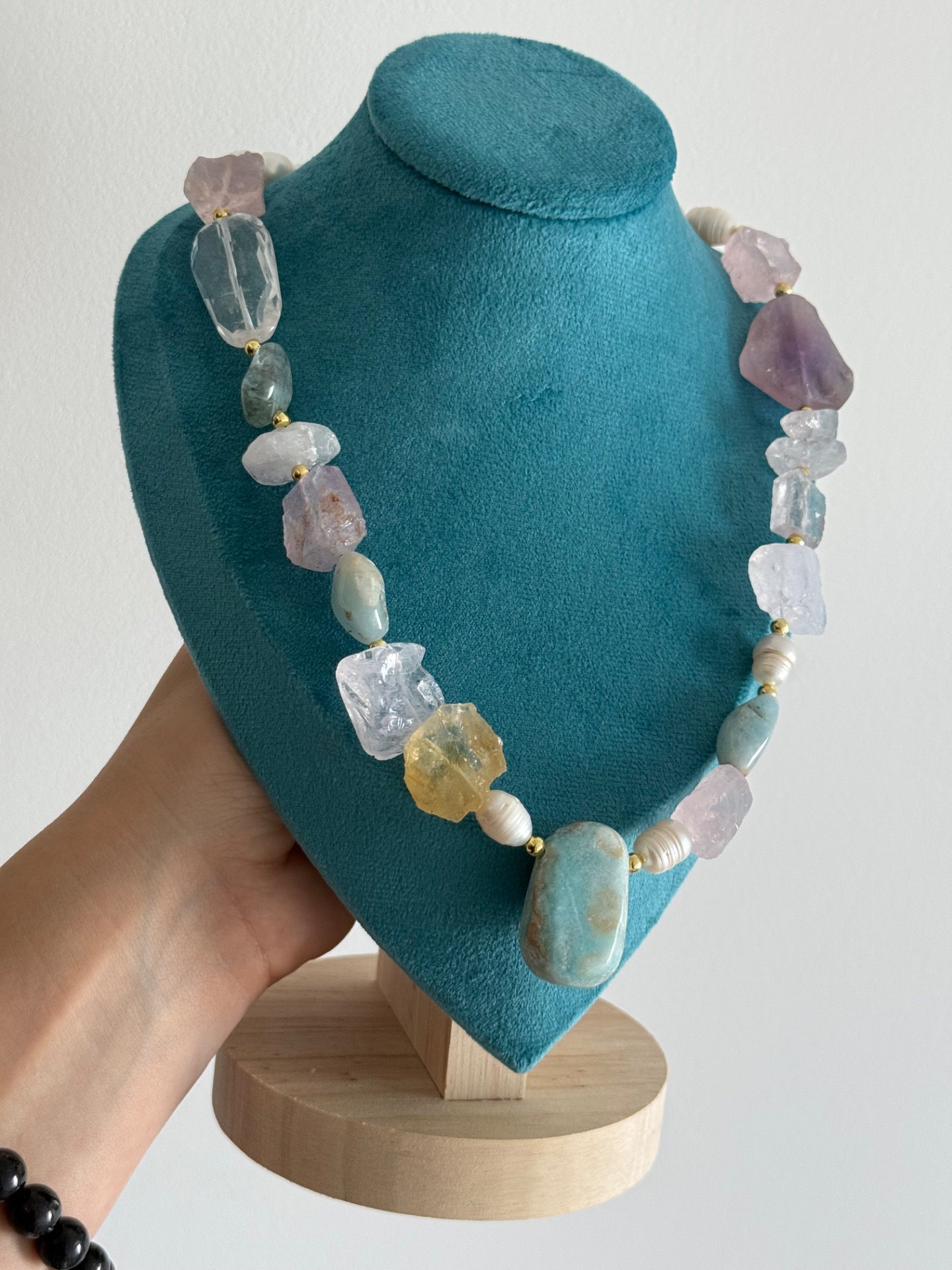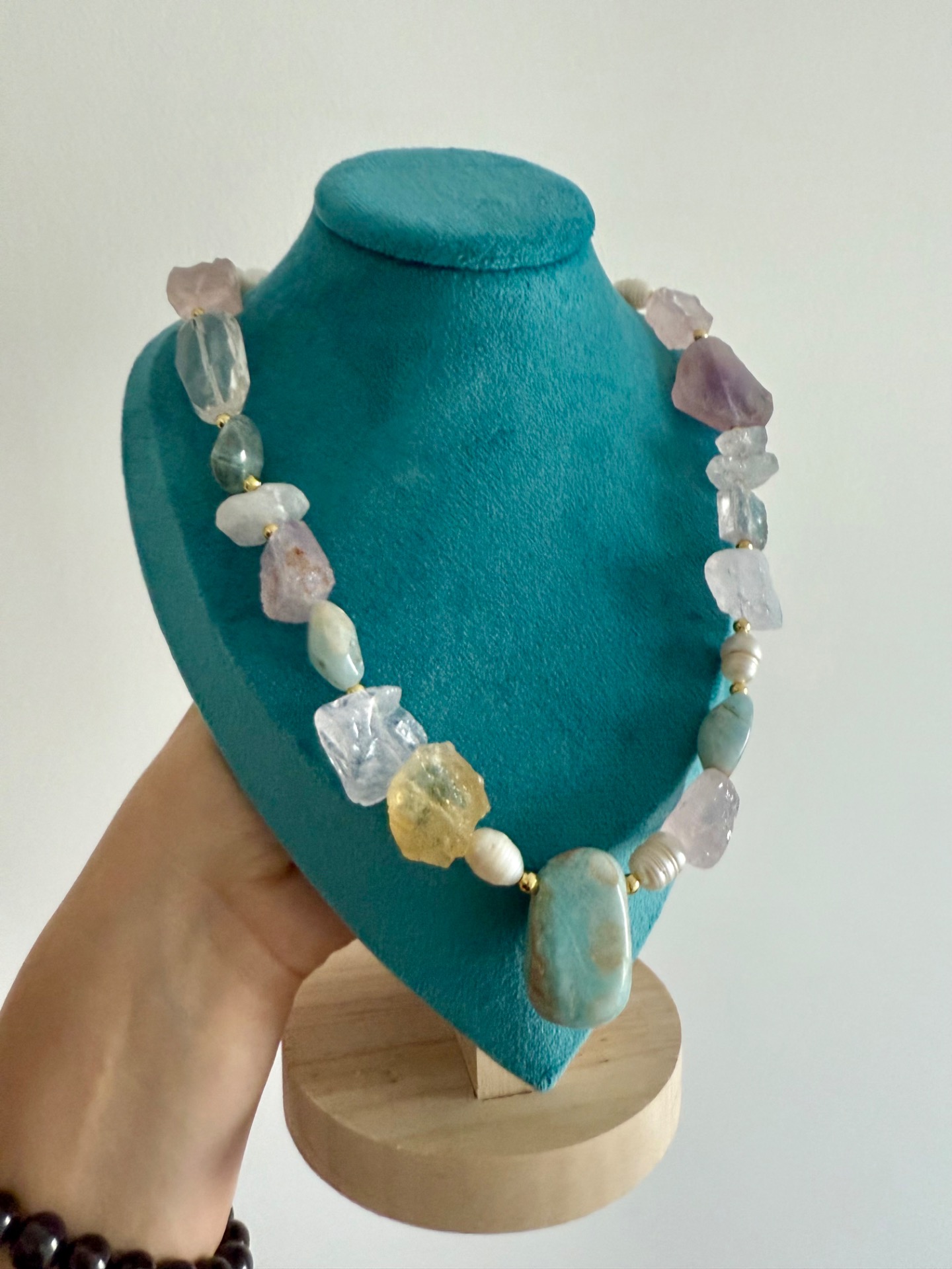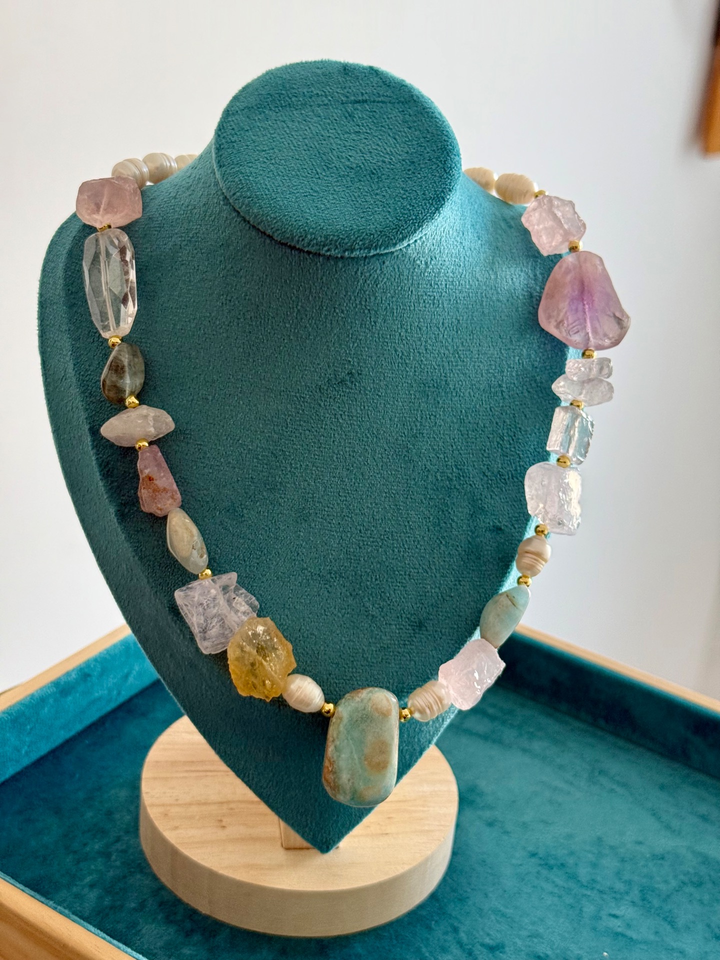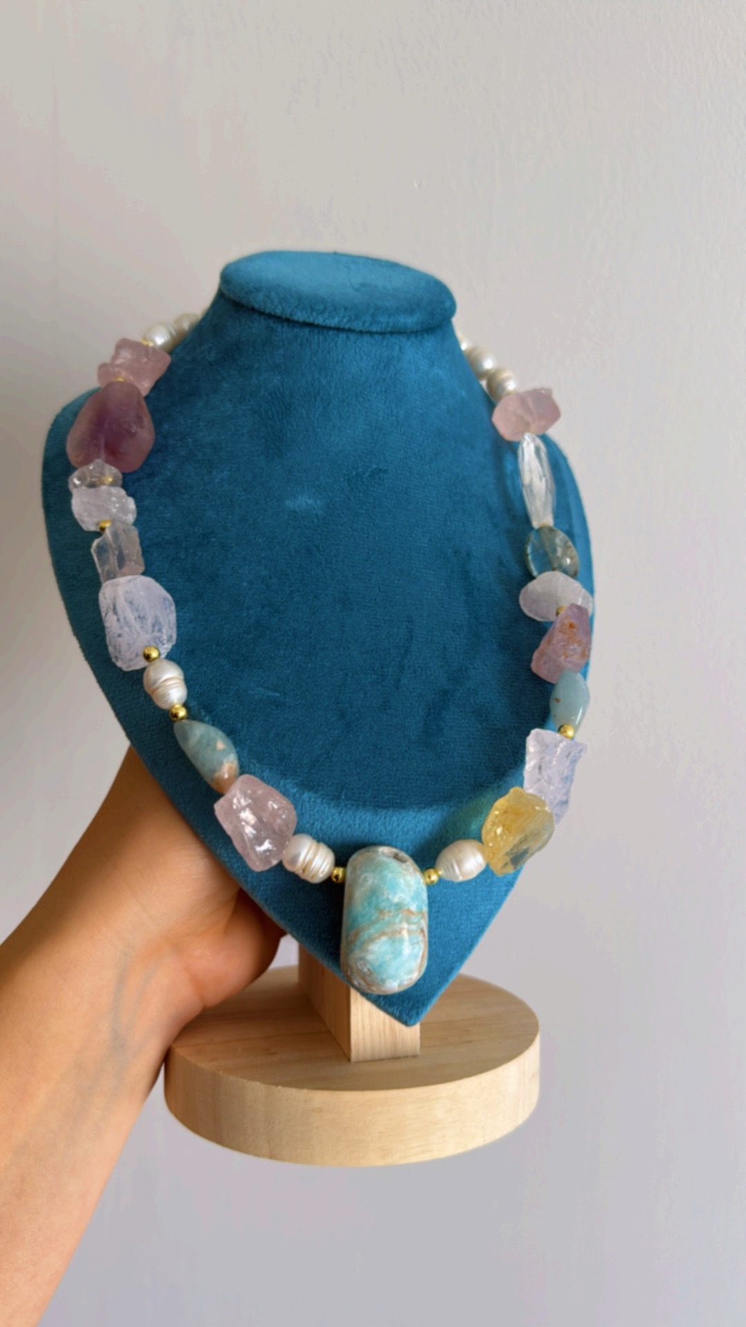 Tento centrálny kameň je srdcom náhrdelníka, okolo ktorého sa v kruhu energie rozkladajú riečne perly, surový ruženín, akvamarín, citrín, krištáľ, ametrín a ďalšie surové kamene, prepojené jemnými zlatými komponentmi.