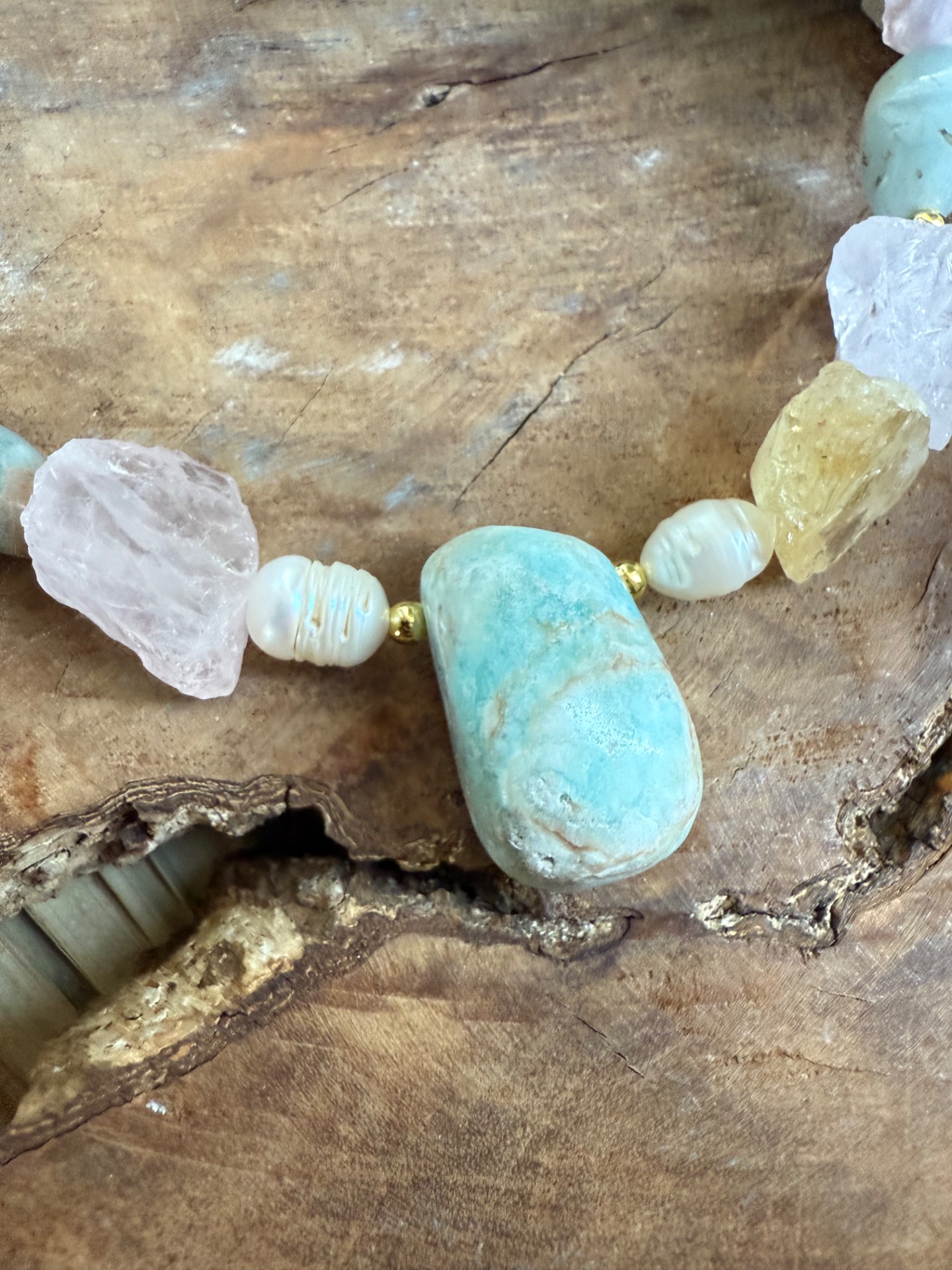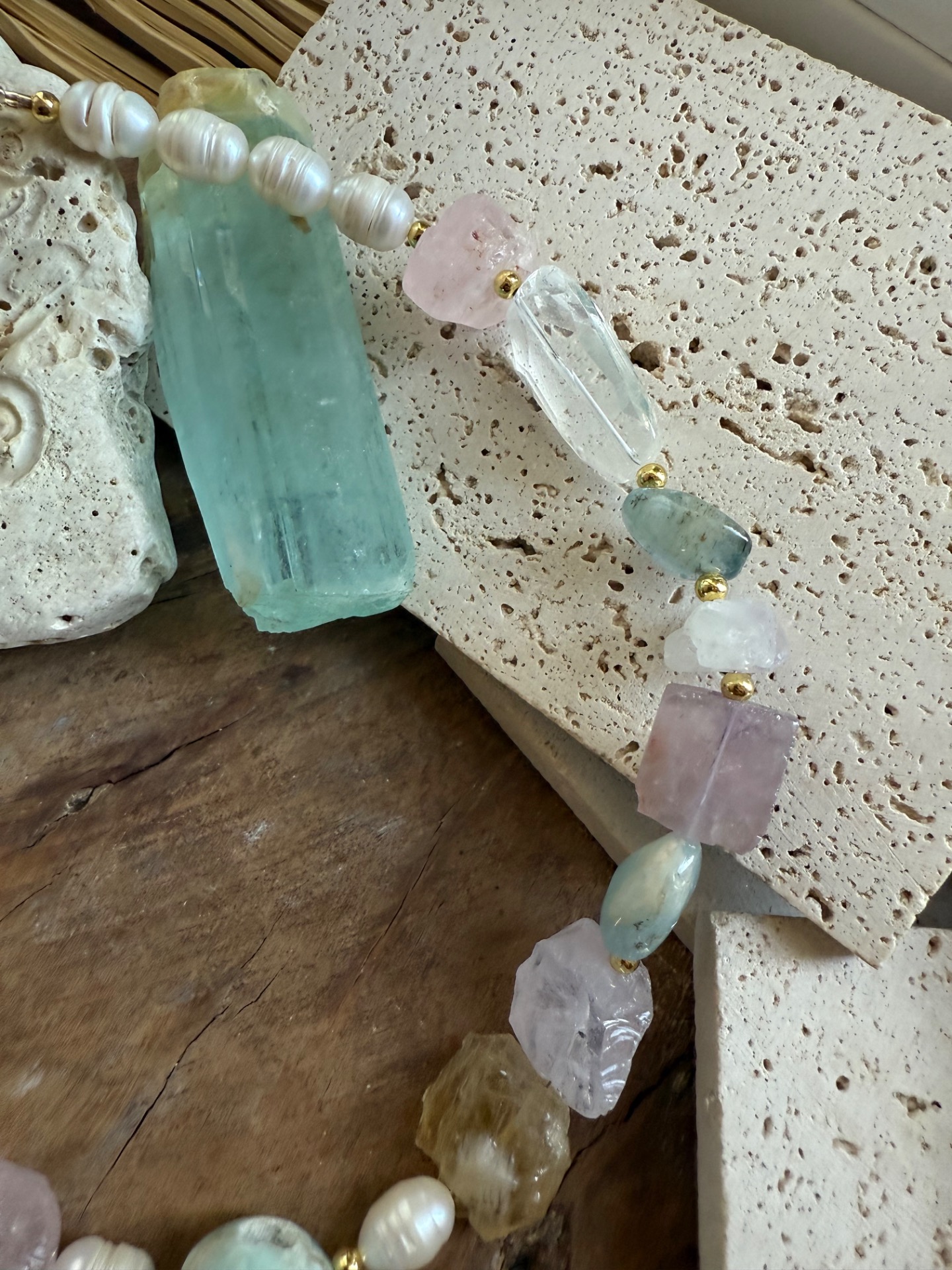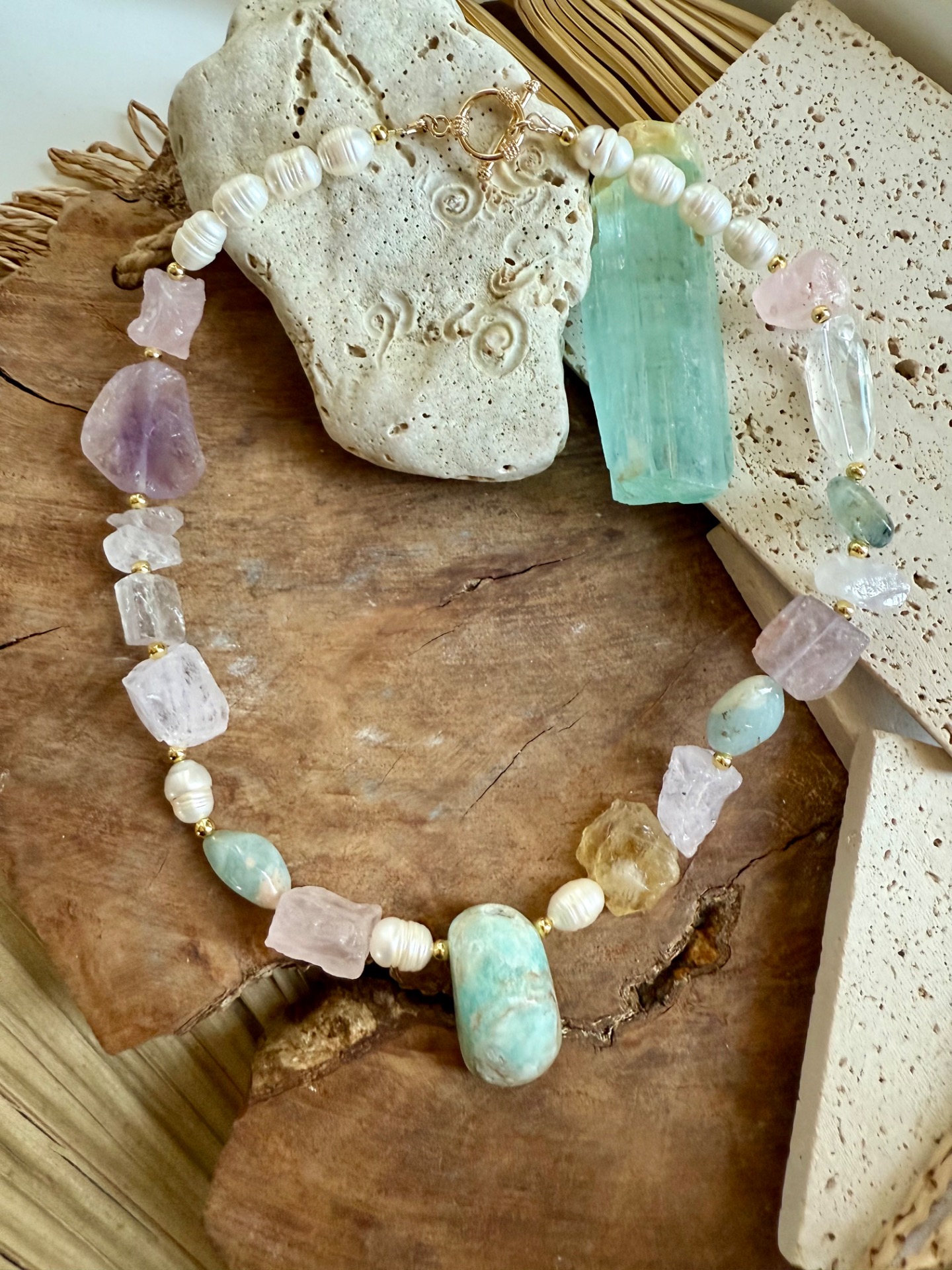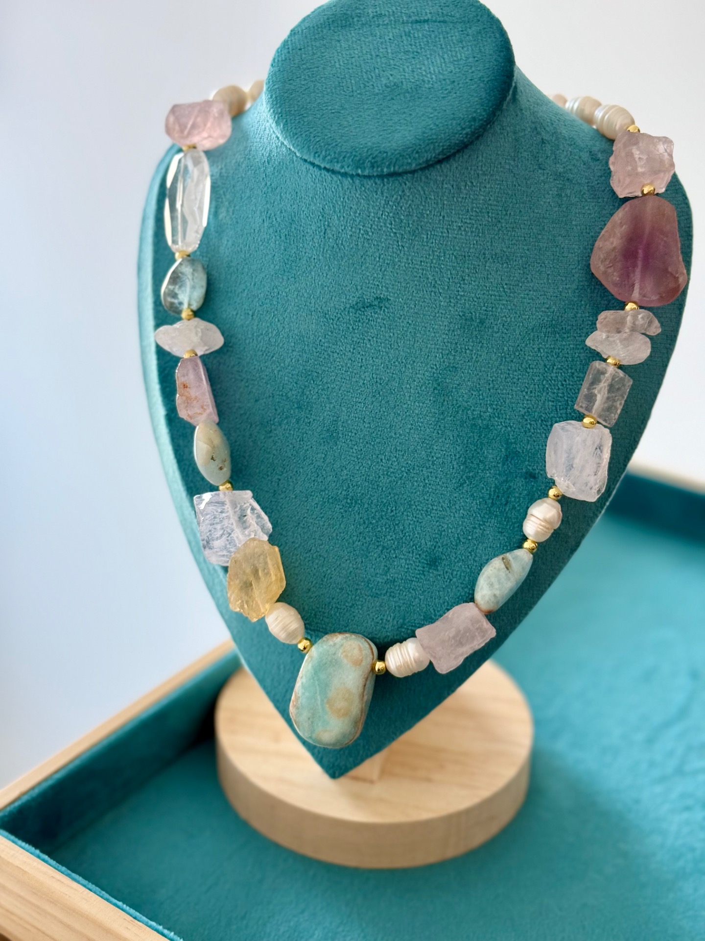 Tento centrálny kameň je srdcom náhrdelníka, okolo ktorého sa v kruhu energie rozkladajú riečne perly, surový ruženín, akvamarín, citrín, krištáľ, ametrín a ďalšie surové kamene, prepojené jemnými zlatými komponentmi.