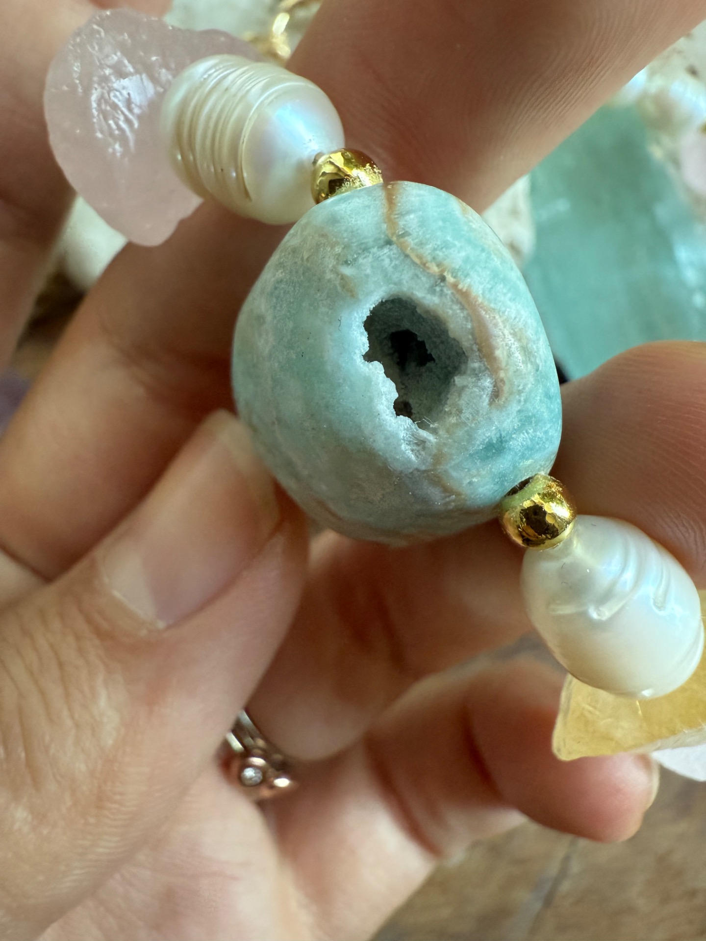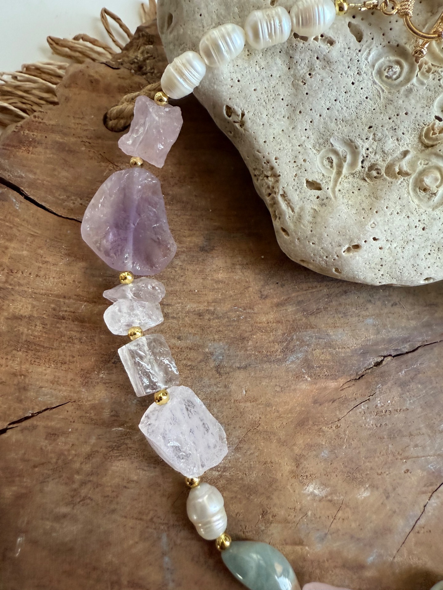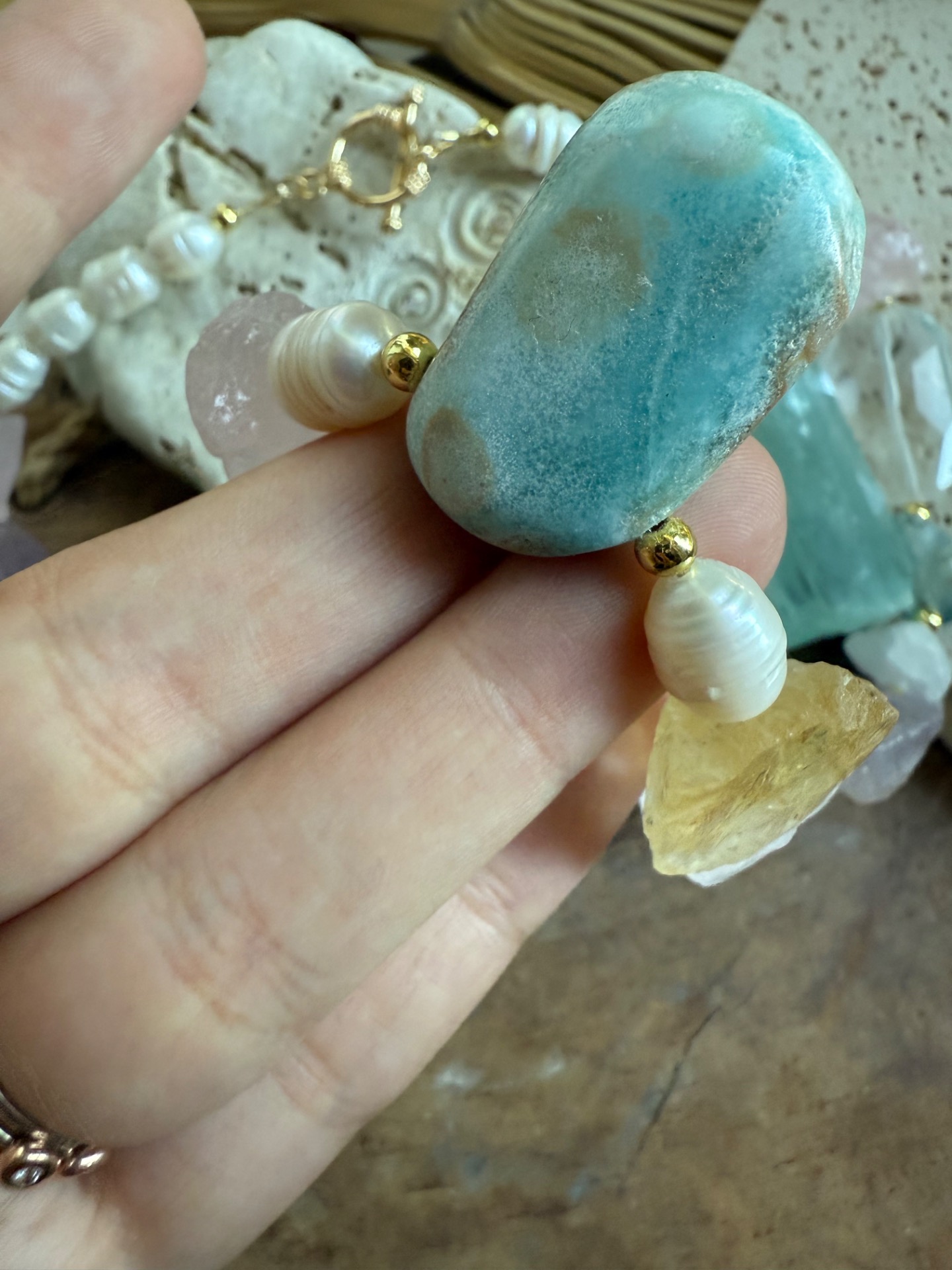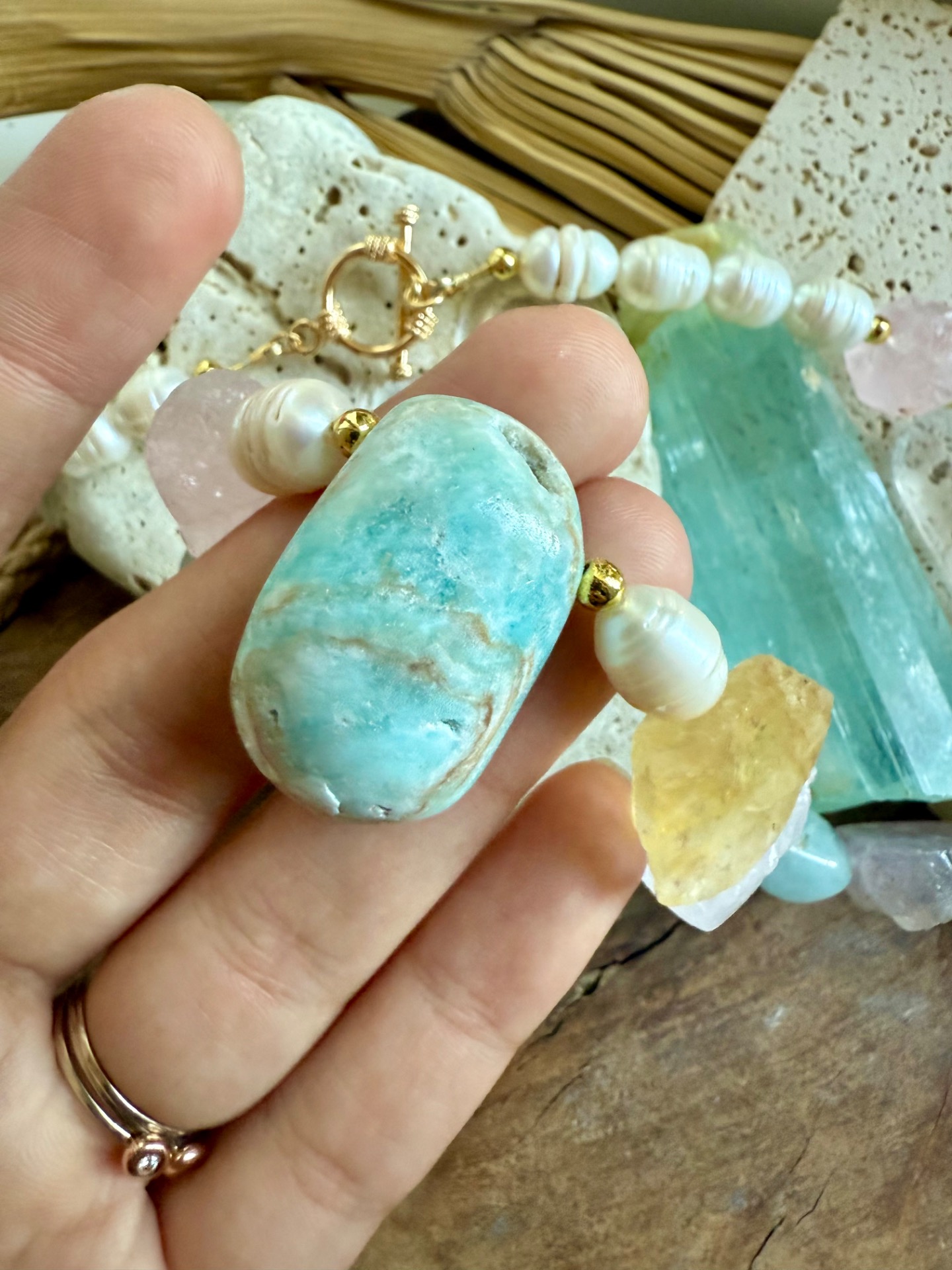 Tento centrálny kameň je srdcom náhrdelníka, okolo ktorého sa v kruhu energie rozkladajú riečne perly, surový ruženín, akvamarín, citrín, krištáľ, ametrín a ďalšie surové kamene, prepojené jemnými zlatými komponentmi.