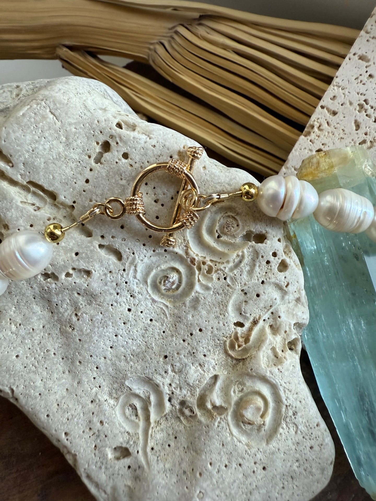 Materiály: riečne perly, ruženín, akvamarín, citrín, ametrín, krištáľ