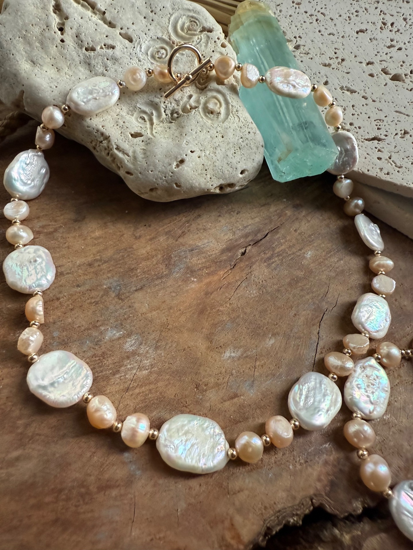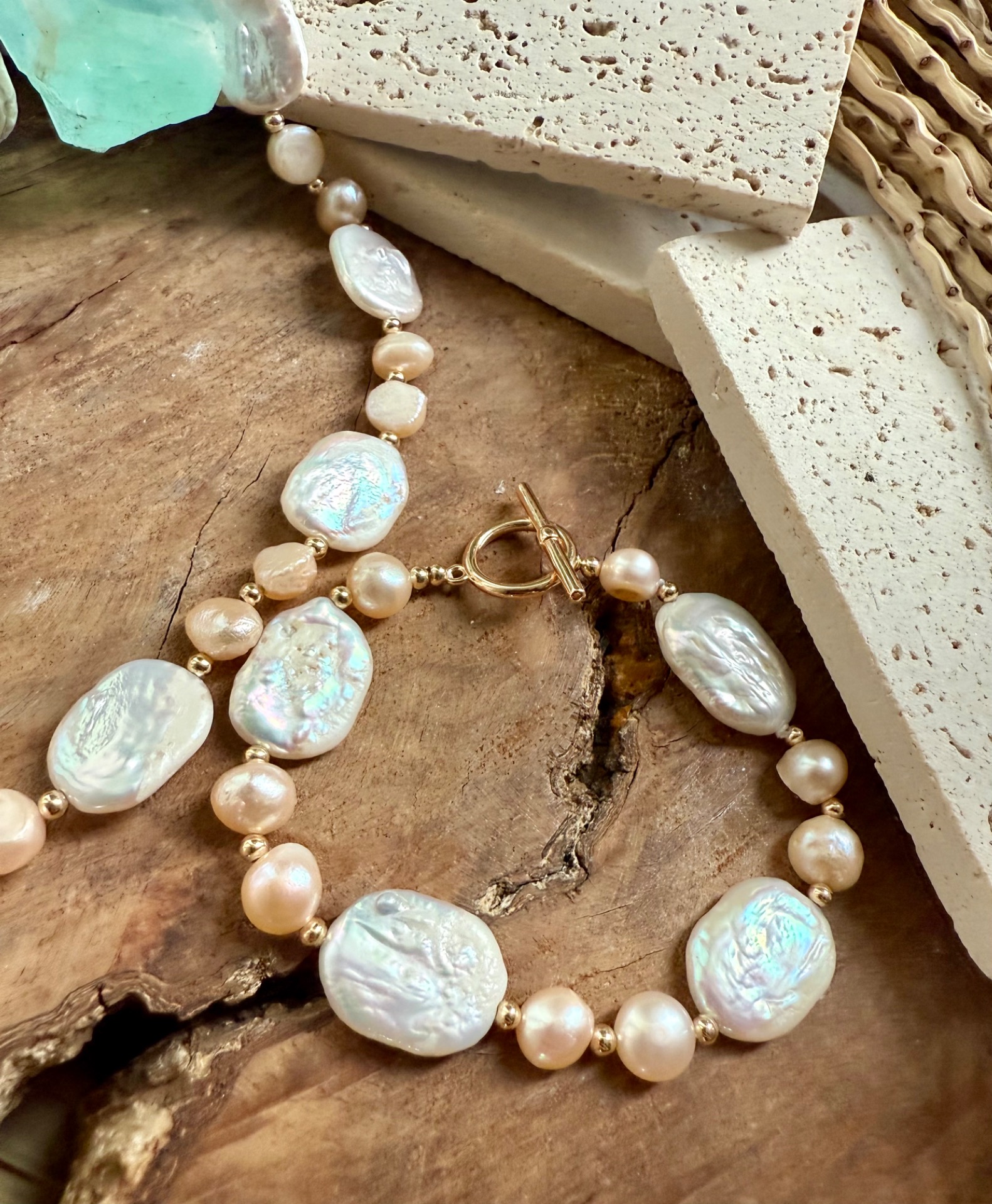 Náhrdelník aj náramok sú vytvorené z kombinácie nepravidelných barokových perál a jemných riečnych perličiek, ktoré spolu vytvárajú harmonický kontrast surovej prírody a nežnej estetiky. Každá perla je jedinečná – tak ako ty.