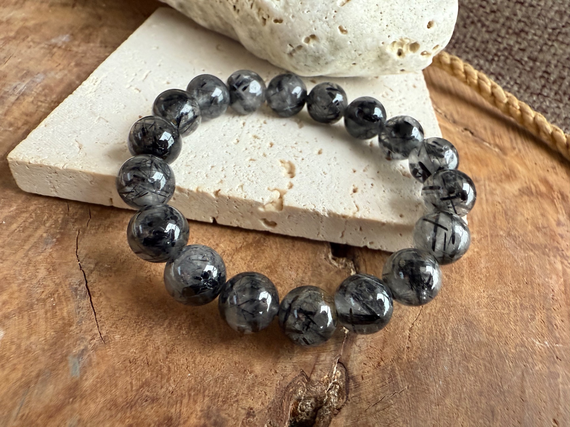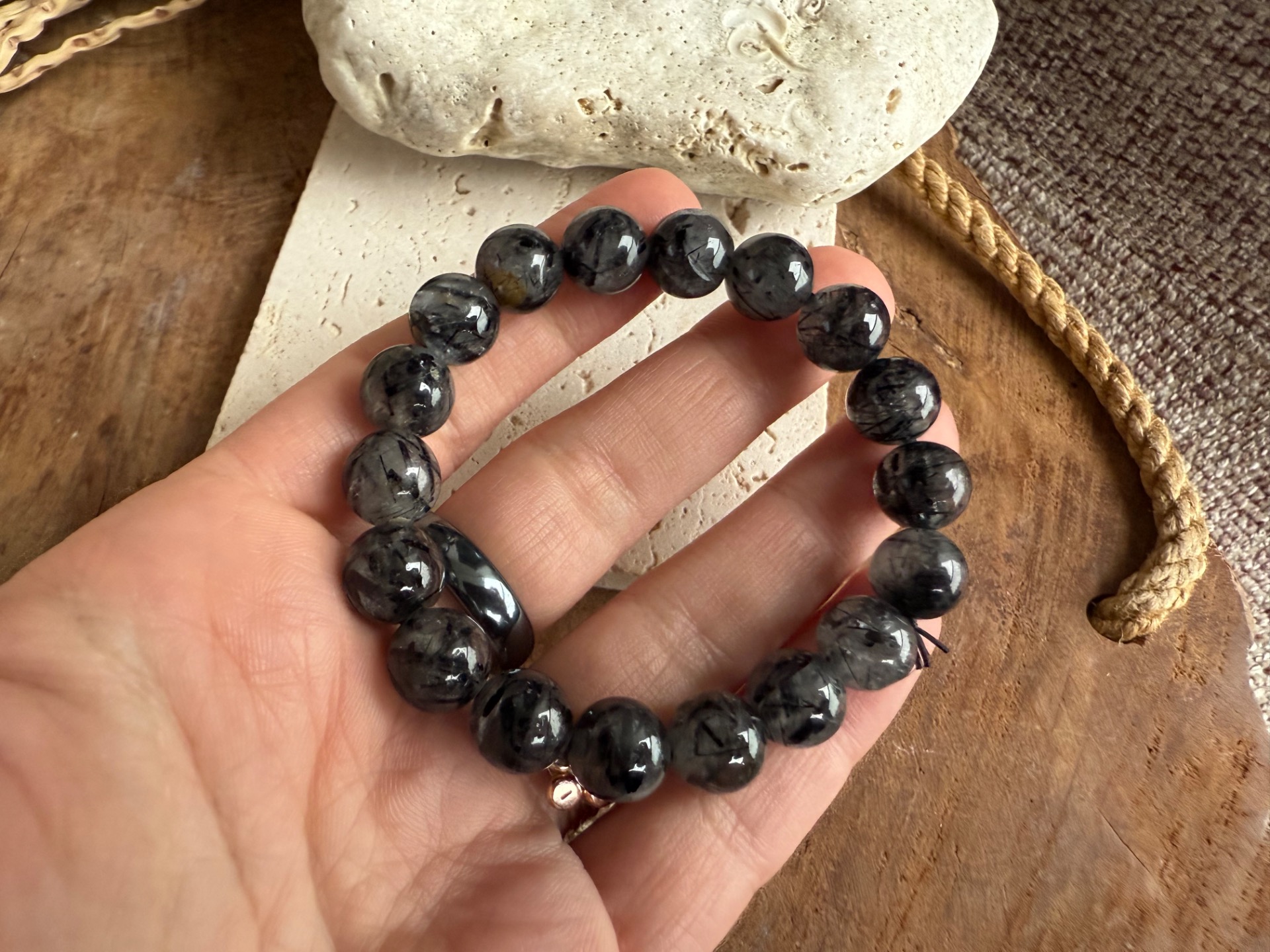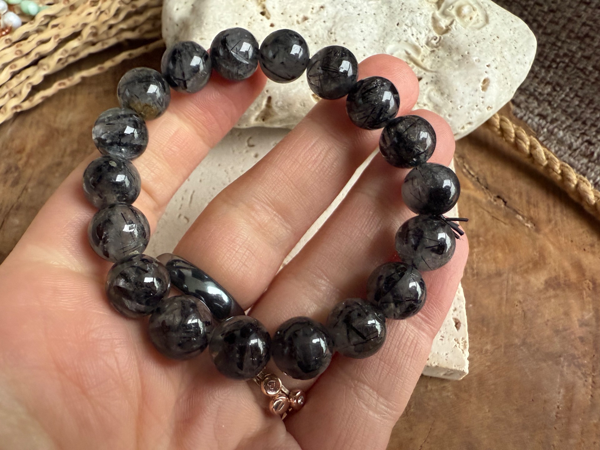 Toto je topka medzi topkami — úprimne, dlho som nemala v rukách takto krásny a výrazný kus. Turmalínové časti sú neskutočne viditeľné, sýte a viac do čierna, vďaka čomu pôsobí náramok mysticko, silno a luxusne.