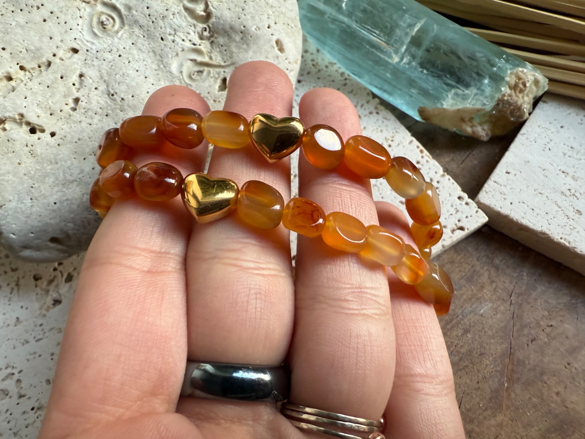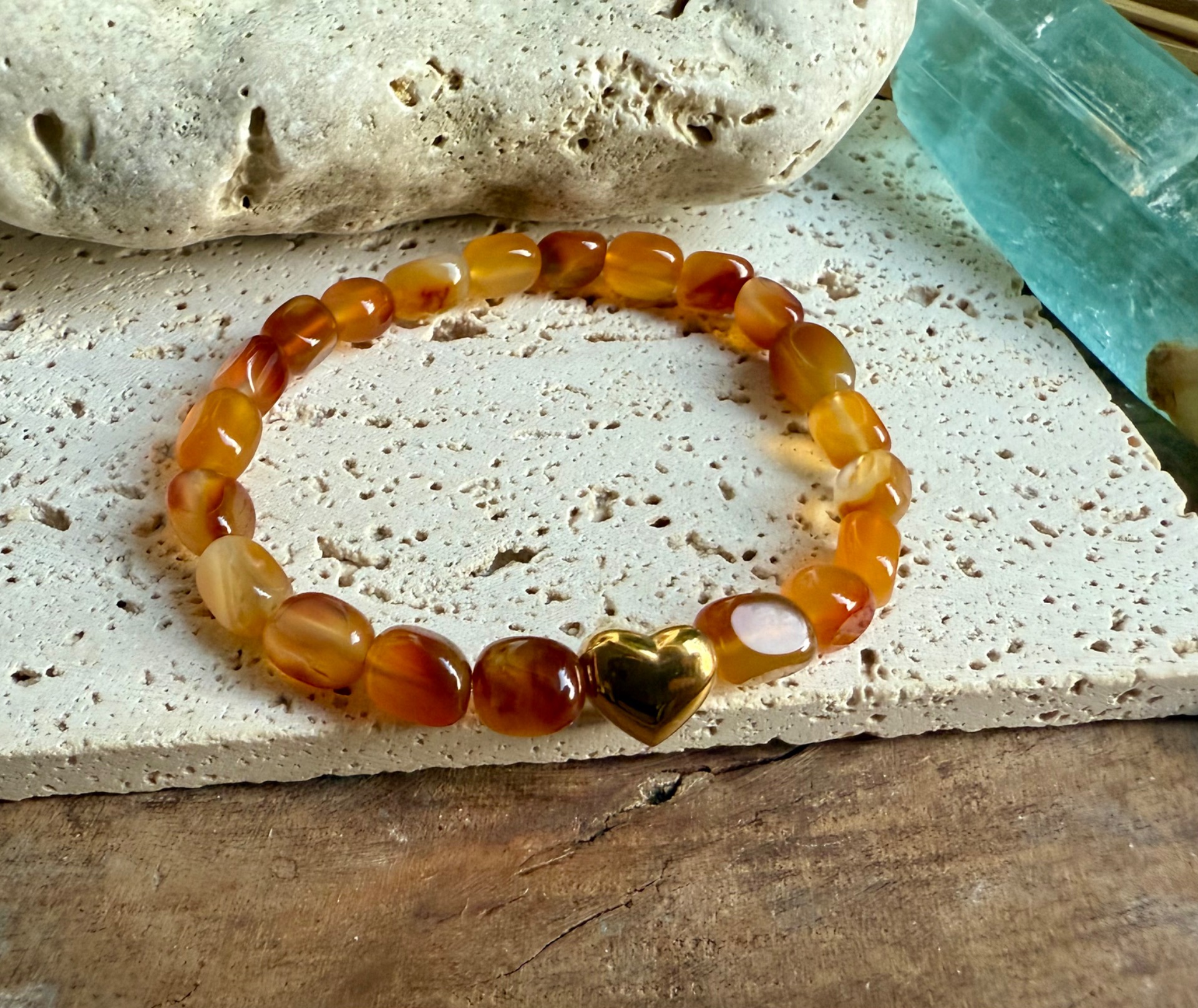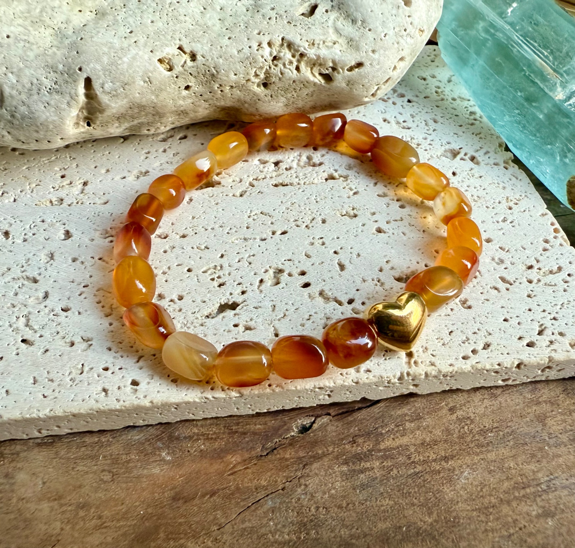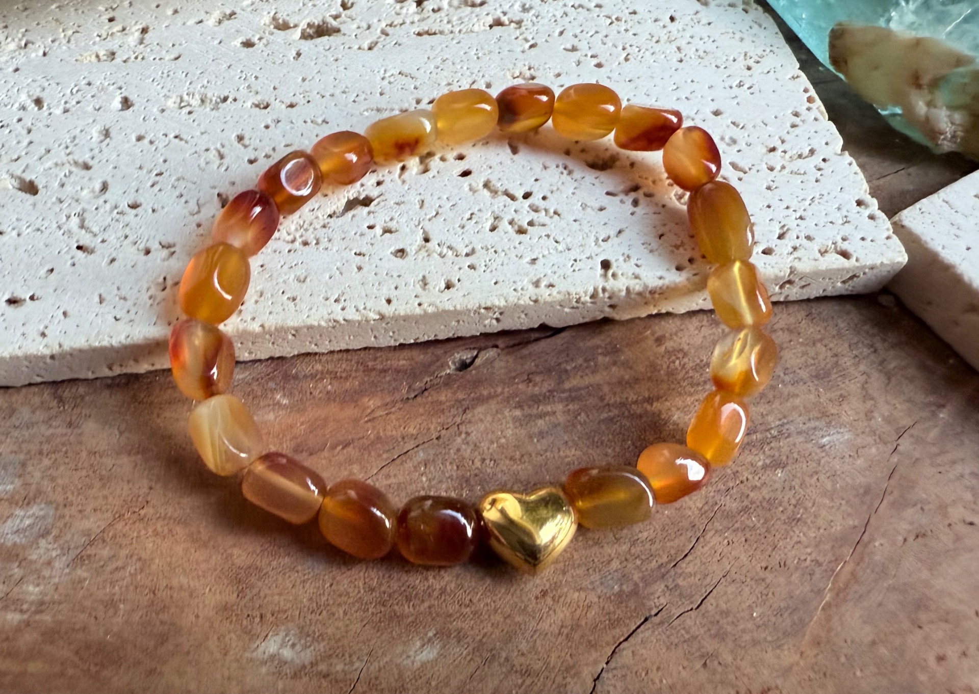 Prineste do svojho života pozitívnu energiu, kreativitu a vnútornú radosť s týmto elegantným náramkom z karneolu, doplneným jemným nerezovým srdiečkom v zlatej farbe, ktoré symbolizuje lásku, harmóniu a pozitívne vibrácie.
