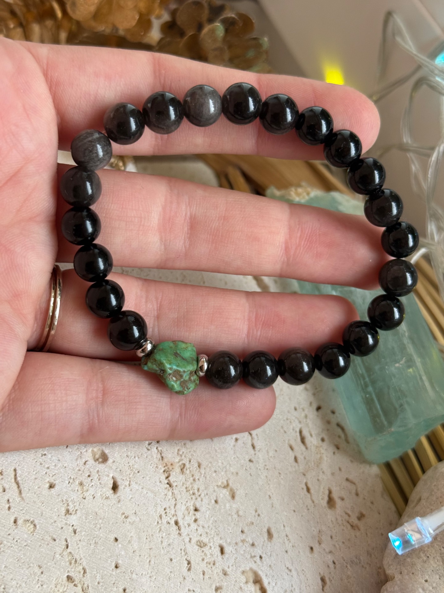 Silný, ochranný náramok pre muža, ktorý kráča vlastnou cestou. Kombinácia obsidiánu, ónyxu a nepravidelného tyrkysu nesie energiu zeme, neba aj vnútornej sily. Každý kus je originál – tyrkys v surovom, nepravidelnom tvare dodáva náramku autentický šamanský charakter.