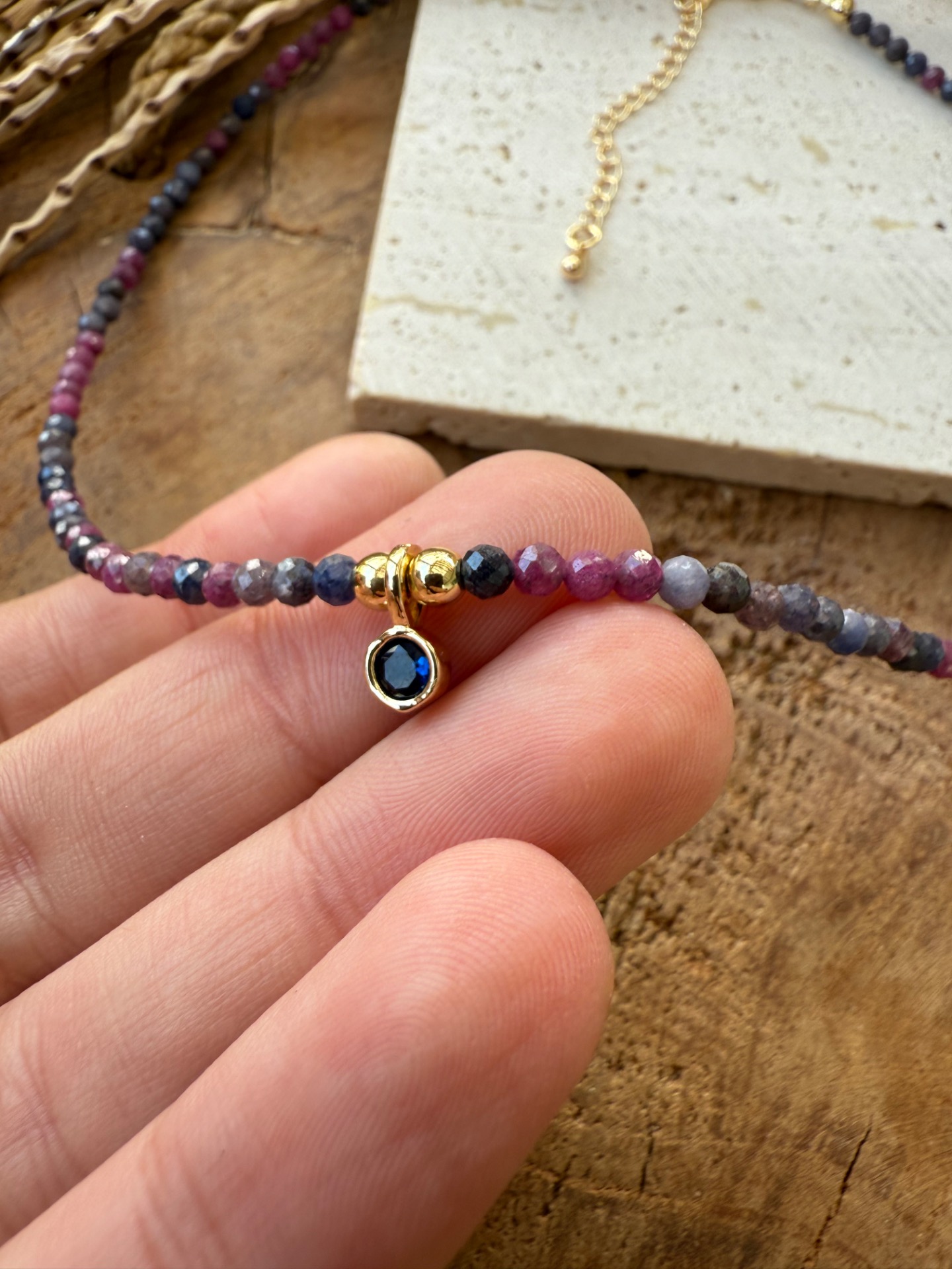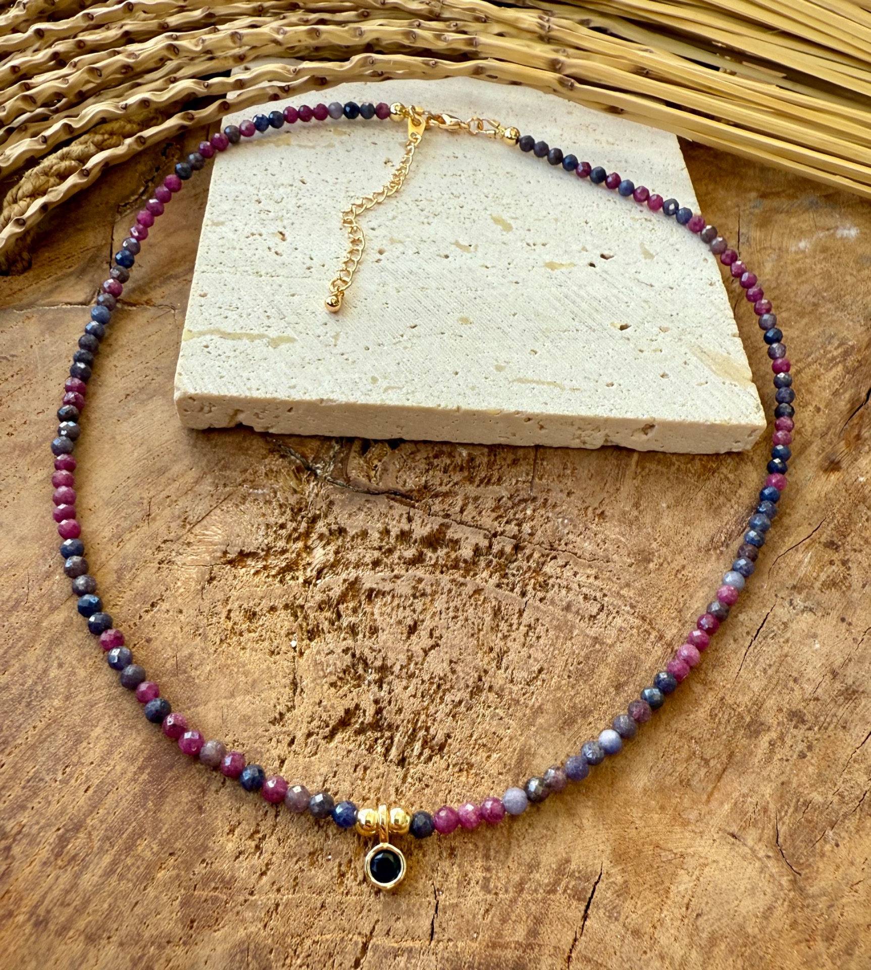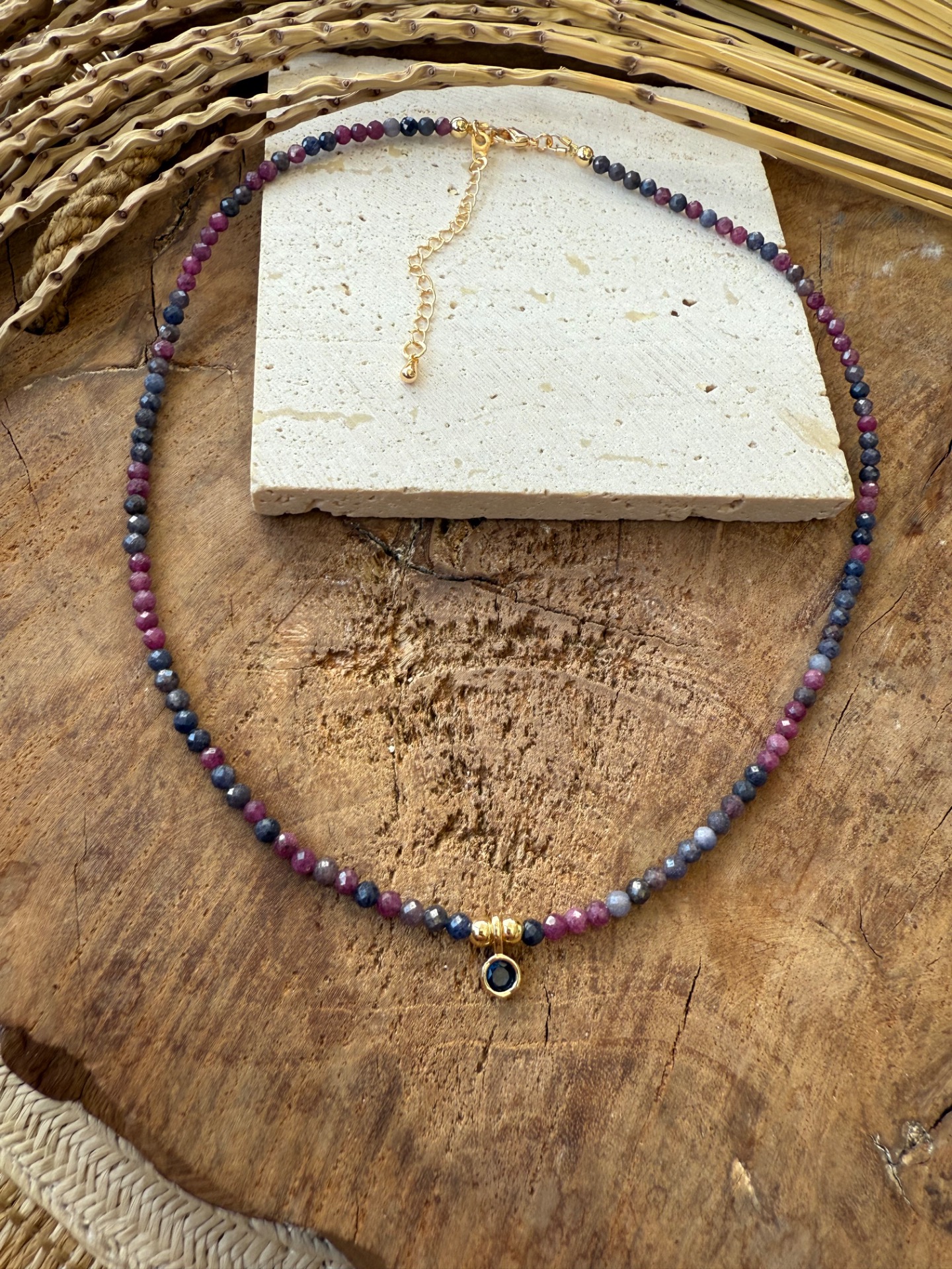 Tento elegantný choker spája jemnú luxusnú kombináciu rubínu a zafíru do minimalistického a nadčasového šperku. Drobné fazetované korálky spolu s malým príveskom vytvárajú ľahký, vzdušný dizajn, ktorý je ideálny na vrstvenie alebo nosenie samostatne pre jemný, elegantný look.