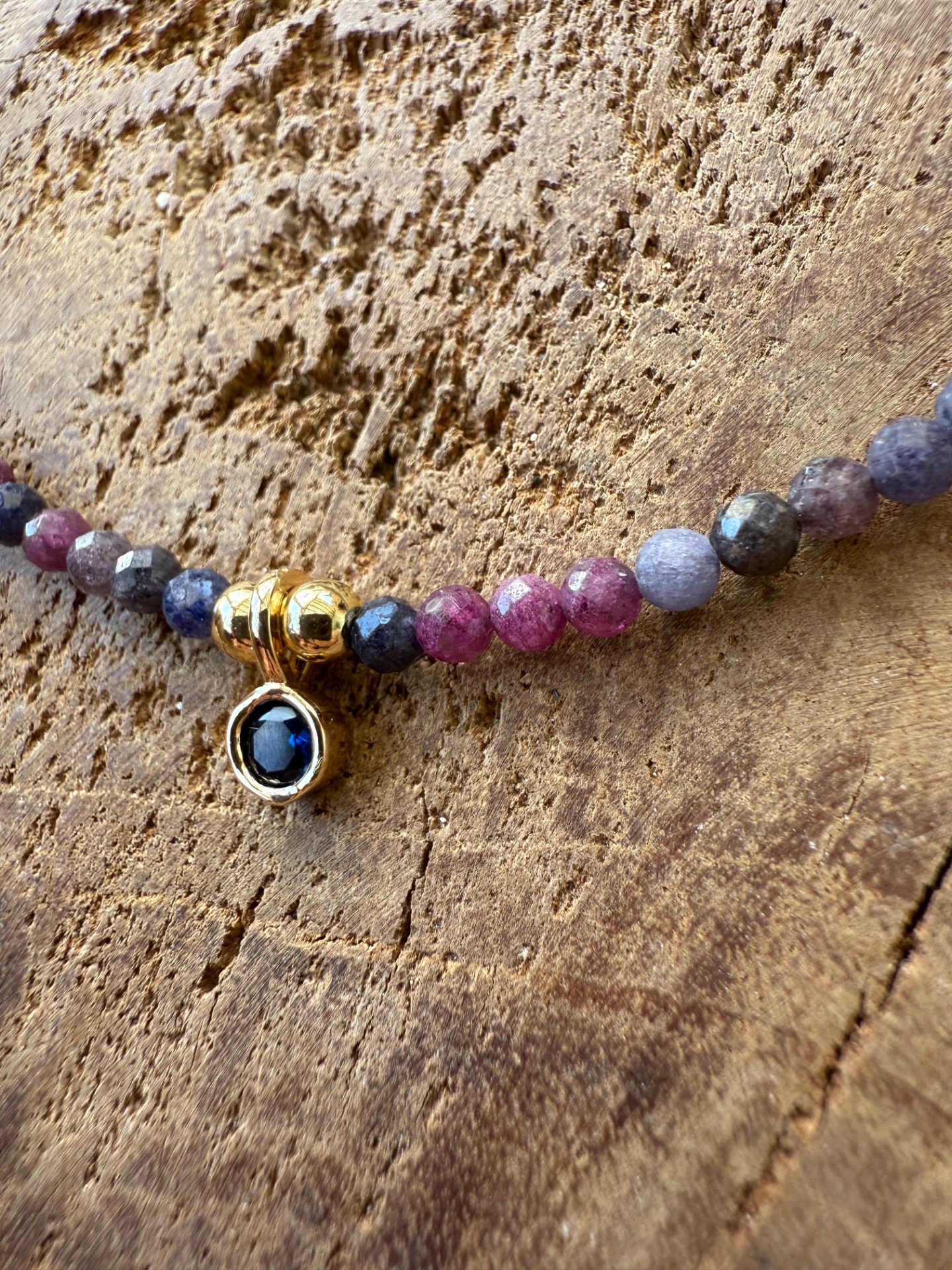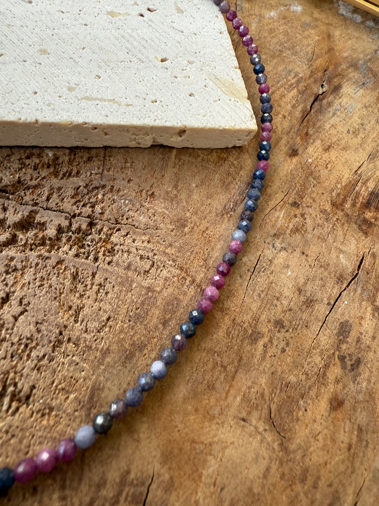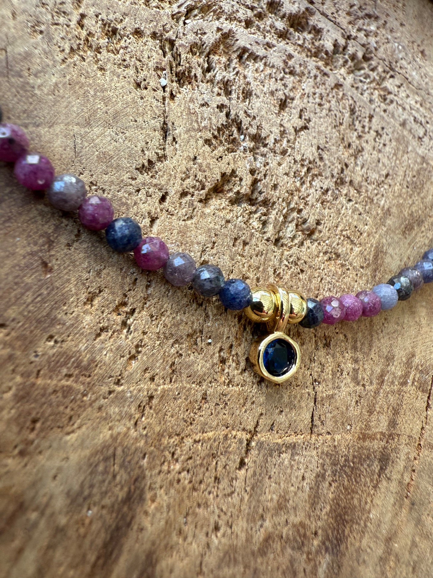 Tento elegantný choker spája jemnú luxusnú kombináciu rubínu a zafíru do minimalistického a nadčasového šperku. Drobné fazetované korálky spolu s malým príveskom vytvárajú ľahký, vzdušný dizajn, ktorý je ideálny na vrstvenie alebo nosenie samostatne pre jemný, elegantný look.