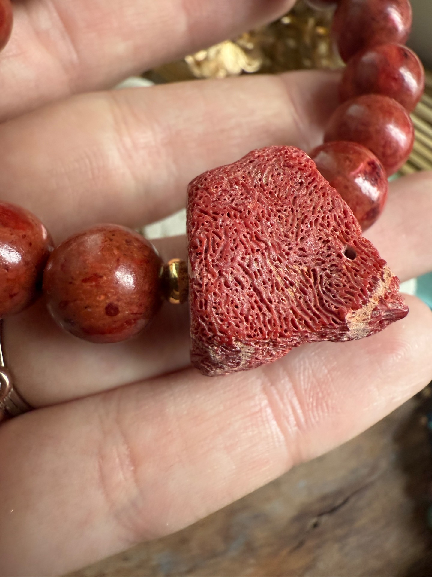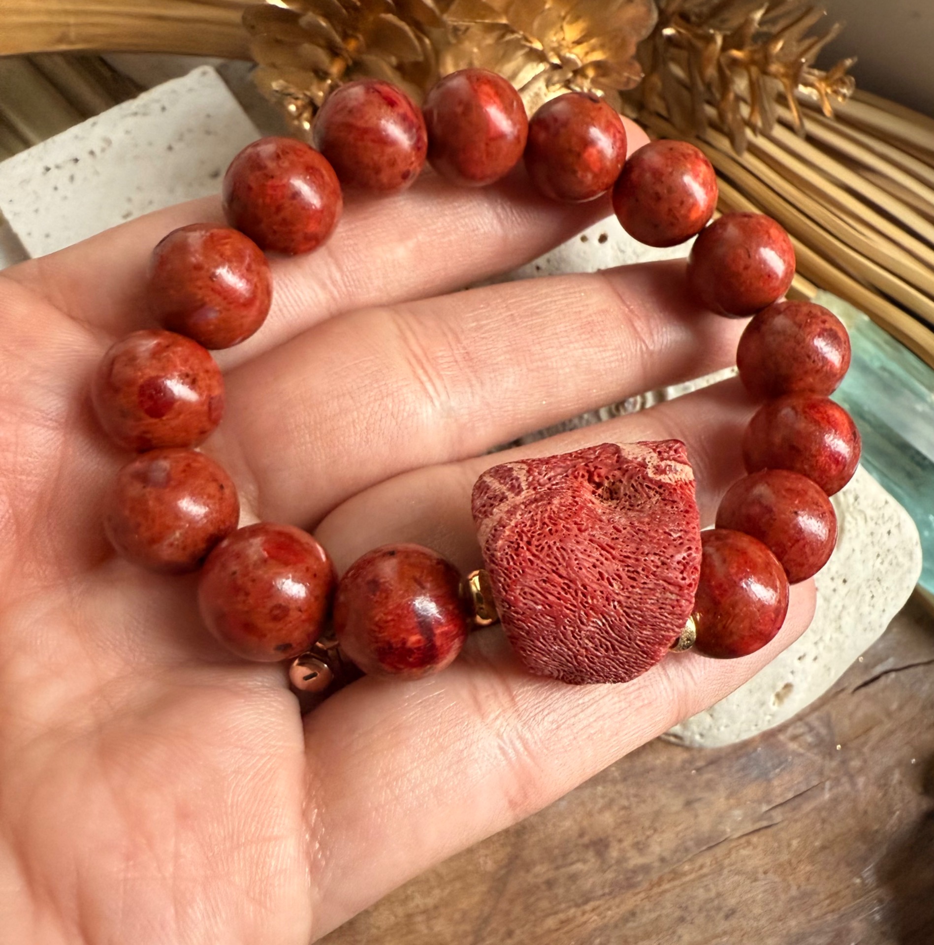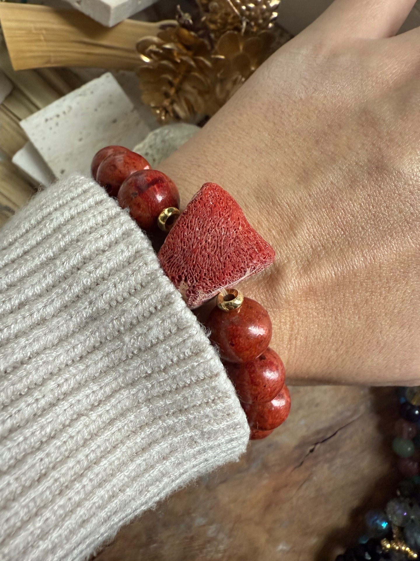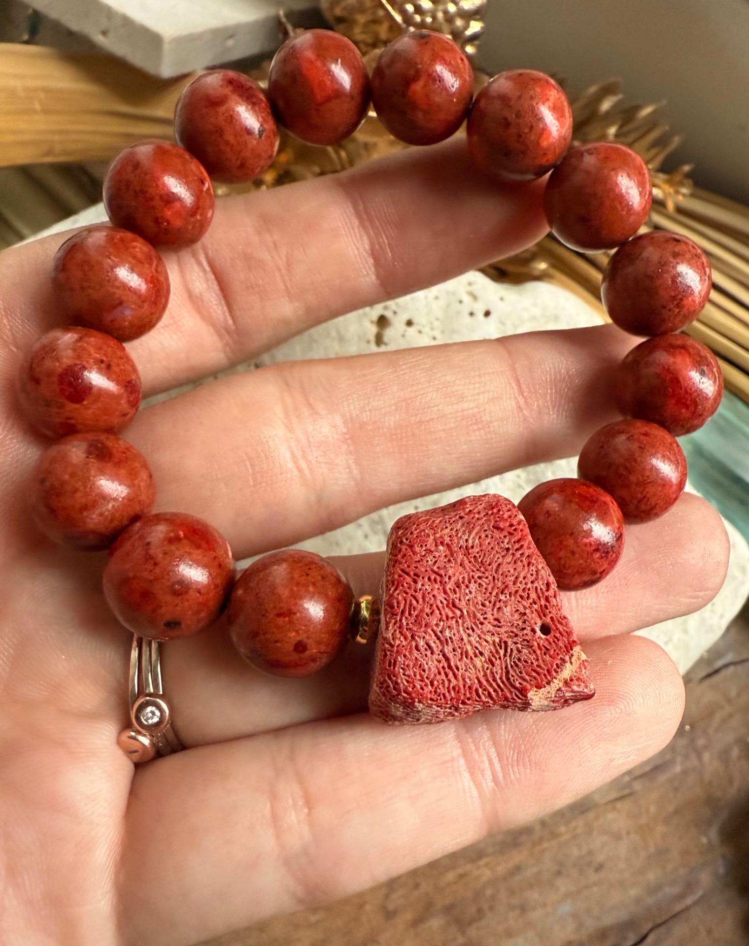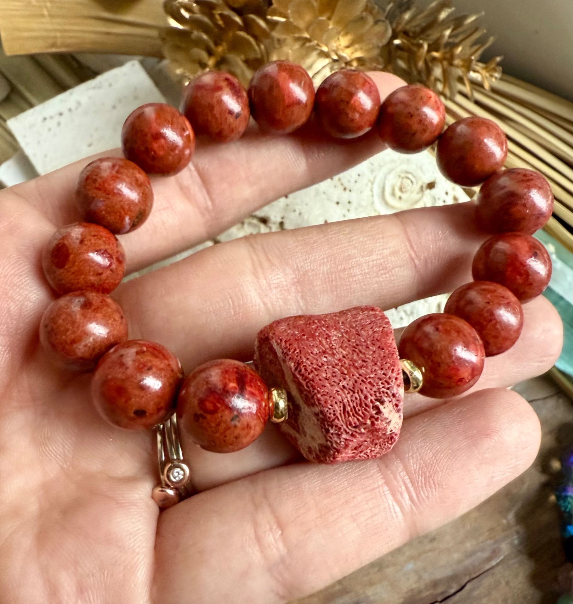 Výrazný a jedinečný náramok z koralu hubového (10 mm) s surovým koralom vpredu, ktorý okamžite upúta pozornosť. Každý kúsok je originál – ako malé umelecké dielo prírody!