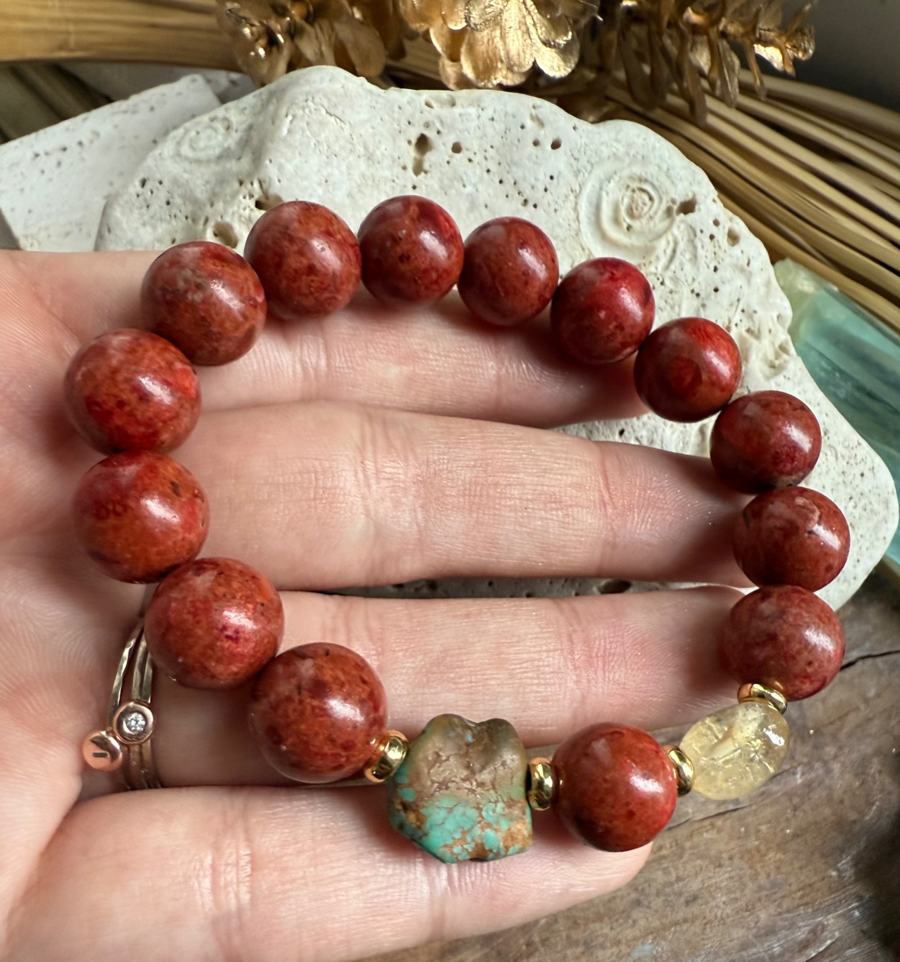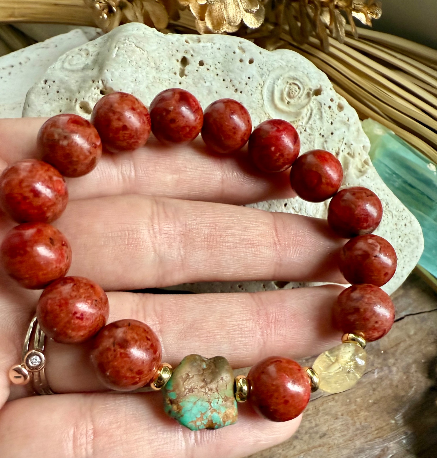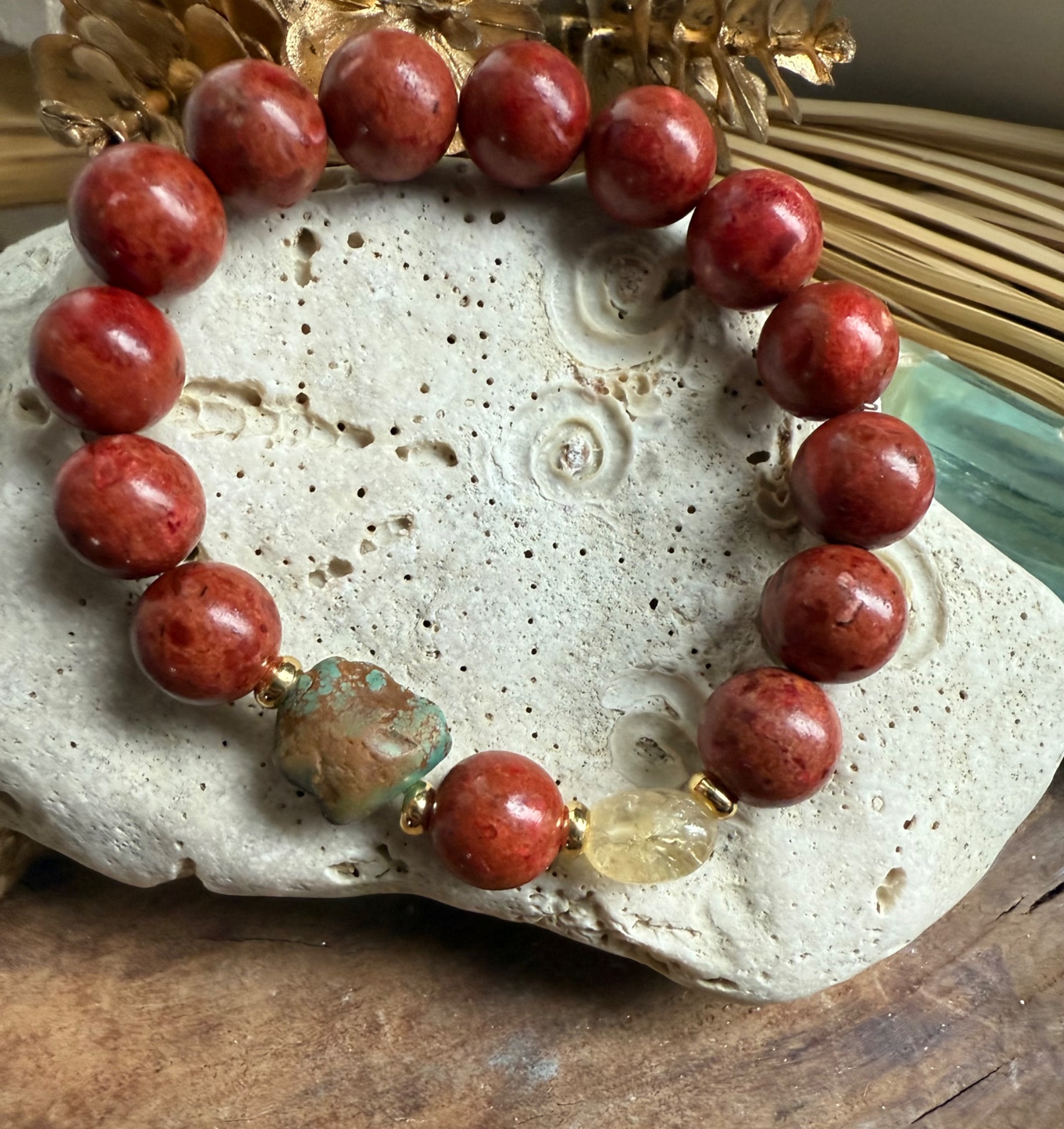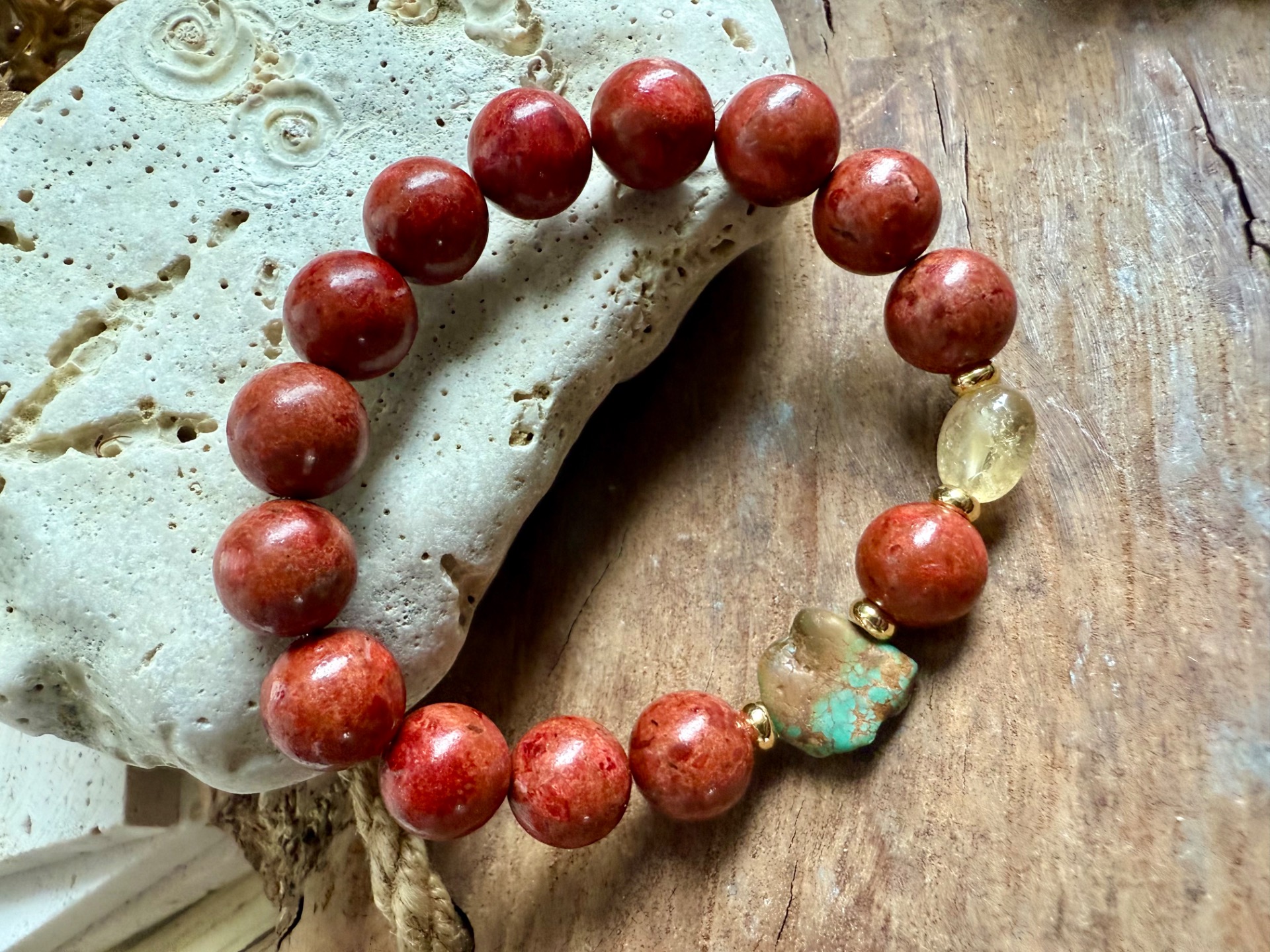 Unikátny náramok, ktorý spája prirodzenú silu koralu, energiu citrínu a ochrannú moc tyrkysu. Predná časť je ozdobená surovým tyrkysom a citrínovým nuggetom, ktoré dodávajú šperku autentickú, živú energiu.