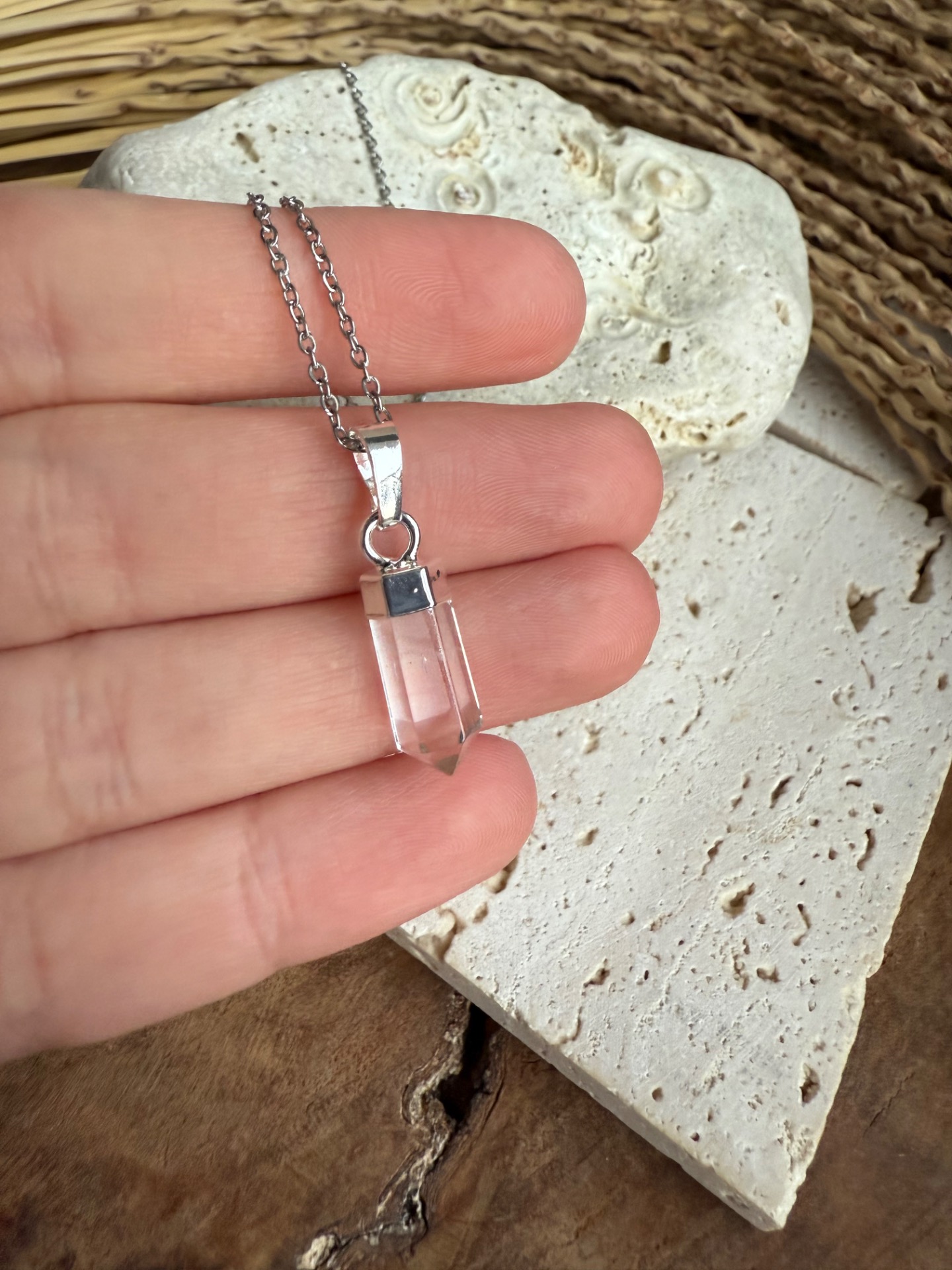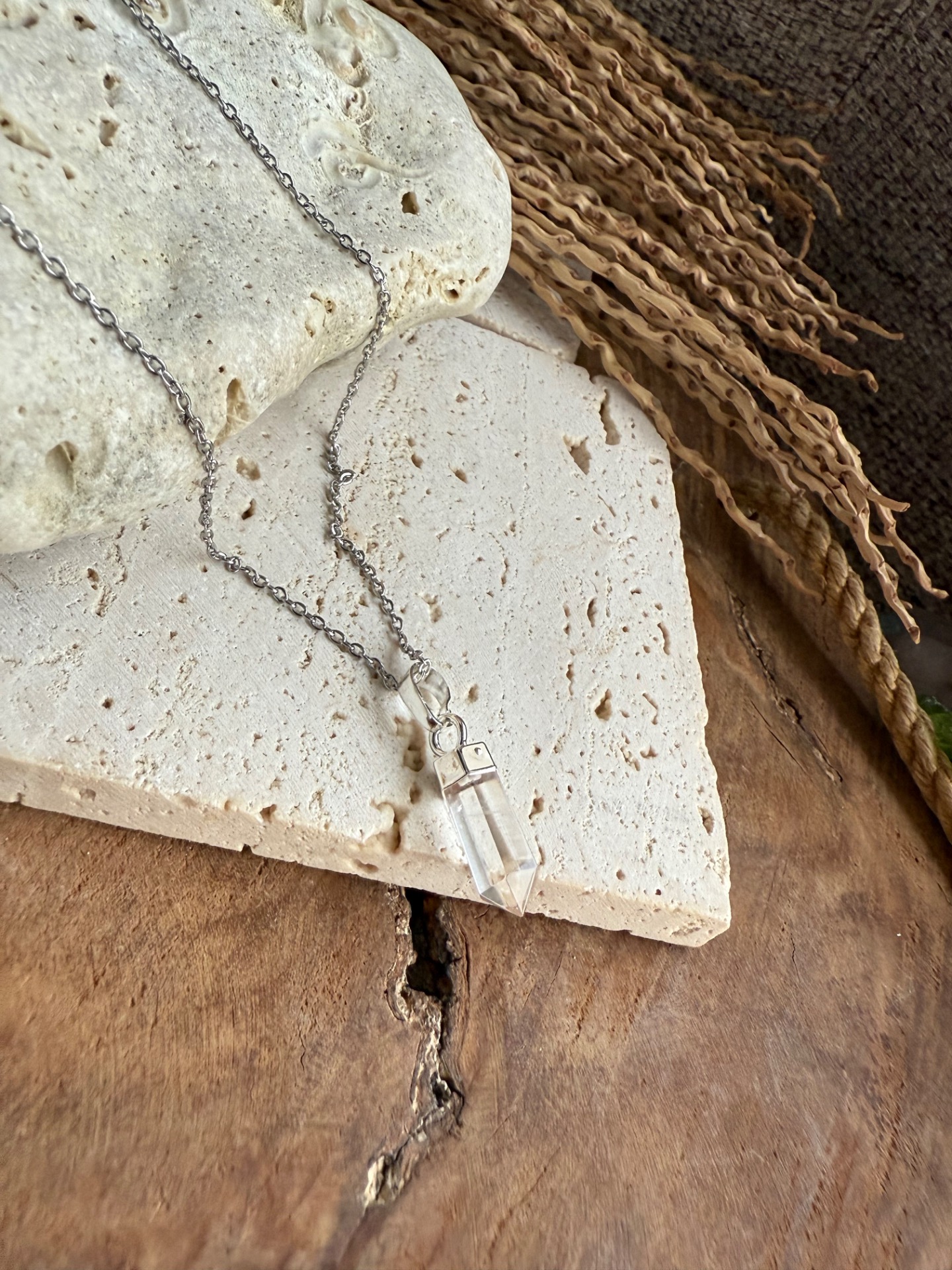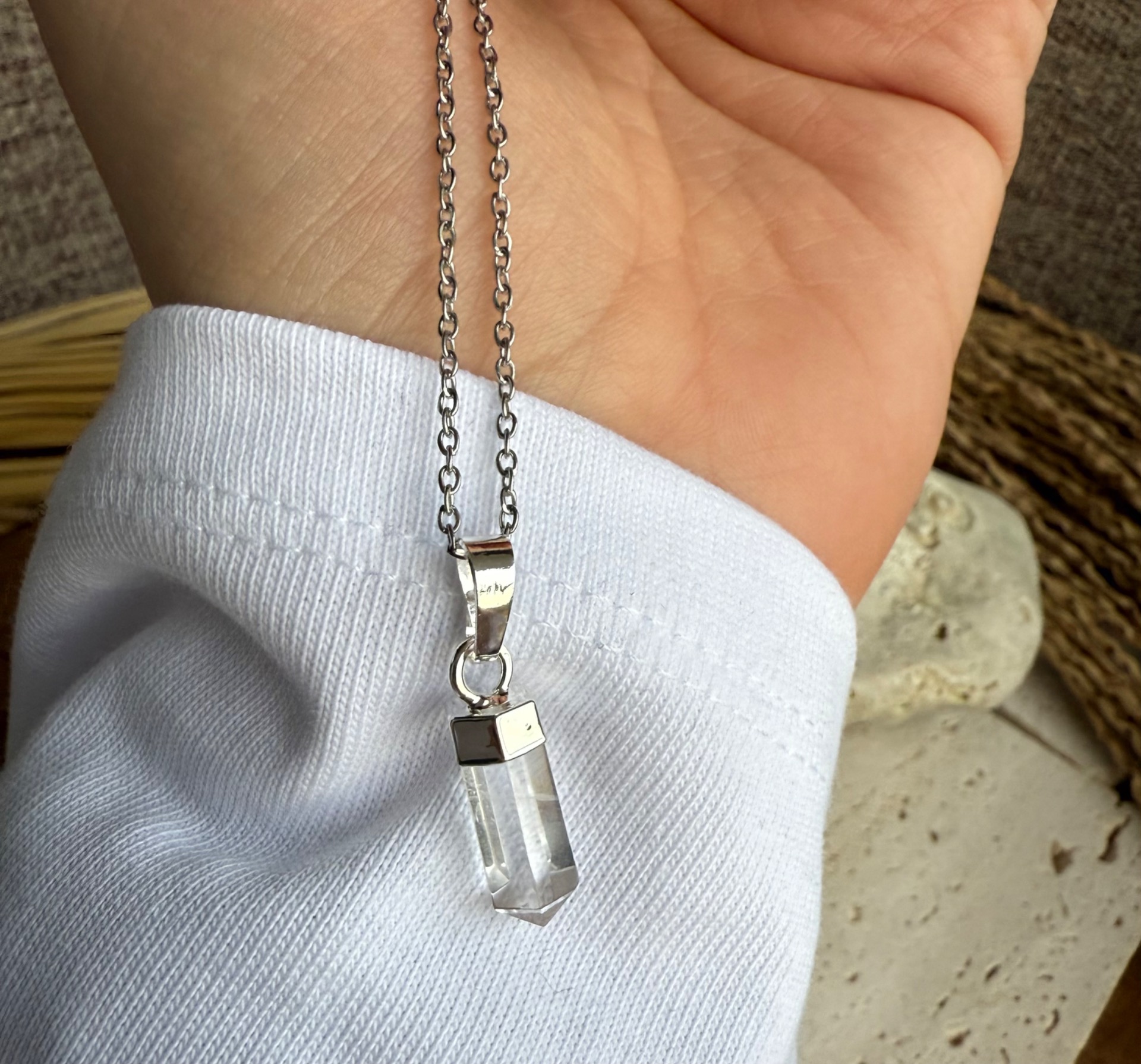 Jemný krištáľový prívesok na elegantnej nerezovej retiazke prináša čistotu energie, rovnováhu a vnútorný pokoj priamo k vám.