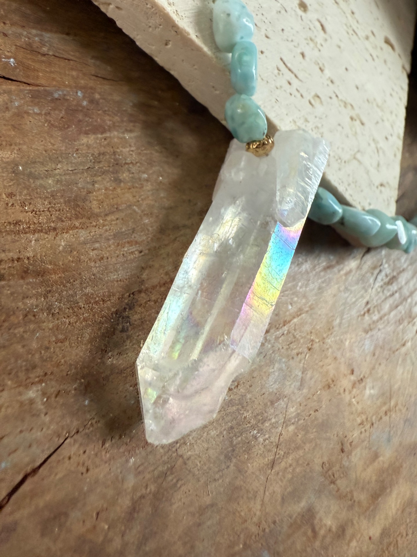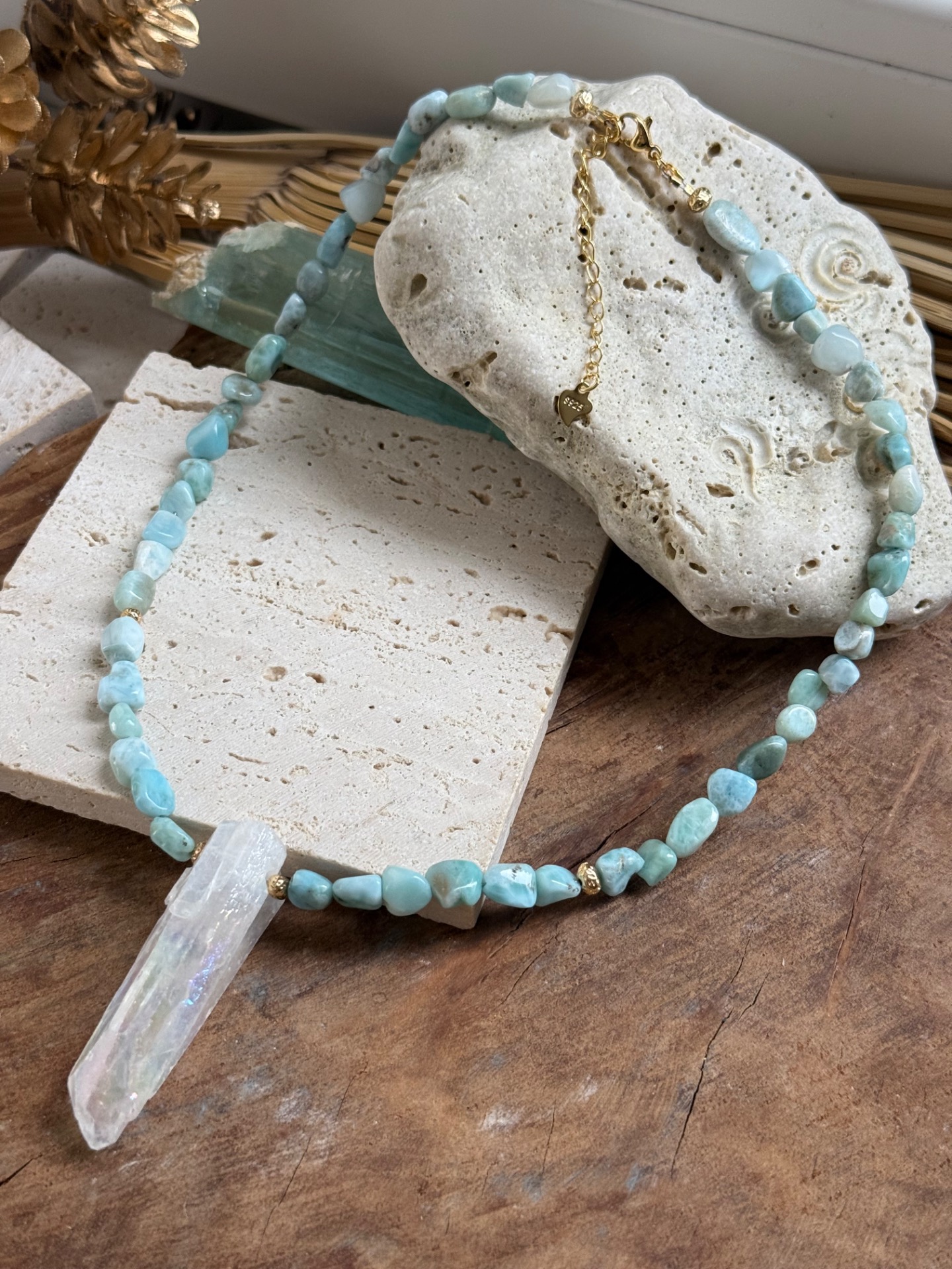 Dominantou šperku je aqua aura krištáľ s dĺžkou 7 cm, ktorý pôsobí ako svetelný portál – priťahuje pozornosť, rozjasňuje energiu nositeľky a vytvára jemný, ale výrazný stredobod. Larimar so svojimi nebesko-modrými odtieňmi prináša pokoj, harmóniu a pocit bezpečia.