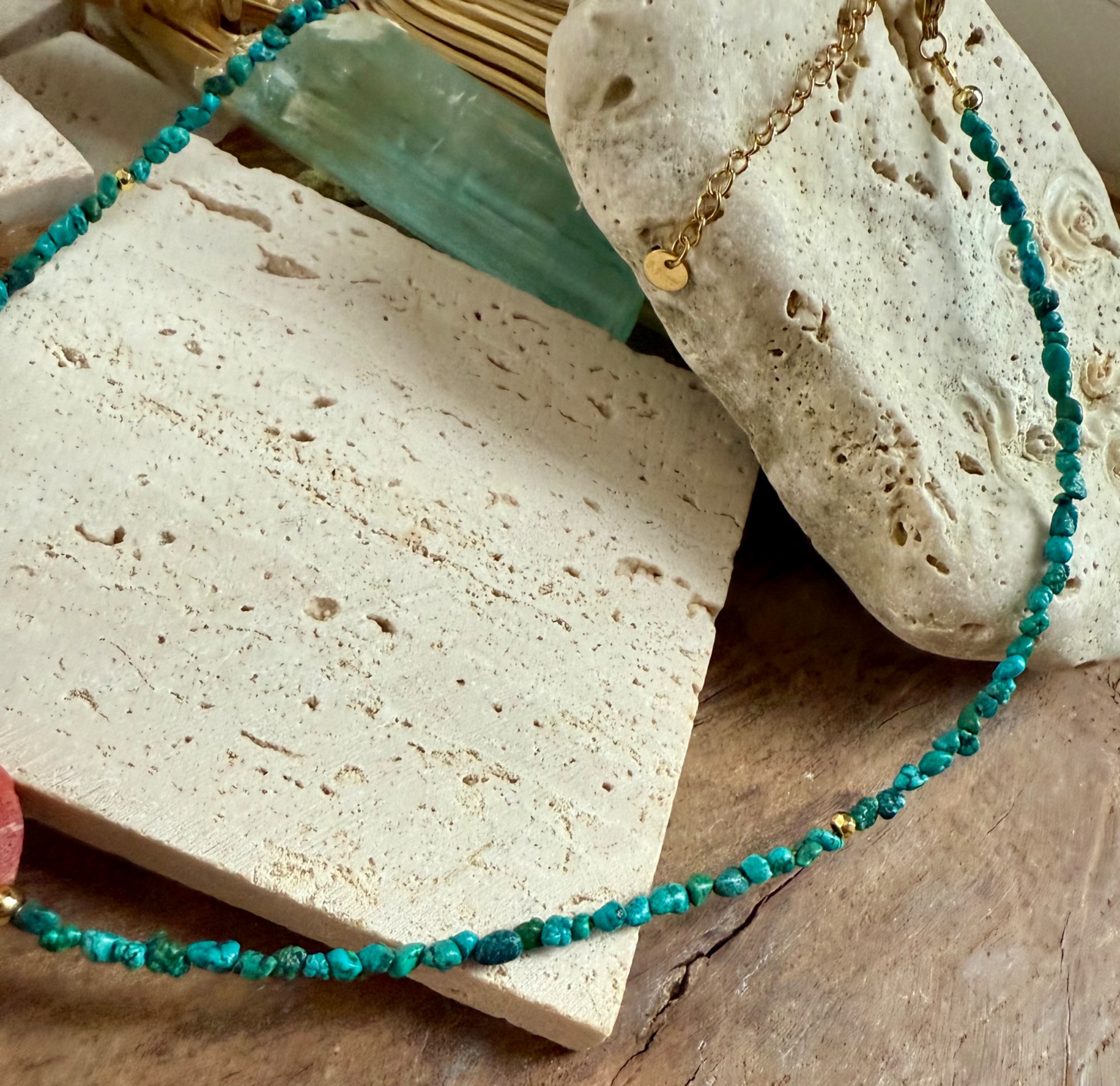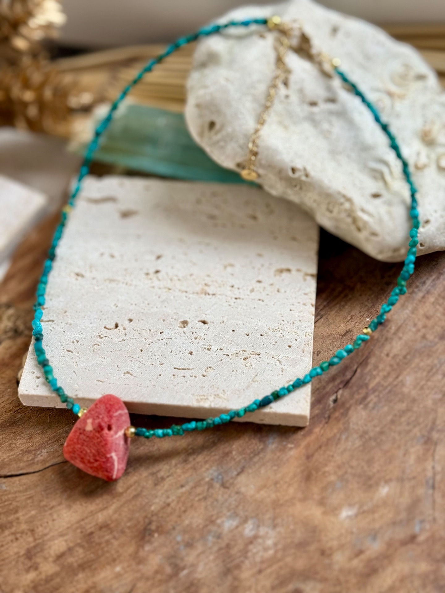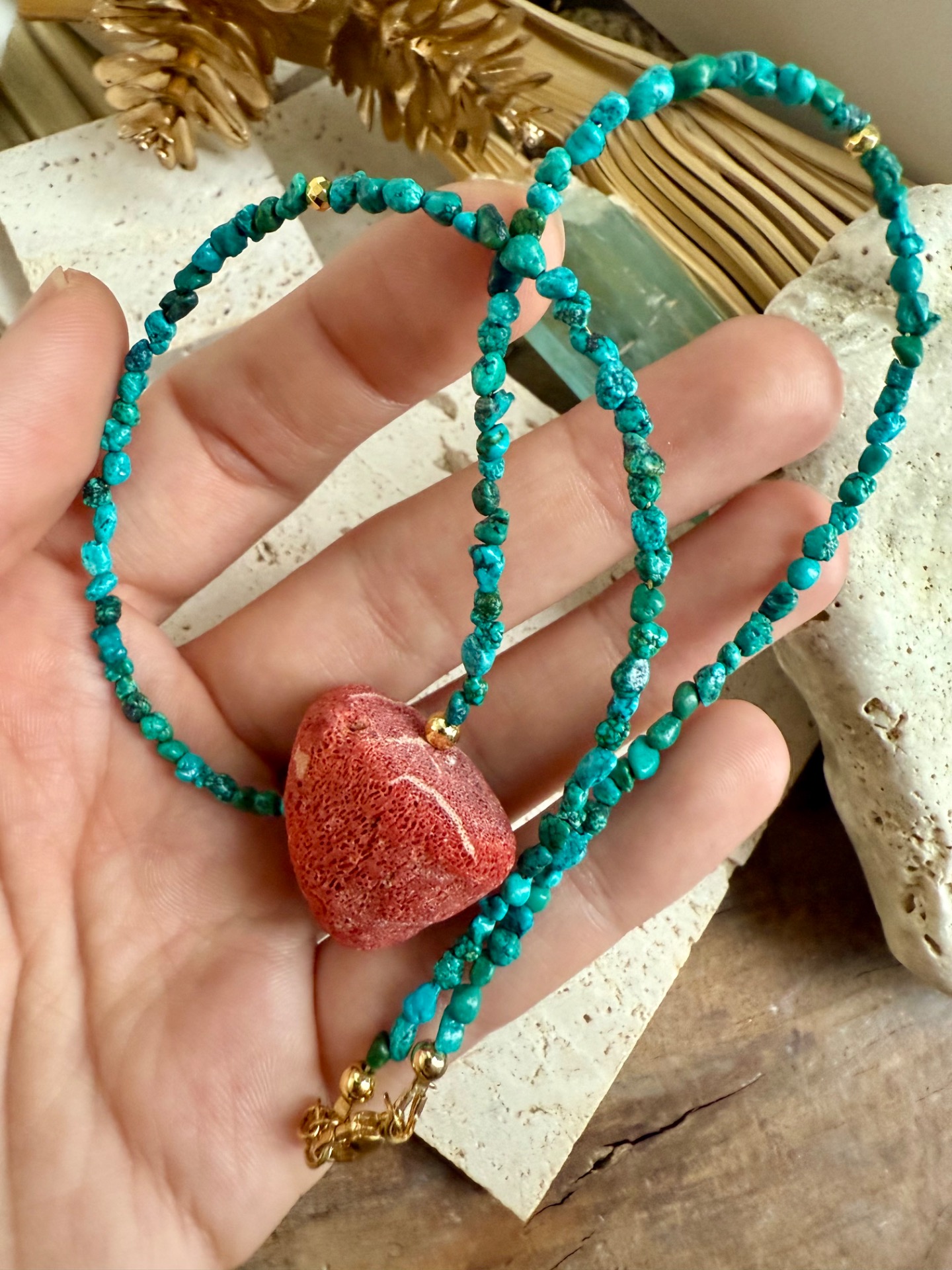 Tento výnimočný náhrdelník v sebe nesie silu oceánu aj múdrosť Zeme. Vytvorený z nepravidelných tyrkysových nugetov a doplnený o surový hubový koral, pôsobí ako talizman pre ženy, ktoré kráčajú vlastnou cestou.