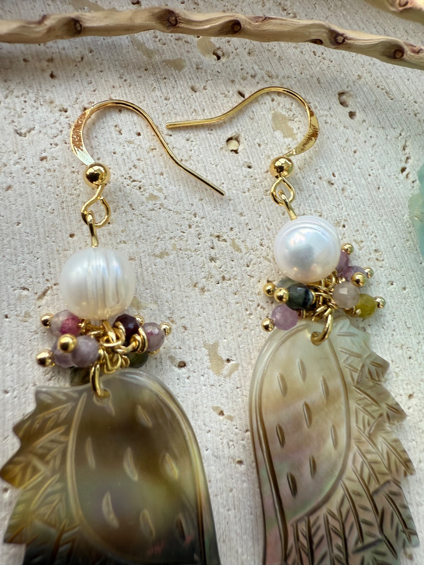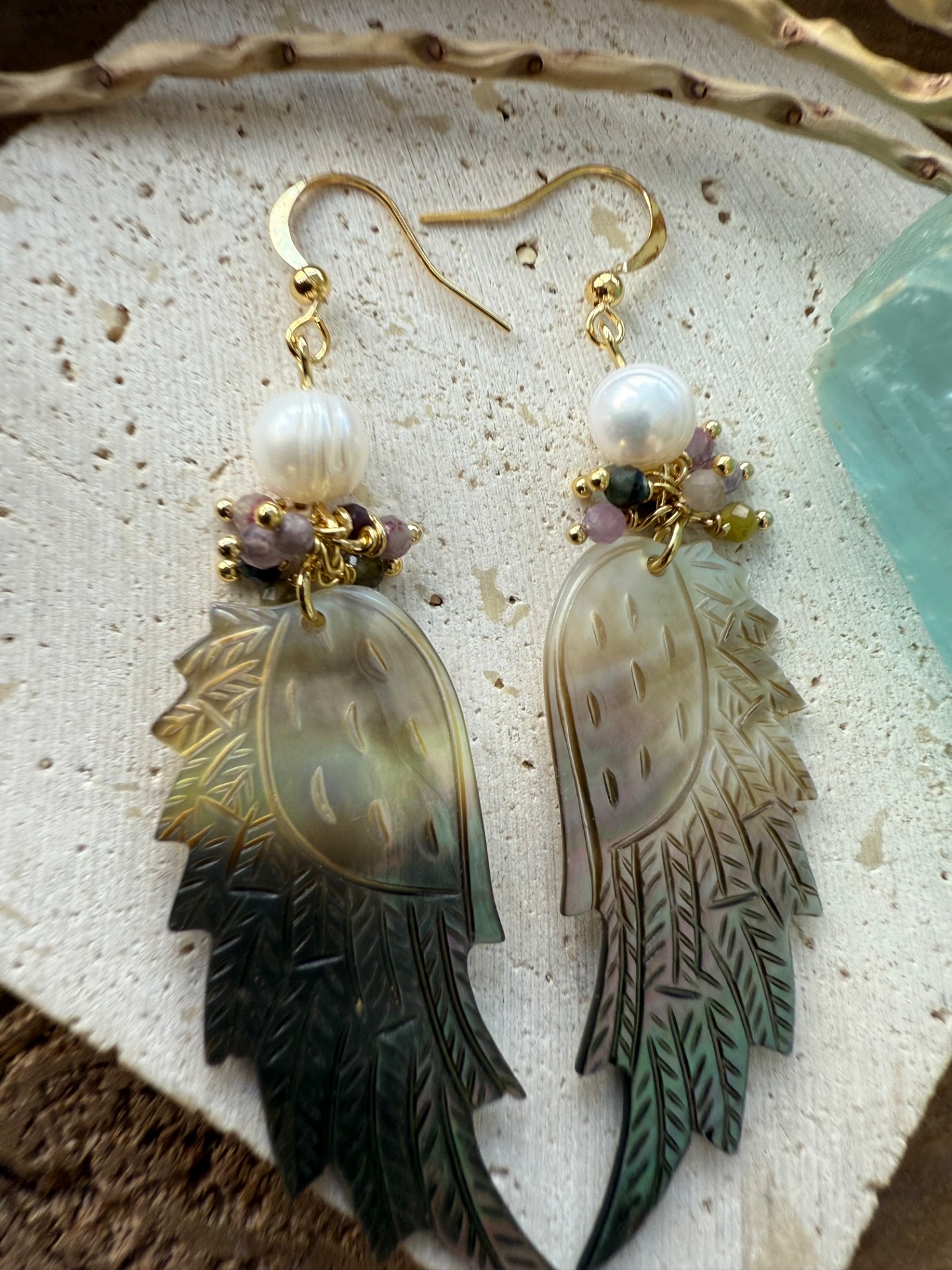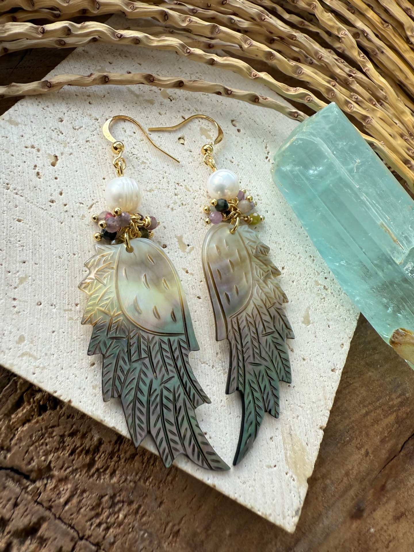 "Krídla svetla" – luxusné visiace náušnice z perlete, riečnej perly a melónového turmalínu