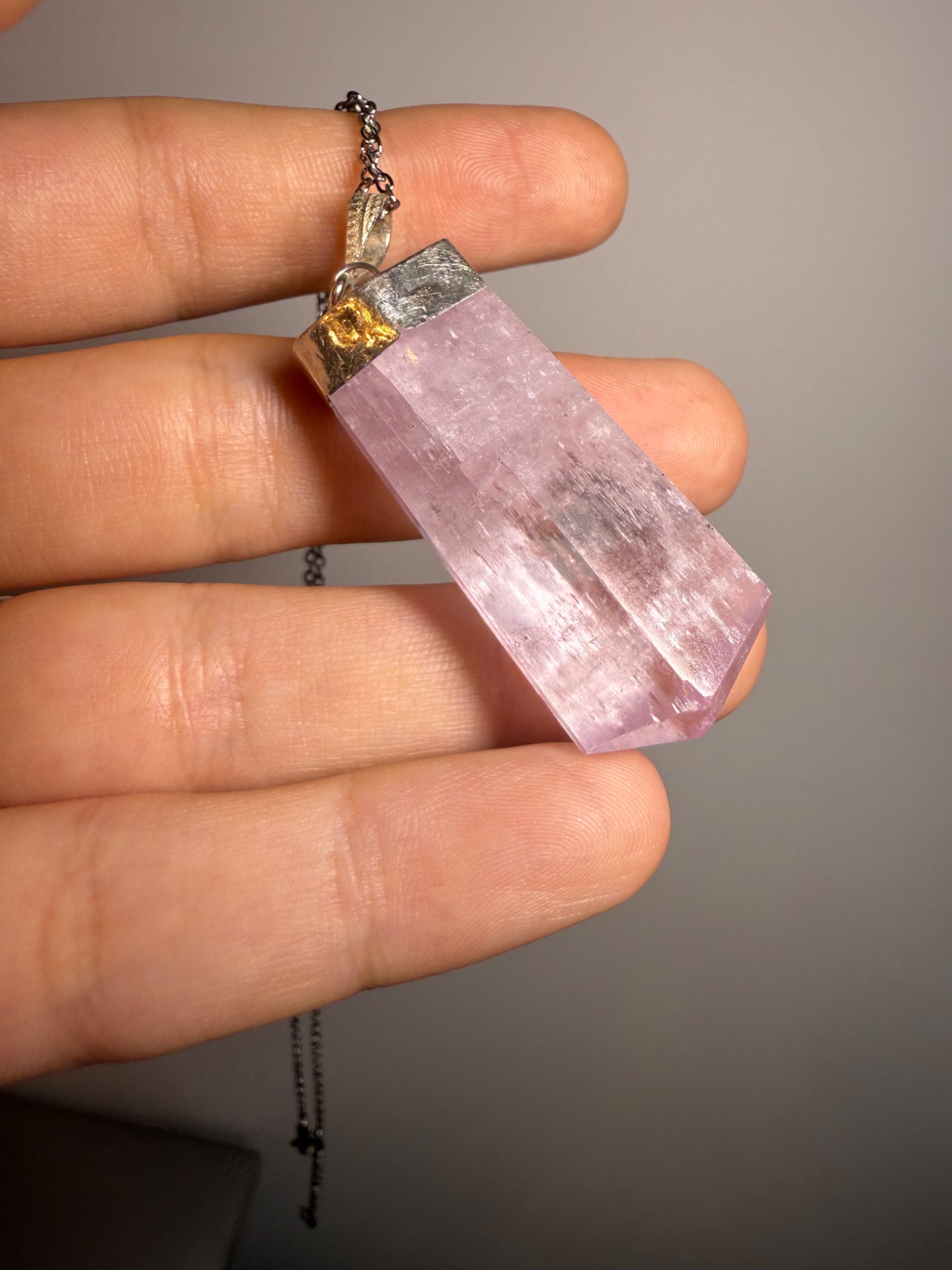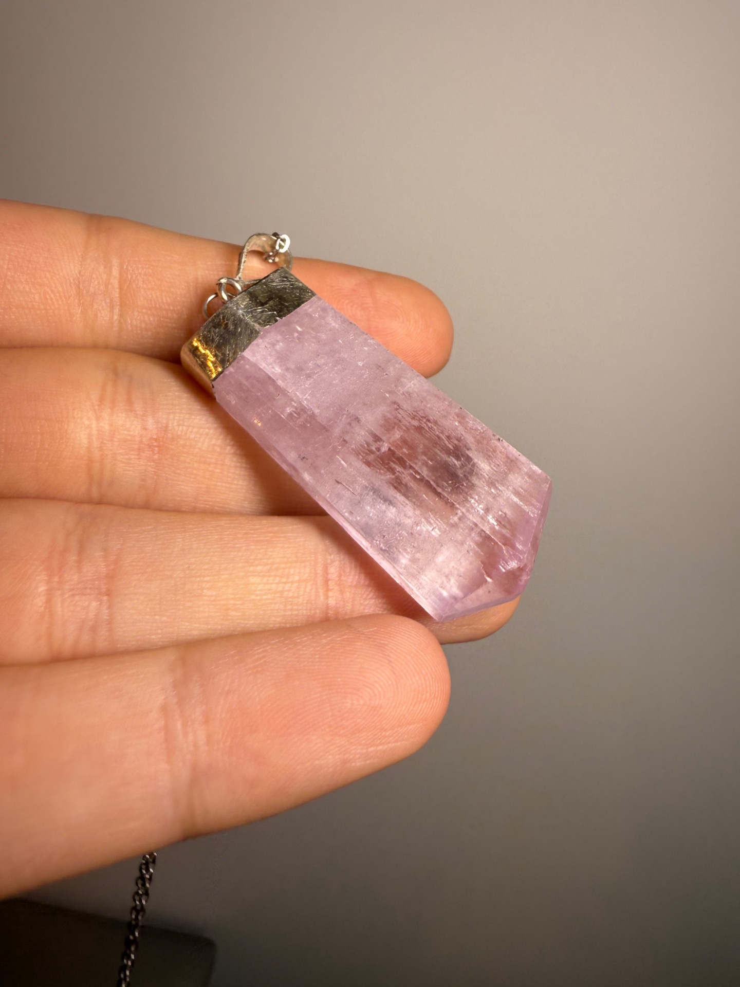 Tento výnimočný prívesok z prírodného kunzitu Top AA v surovom tvare prináša čistú, jemnú a zároveň silnú energiu srdcovej čakry. Je ručne zasadený do elegantného kovového úchytu a každý kus je úplný originál – nikde nenájdeš dva rovnaké.