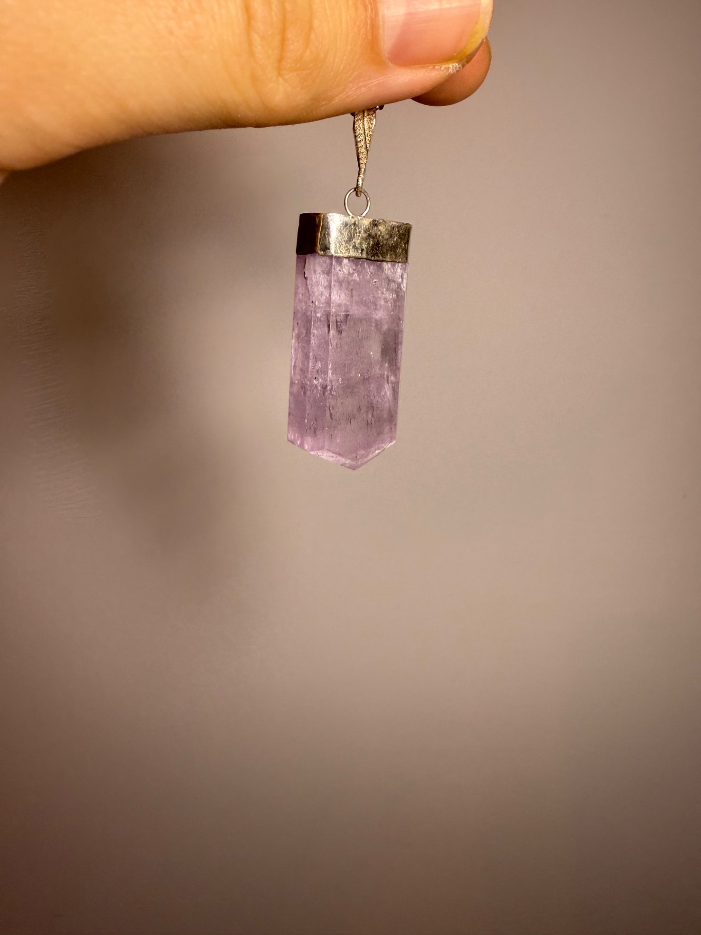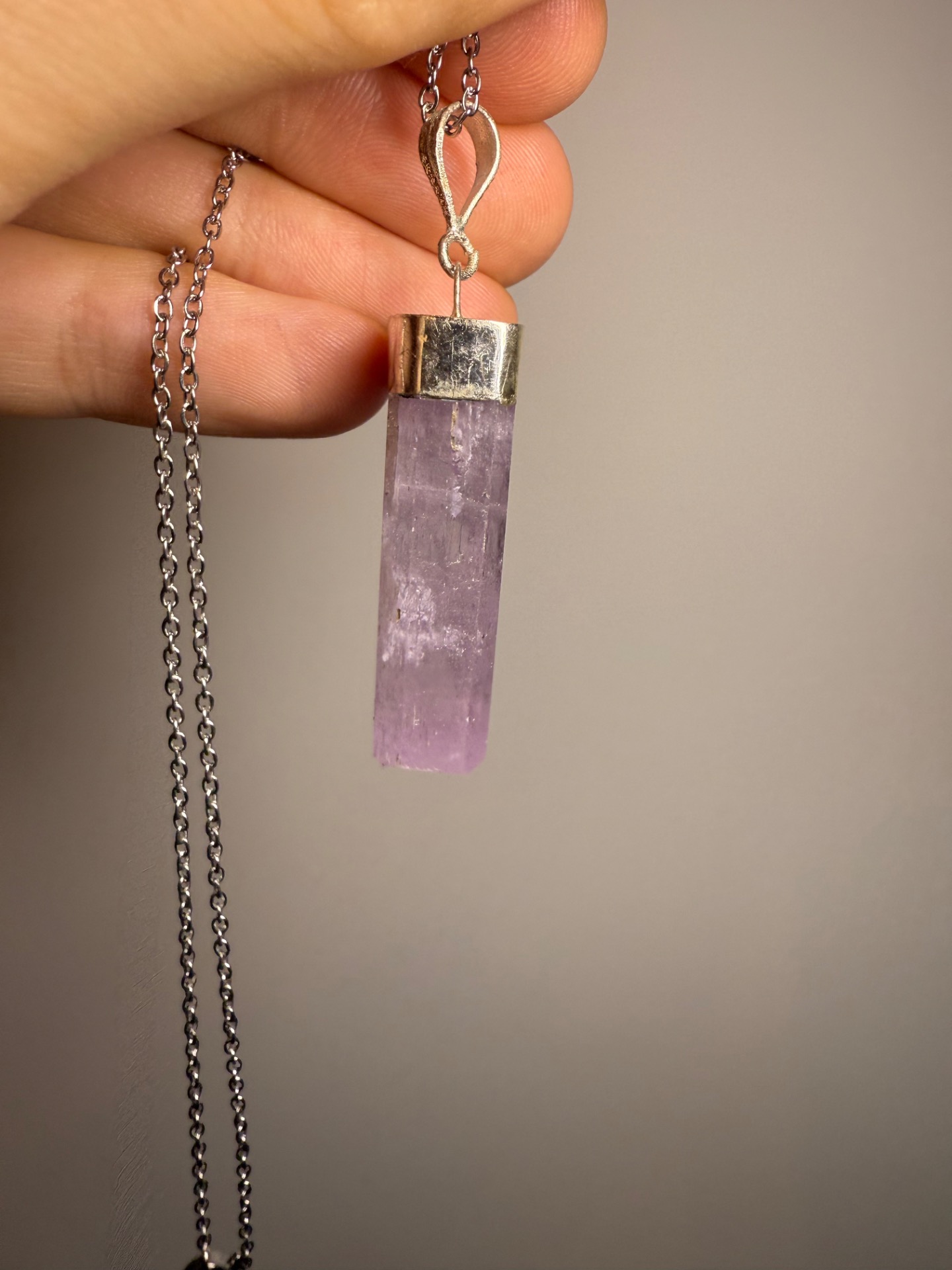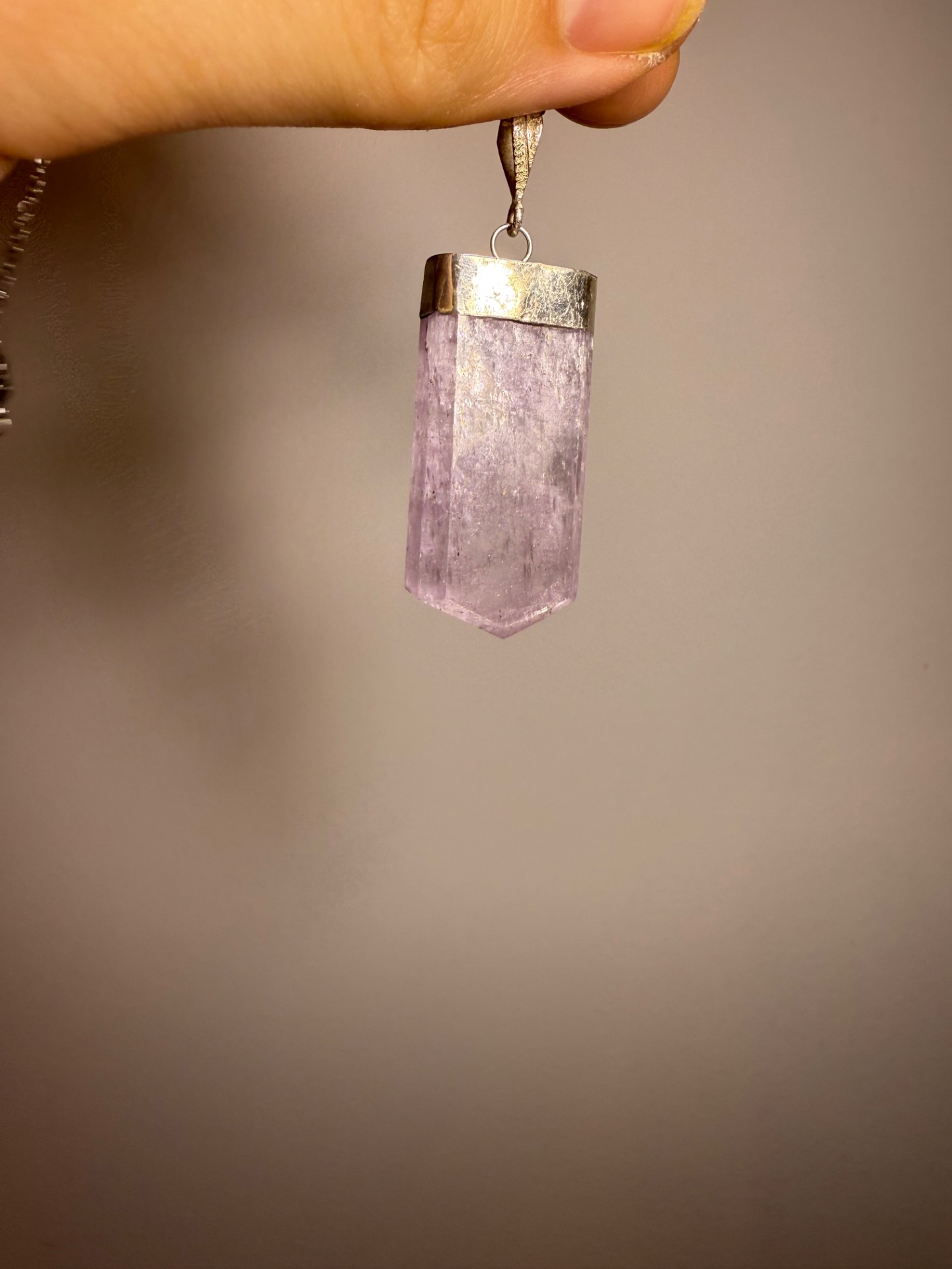Tento výnimočný prívesok z prírodného kunzitu Top AA v surovom tvare prináša čistú, jemnú a zároveň silnú energiu srdcovej čakry. Je ručne zasadený do elegantného kovového úchytu a každý kus je úplný originál – nikde nenájdeš dva rovnaké.