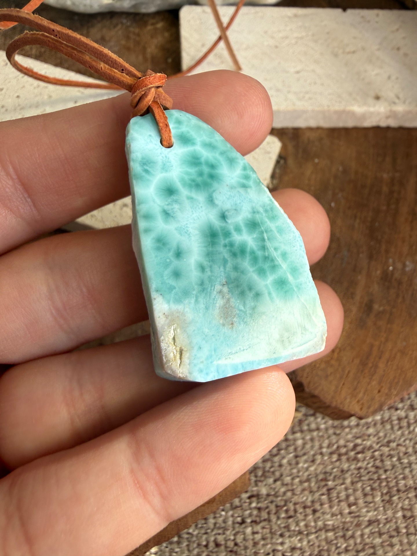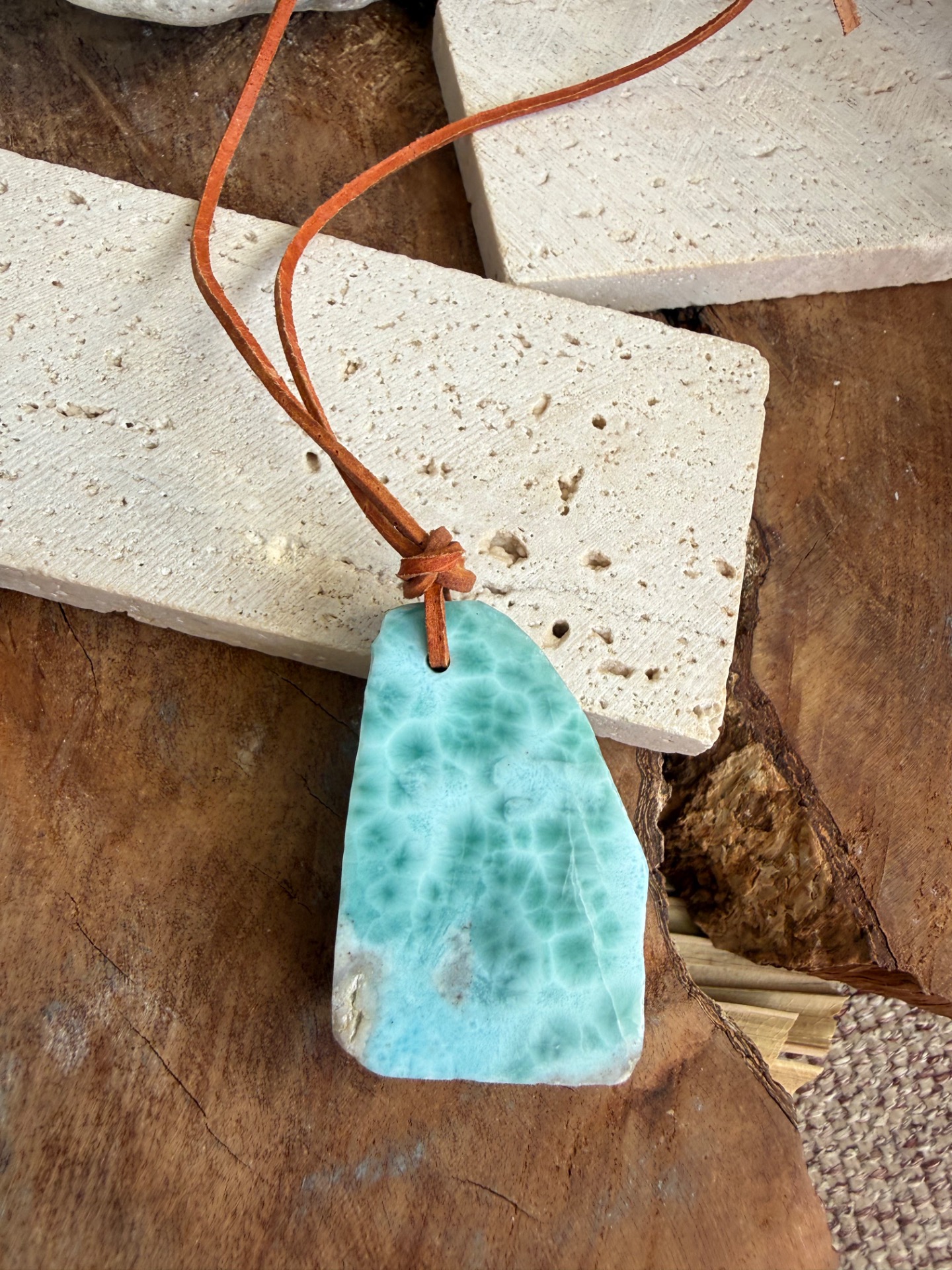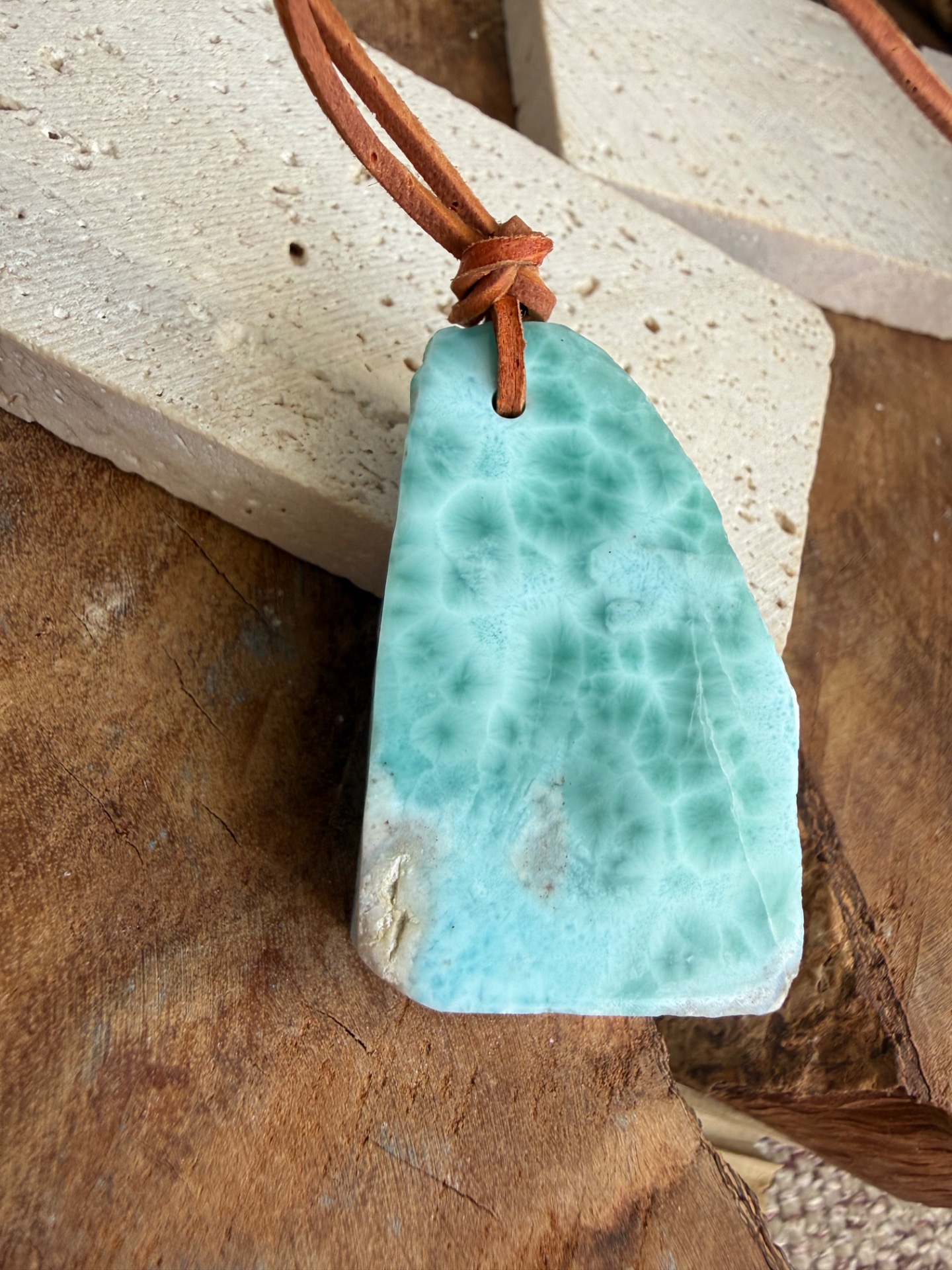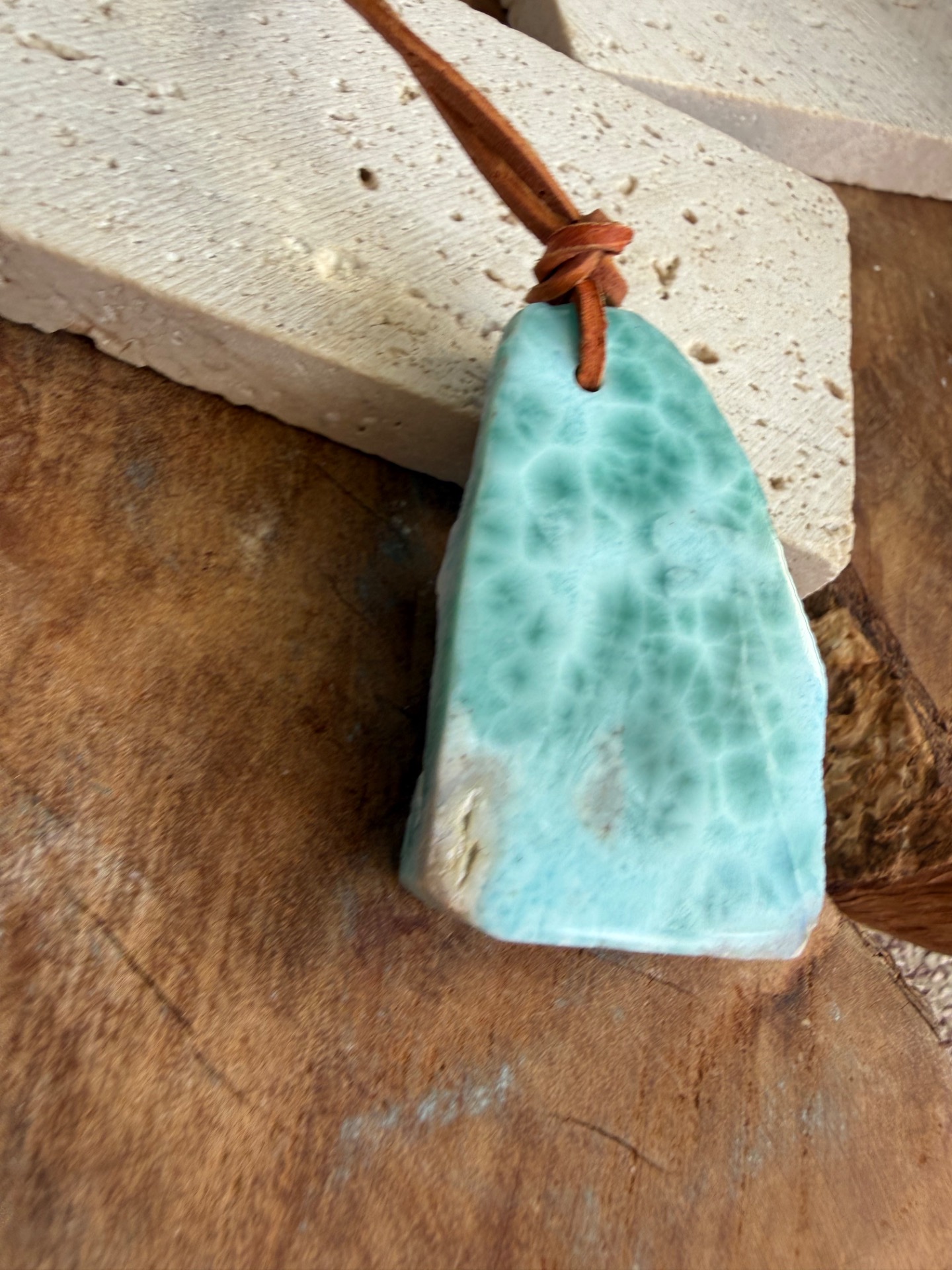 Boky kameňa sú ponechané v prirodzenej, nedobrúsenej forme, čo dodáva prívesku autentickosť a prirodzenú krásu. Jemná koženka ho dopĺňa, takže pôsobí ako talizman z iného času – akoby patril starobylým kňažkám, ktoré načúvali volaniu mora a pracovali s jeho energiou.