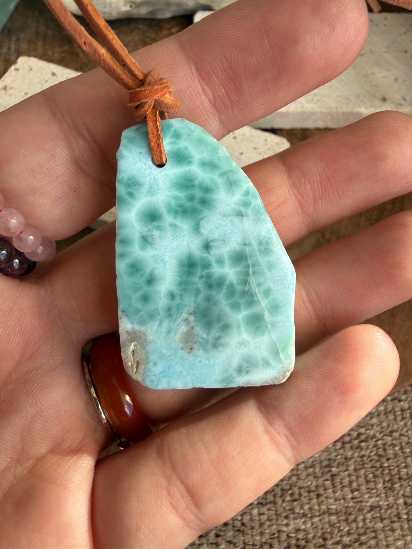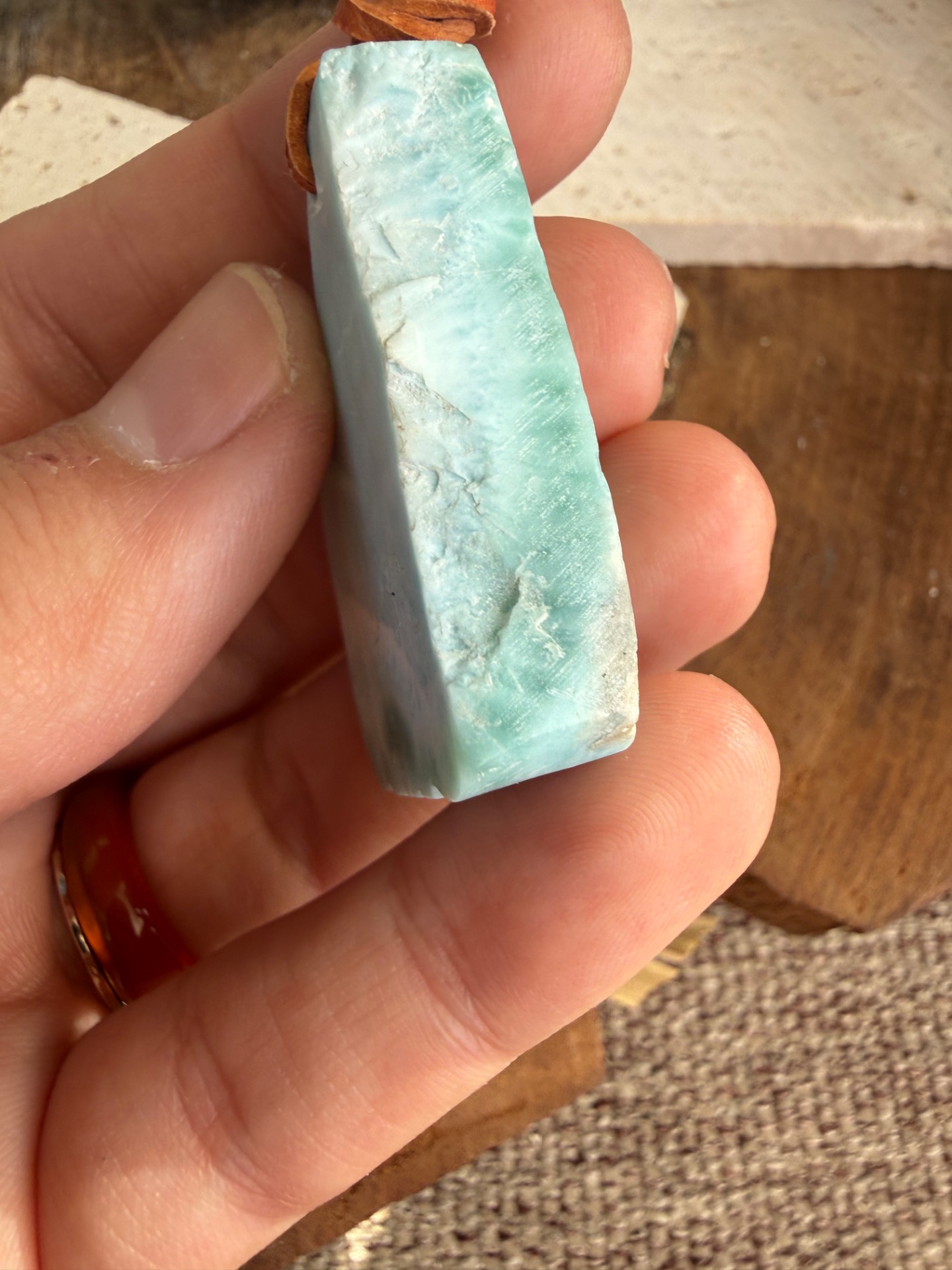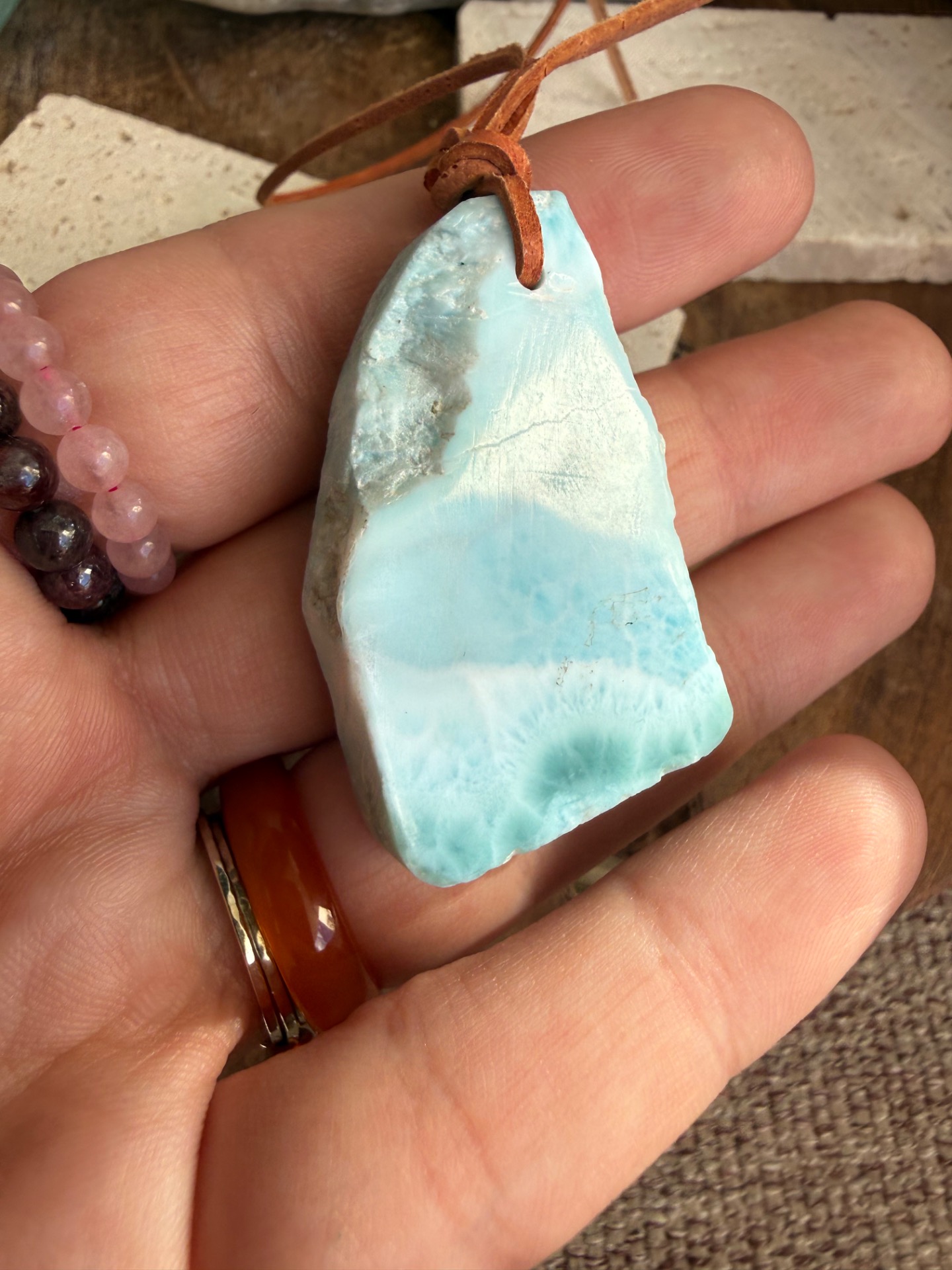 Boky kameňa sú ponechané v prirodzenej, nedobrúsenej forme, čo dodáva prívesku autentickosť a prirodzenú krásu. Jemná koženka ho dopĺňa, takže pôsobí ako talizman z iného času – akoby patril starobylým kňažkám, ktoré načúvali volaniu mora a pracovali s jeho energiou.