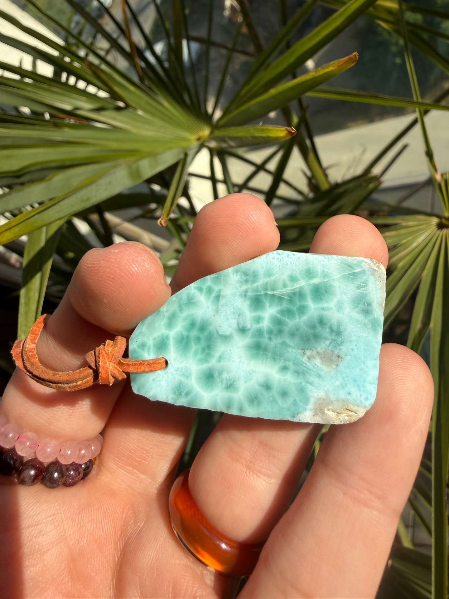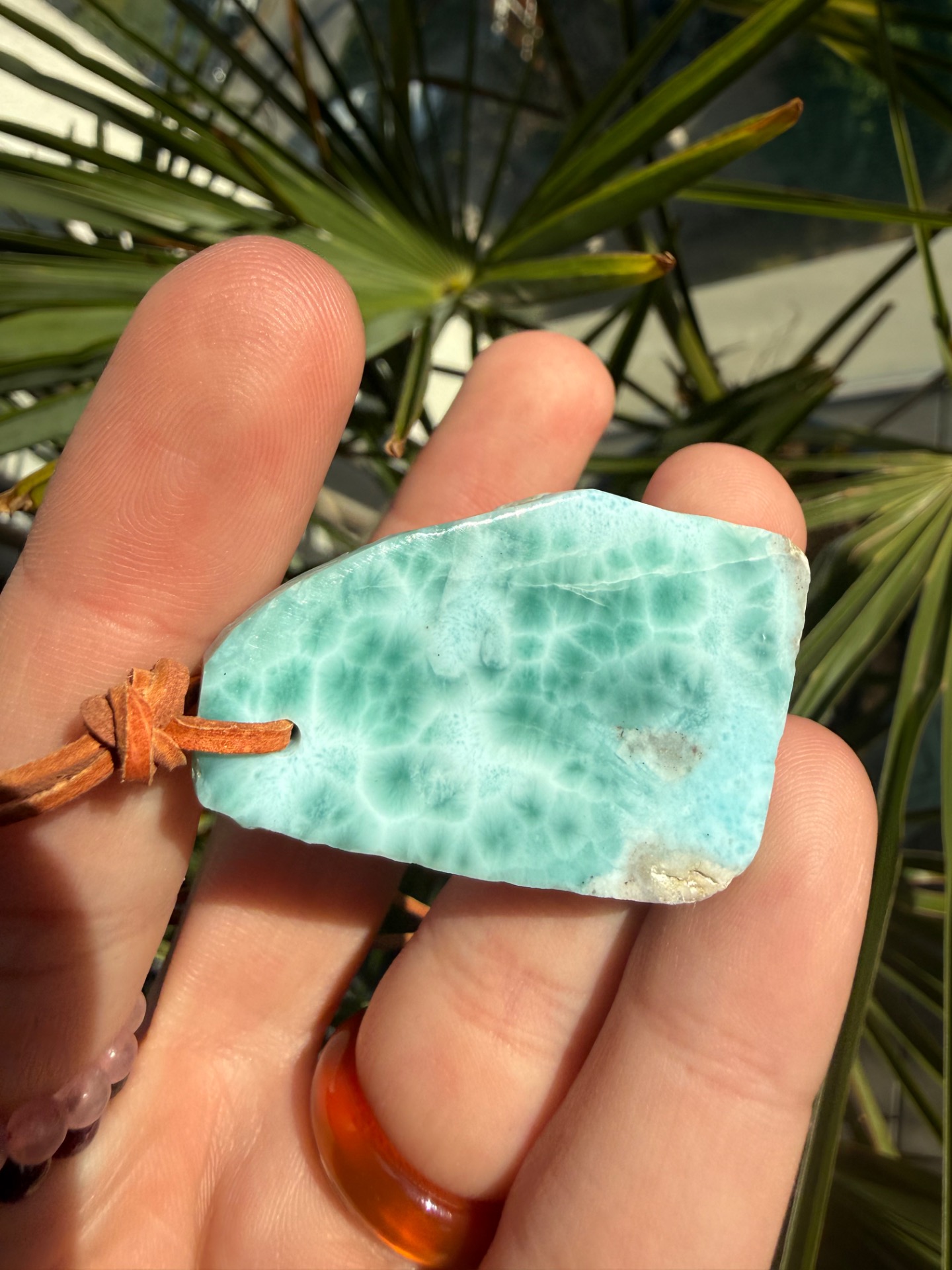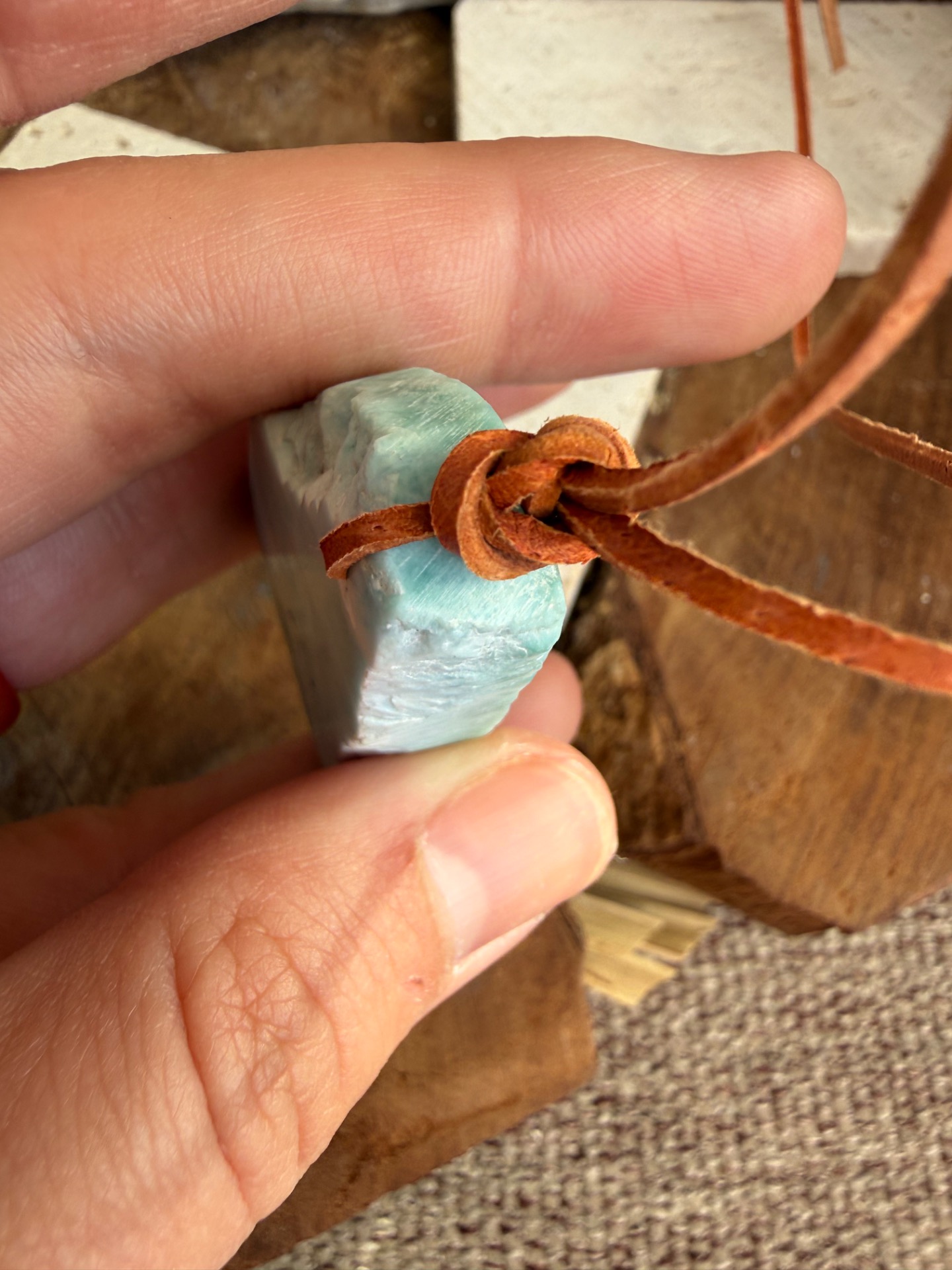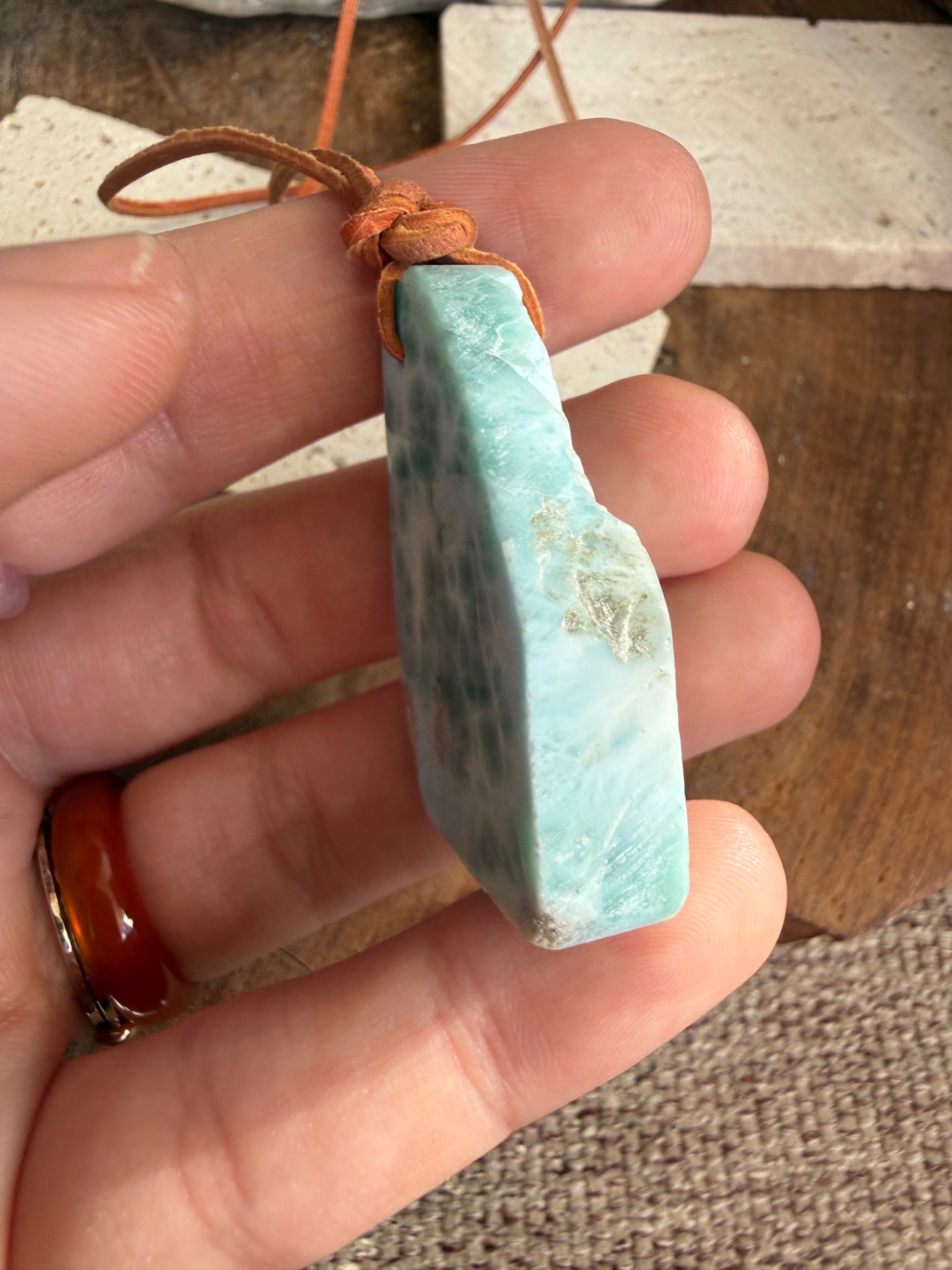 Boky kameňa sú ponechané v prirodzenej, nedobrúsenej forme, čo dodáva prívesku autentickosť a prirodzenú krásu. Jemná koženka ho dopĺňa, takže pôsobí ako talizman z iného času – akoby patril starobylým kňažkám, ktoré načúvali volaniu mora a pracovali s jeho energiou.