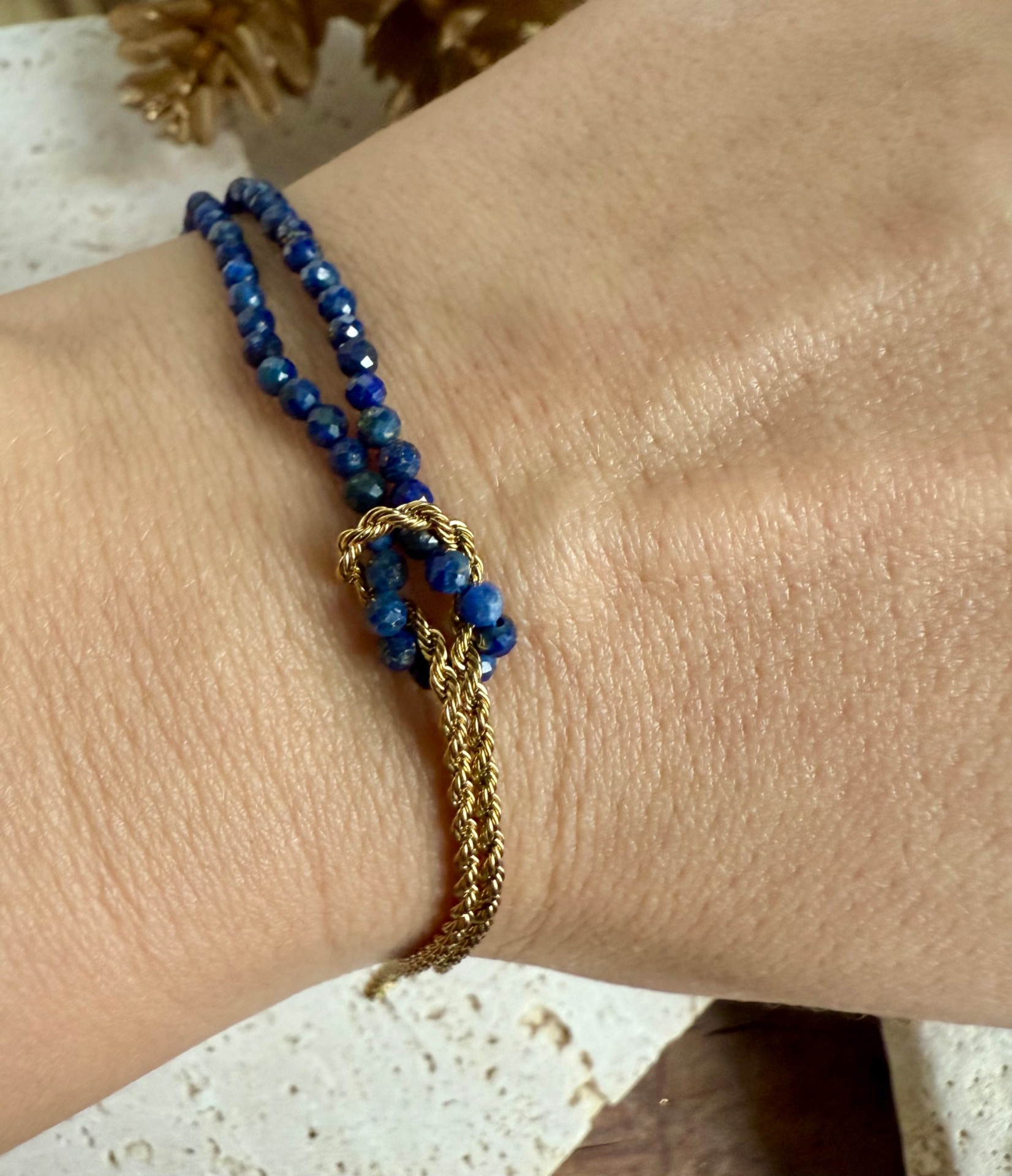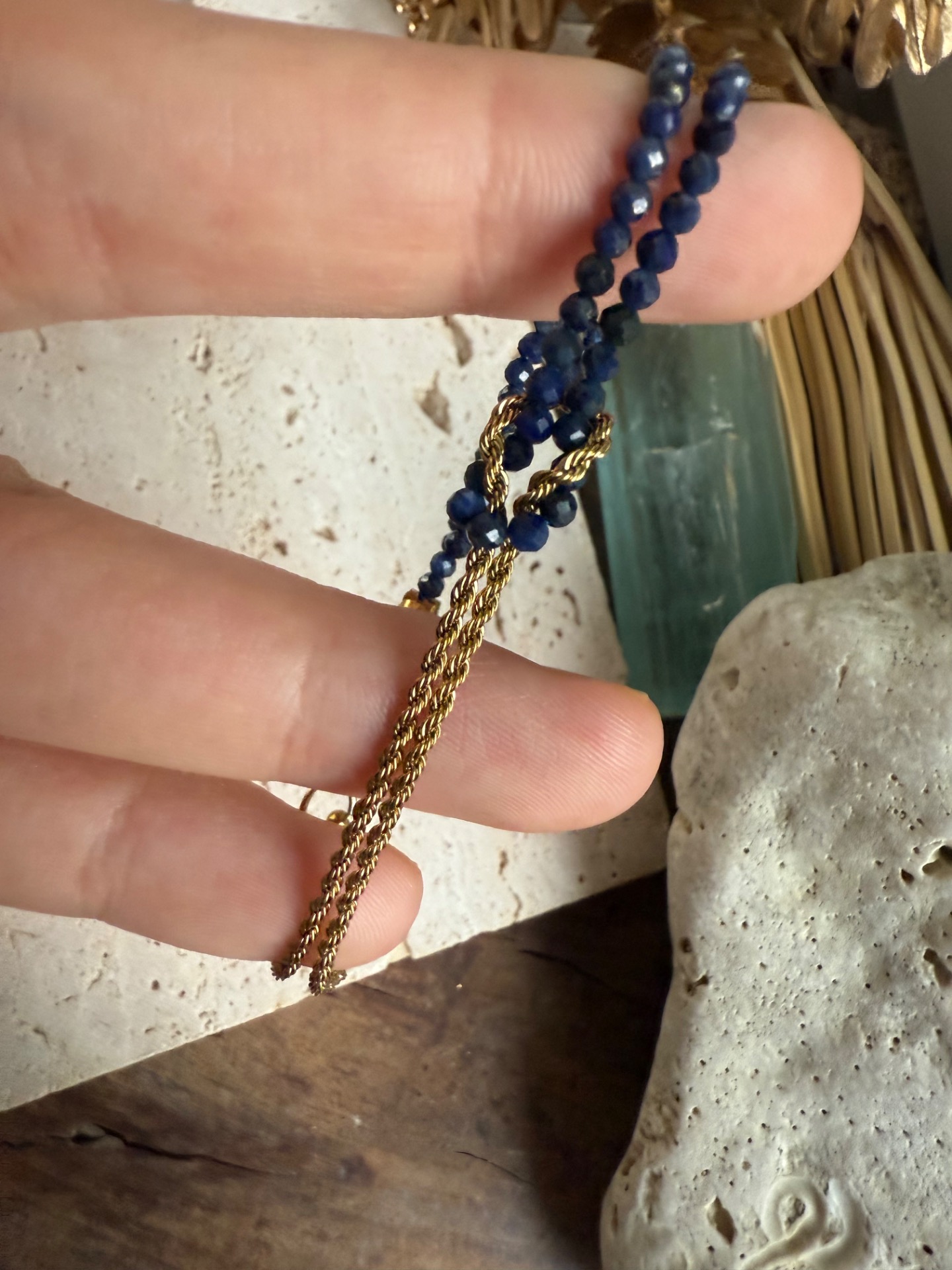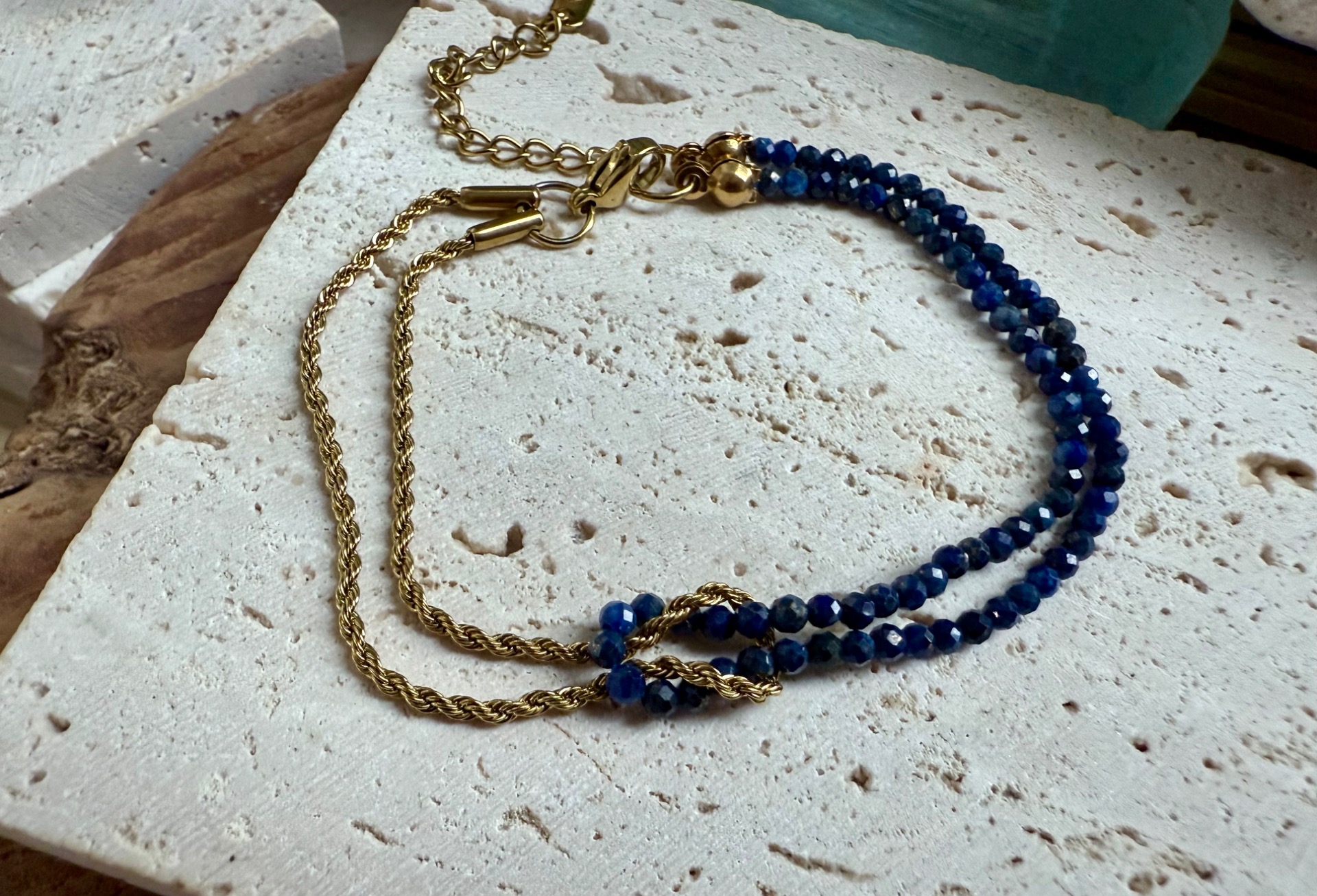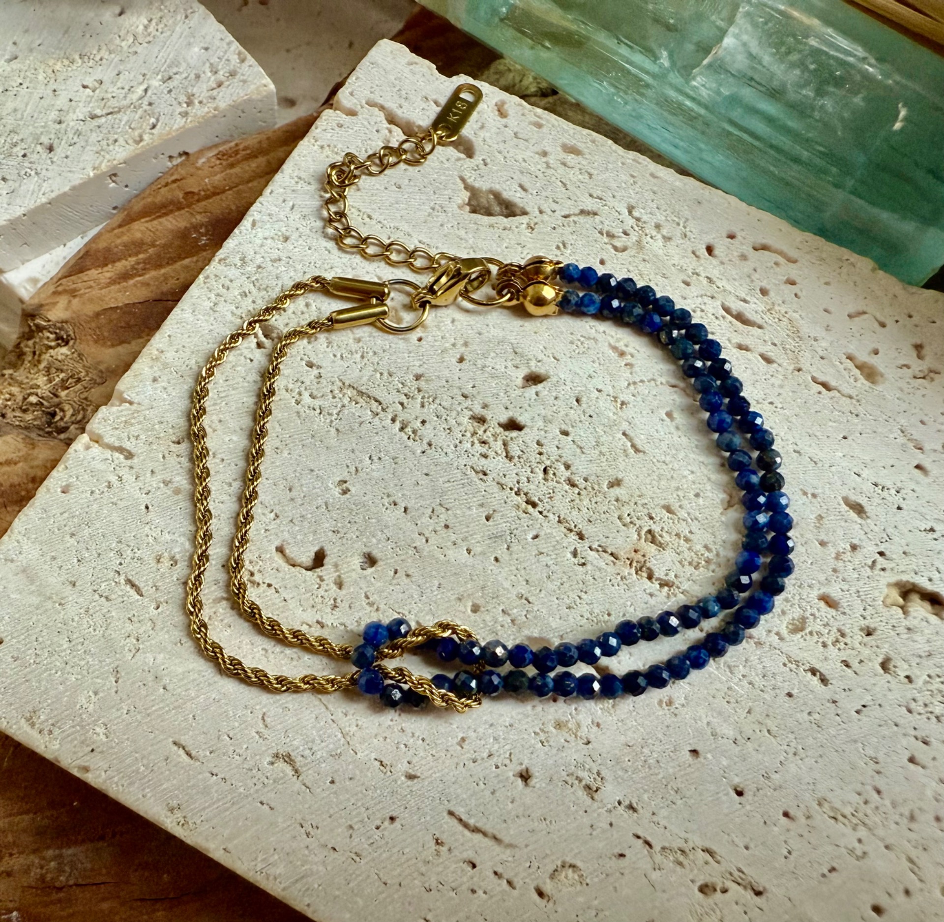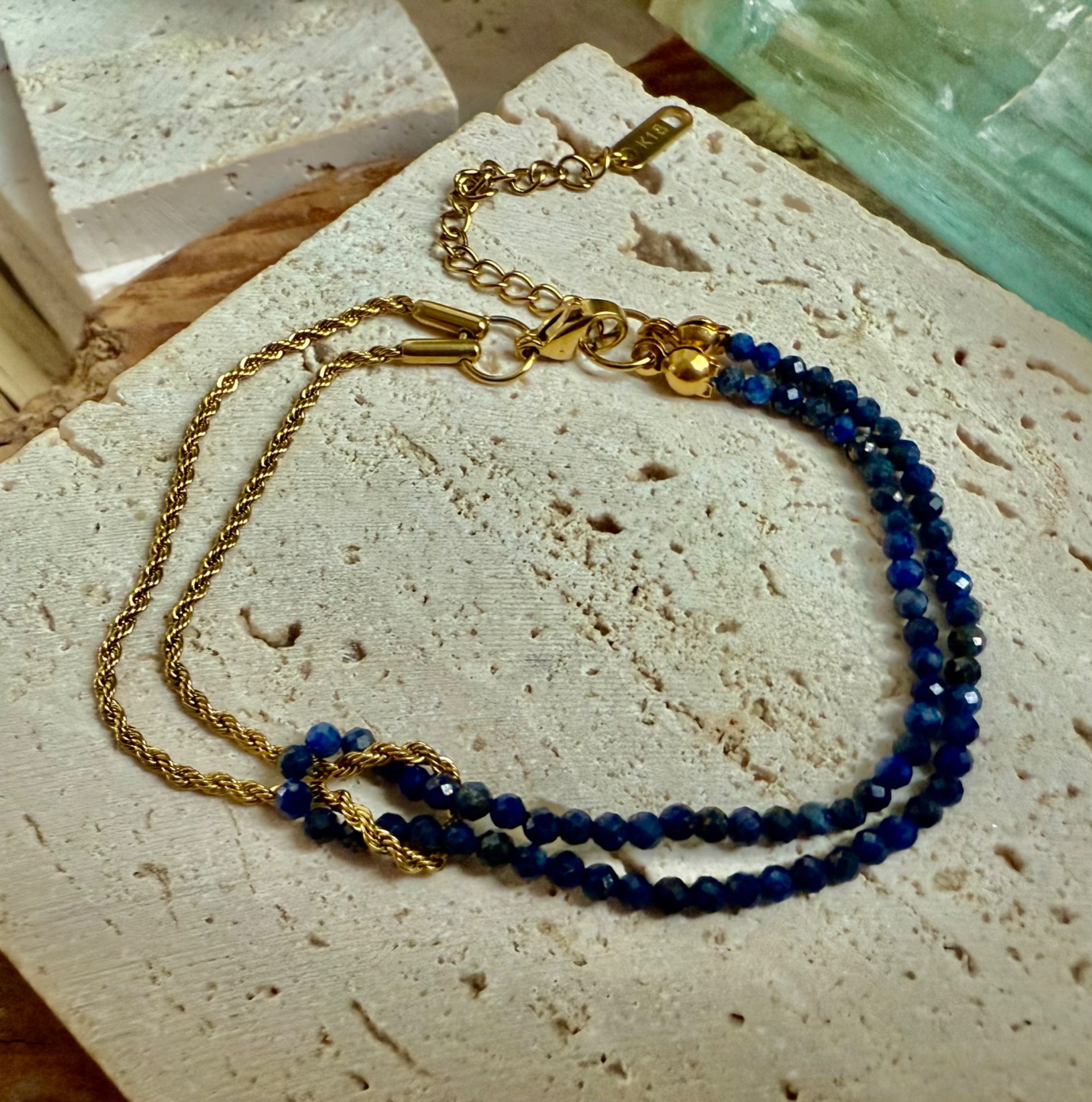 Elegantný dvojitý náramok, kde jemné 2 mm korálky lapisu lazuli ladia so zlatou nerezovou oceľou. Dvojradová retiazka spojená uzlom v strede, s predlžovacou retiazkou 5 cm, umožňuje univerzálne prispôsobenie.