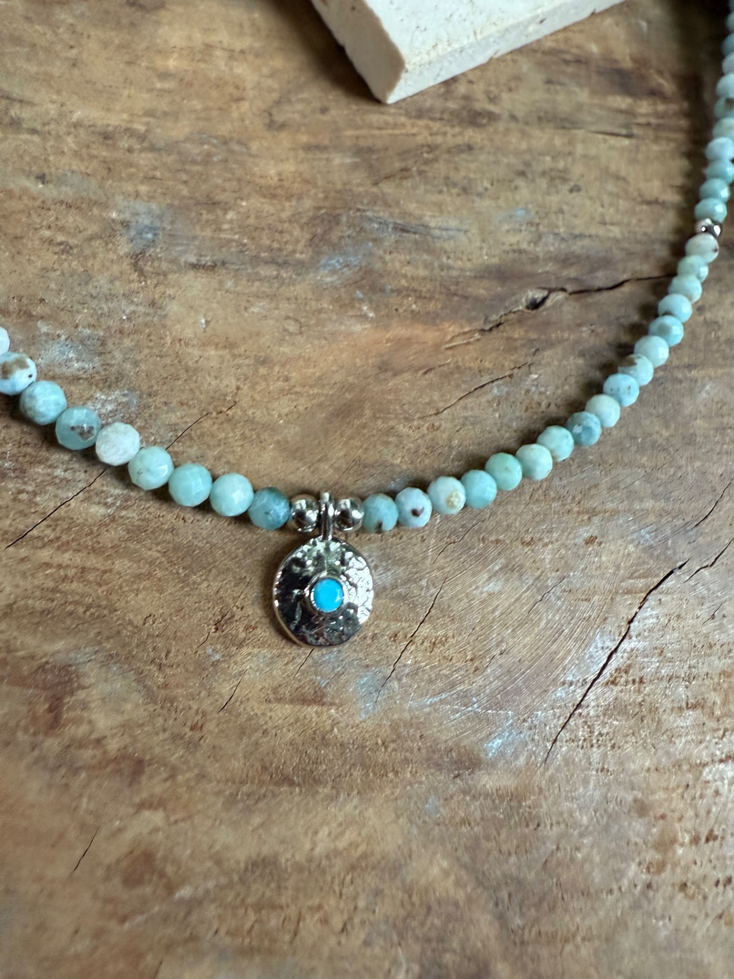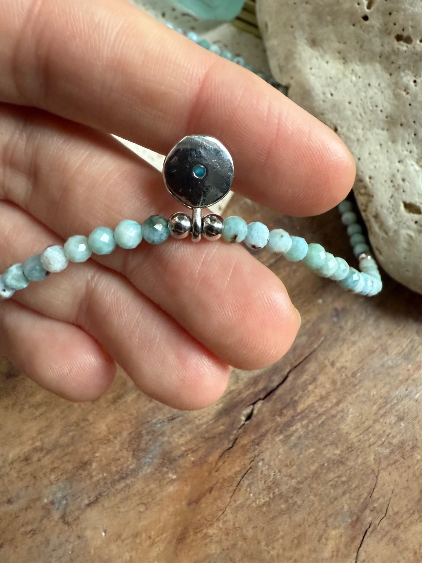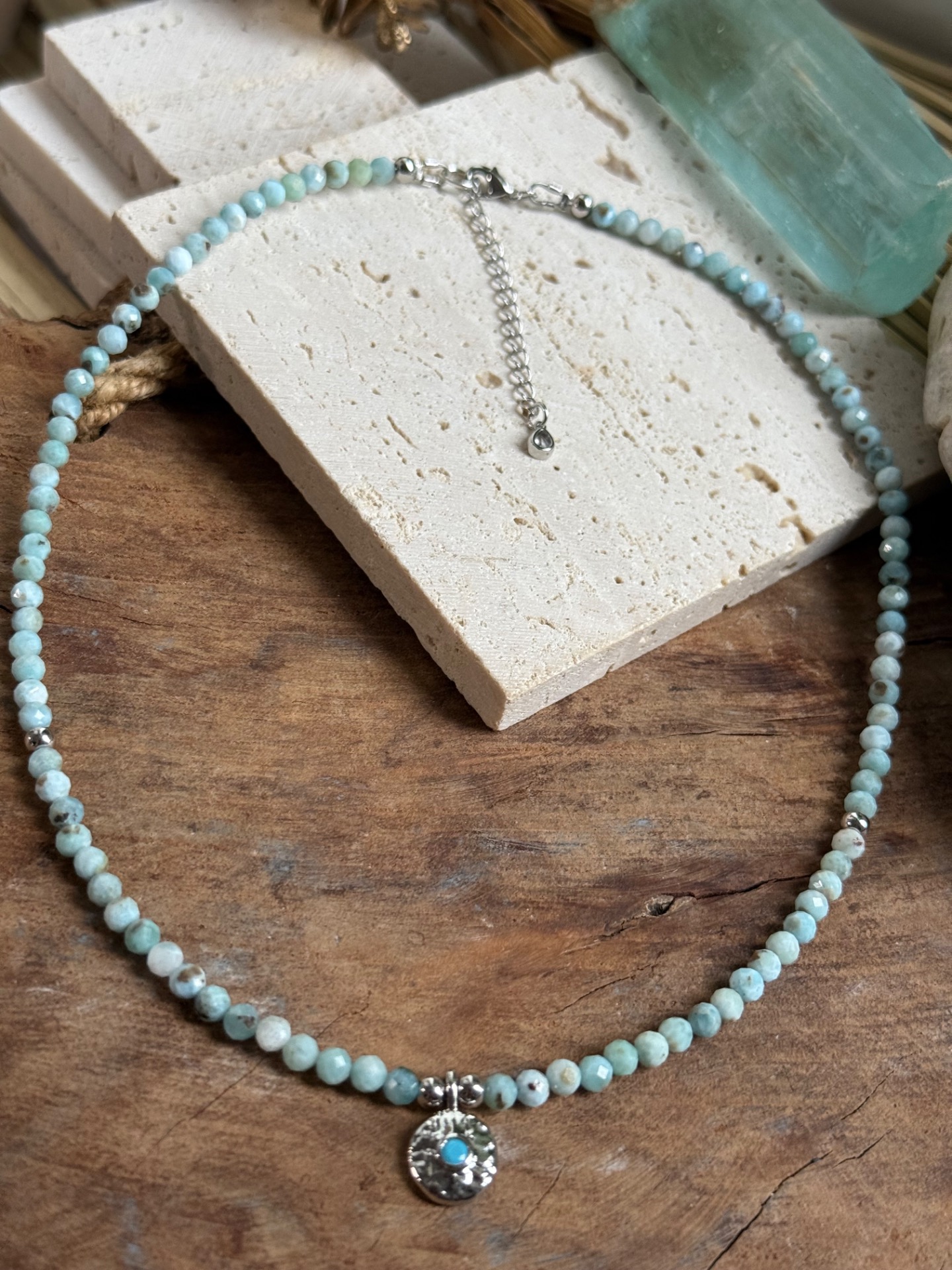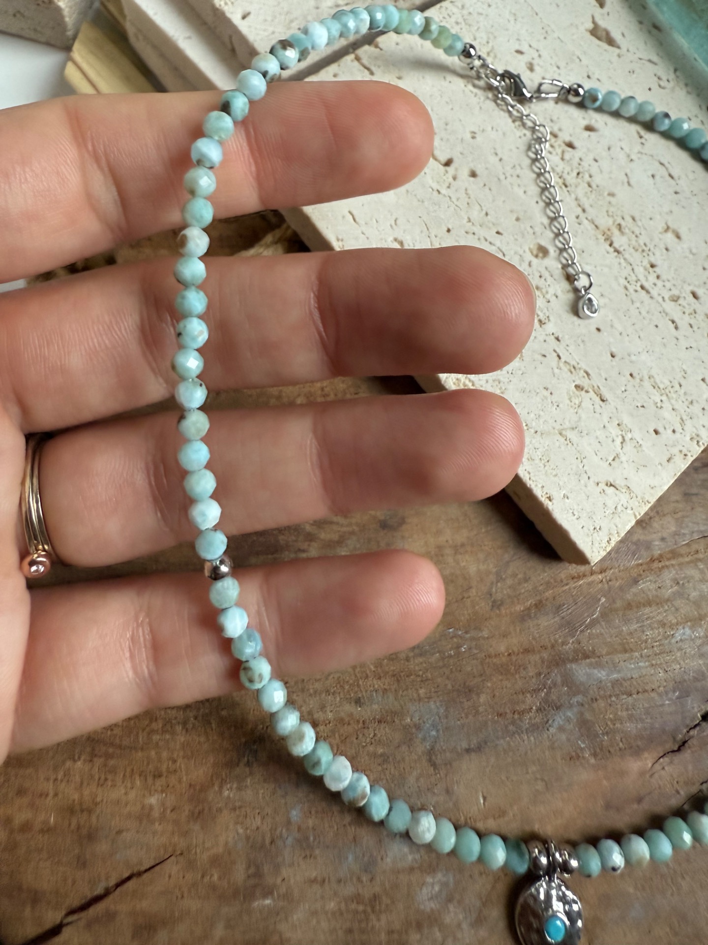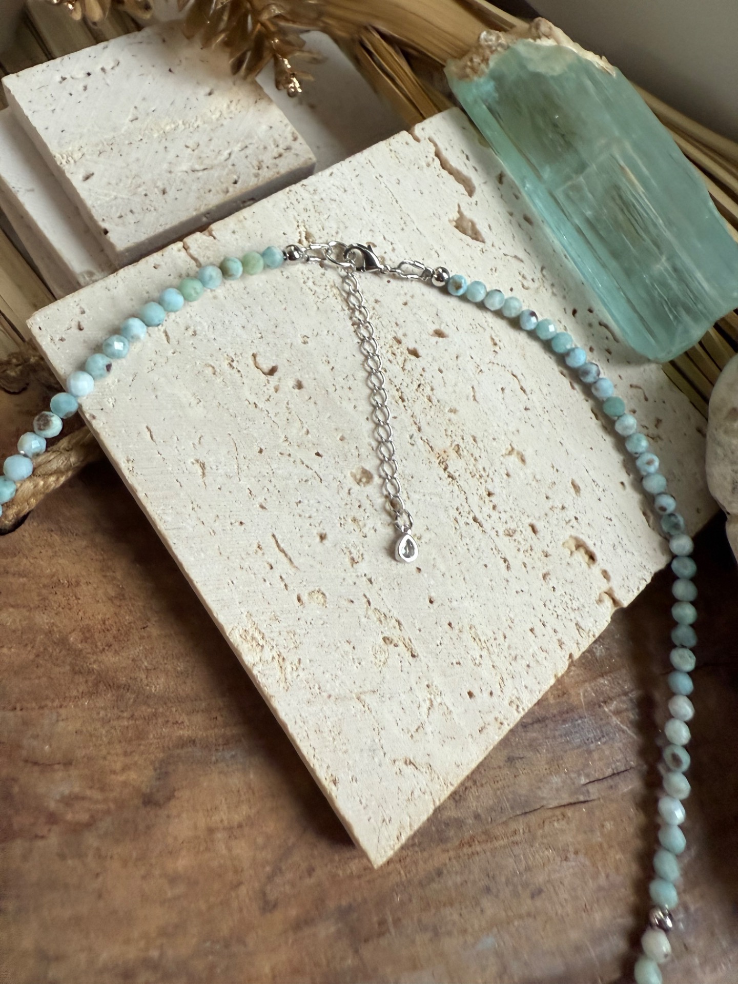 Tento jemný náhrdelník z larimaru v 4 mm fazetovom výbruse pripomína pokojné vlny tropického mora. Svetlé odtiene modrej a jemnej bielej vytvárajú harmonický a upokojujúci vzhľad, ktorý pôsobí ľahko a étericky.
