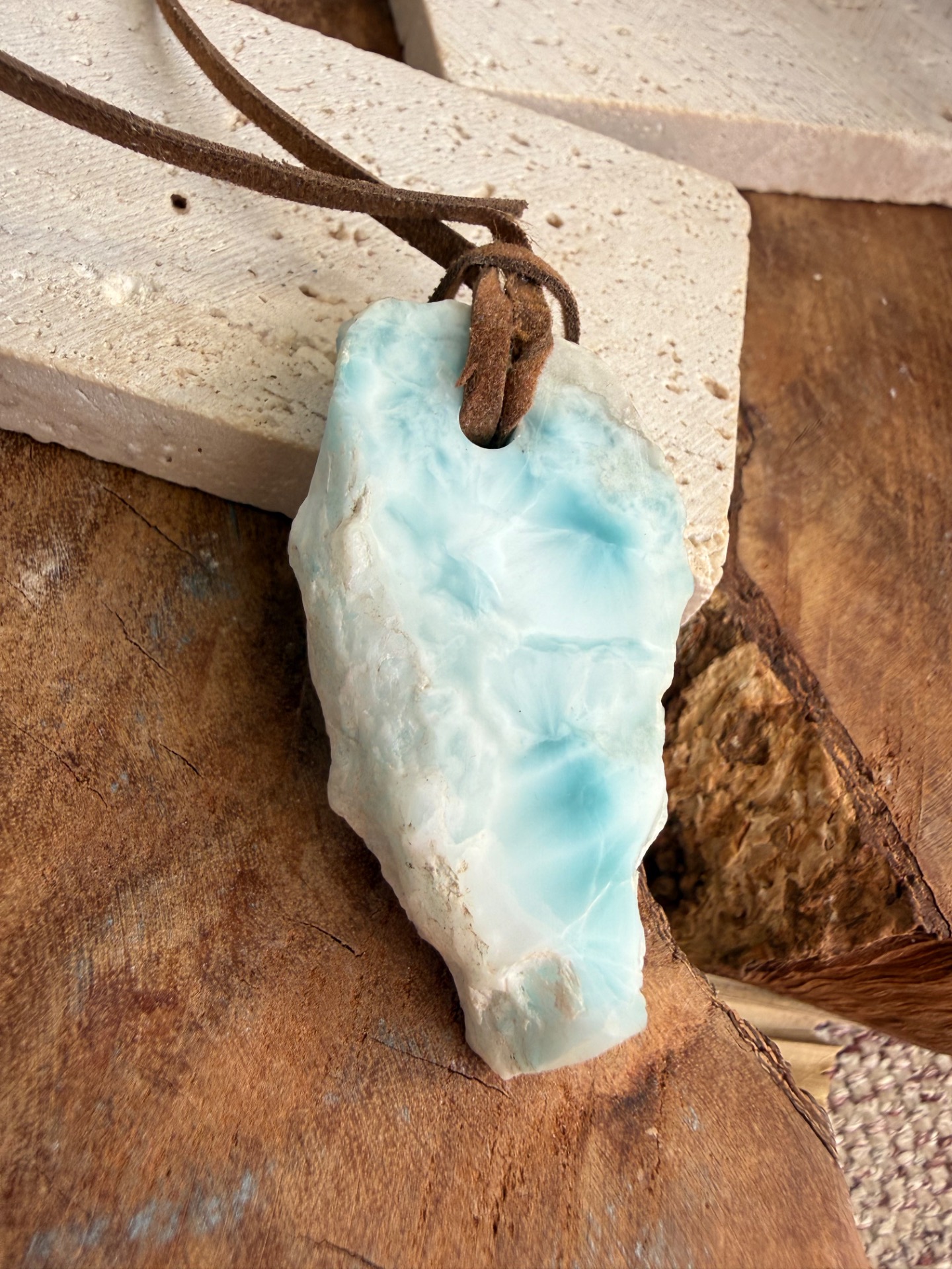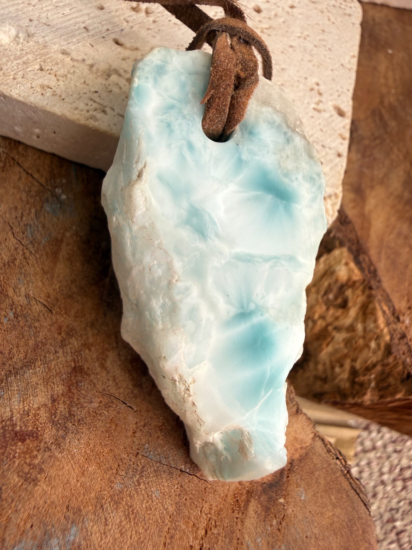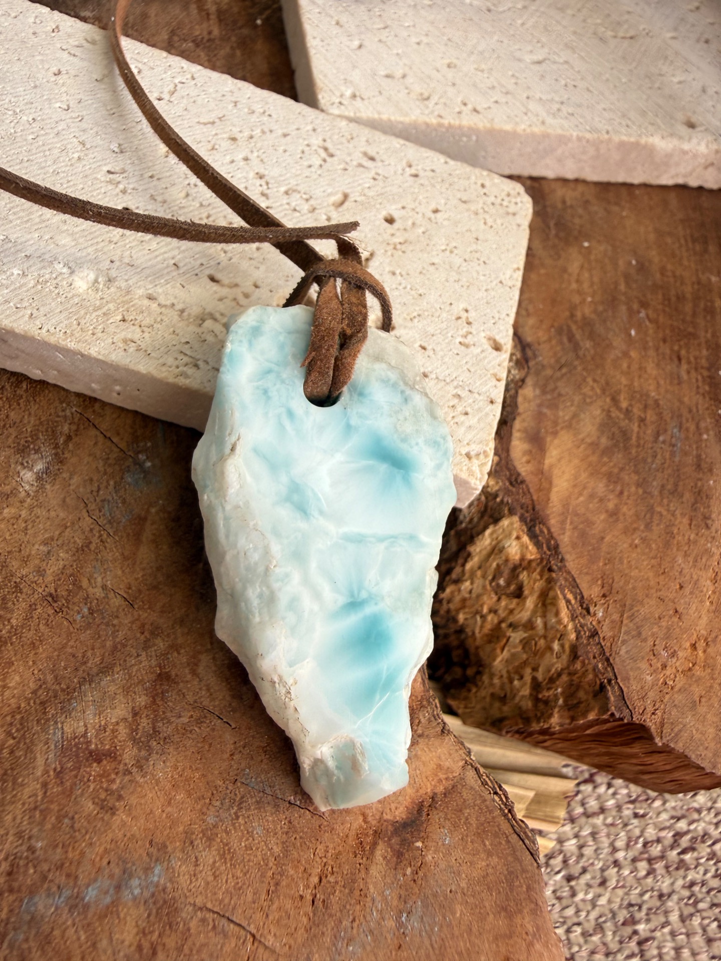Boky kameňa sú ponechané v prirodzenej, nedobrúsenej forme – autentické, pravdivé a nesúce energiu času. Jemná koženka ho dopĺňa a premieňa na talizman, ktorý spája minulosť, prítomnosť a tvoju vnútornú múdrosť.
