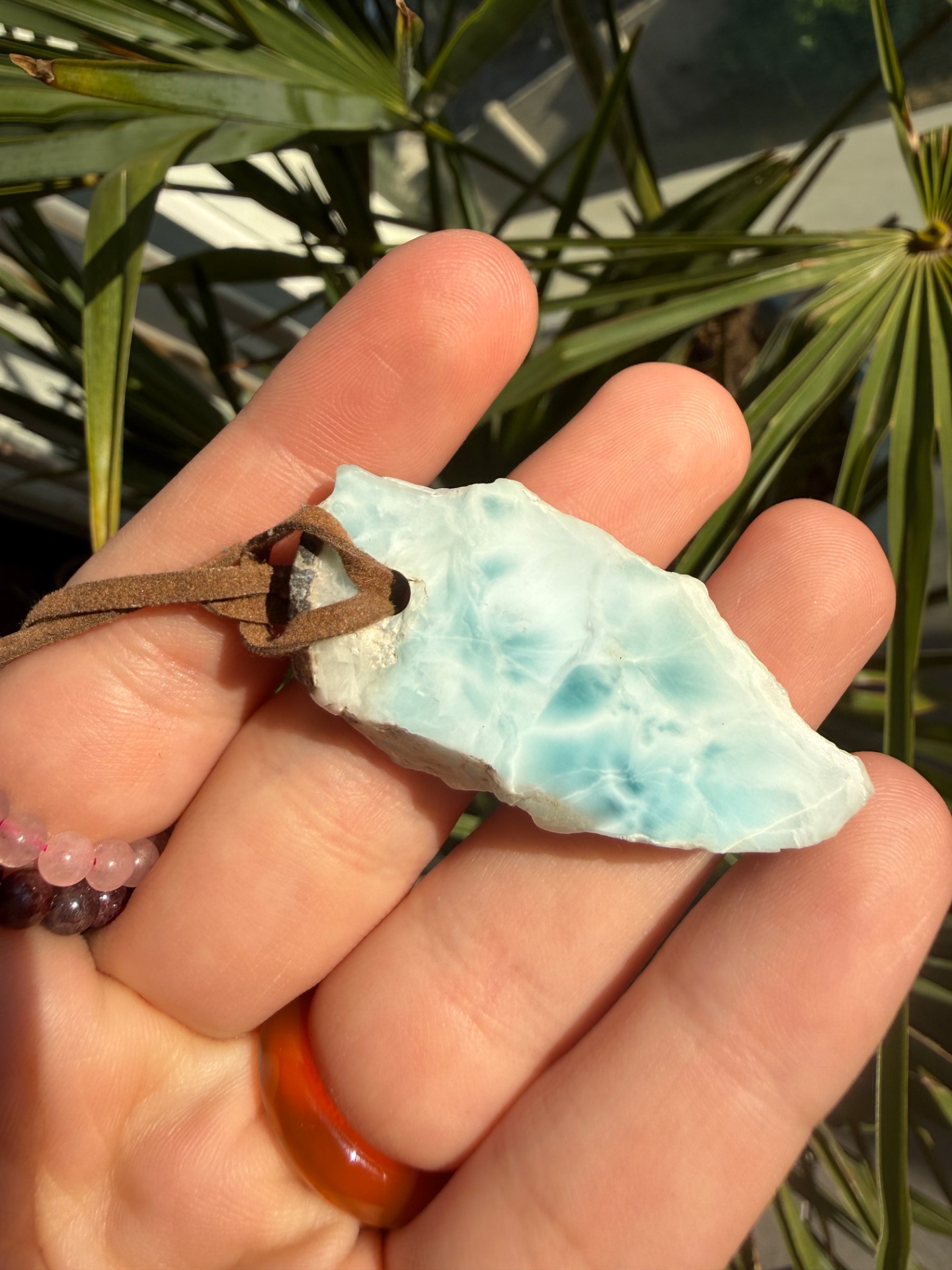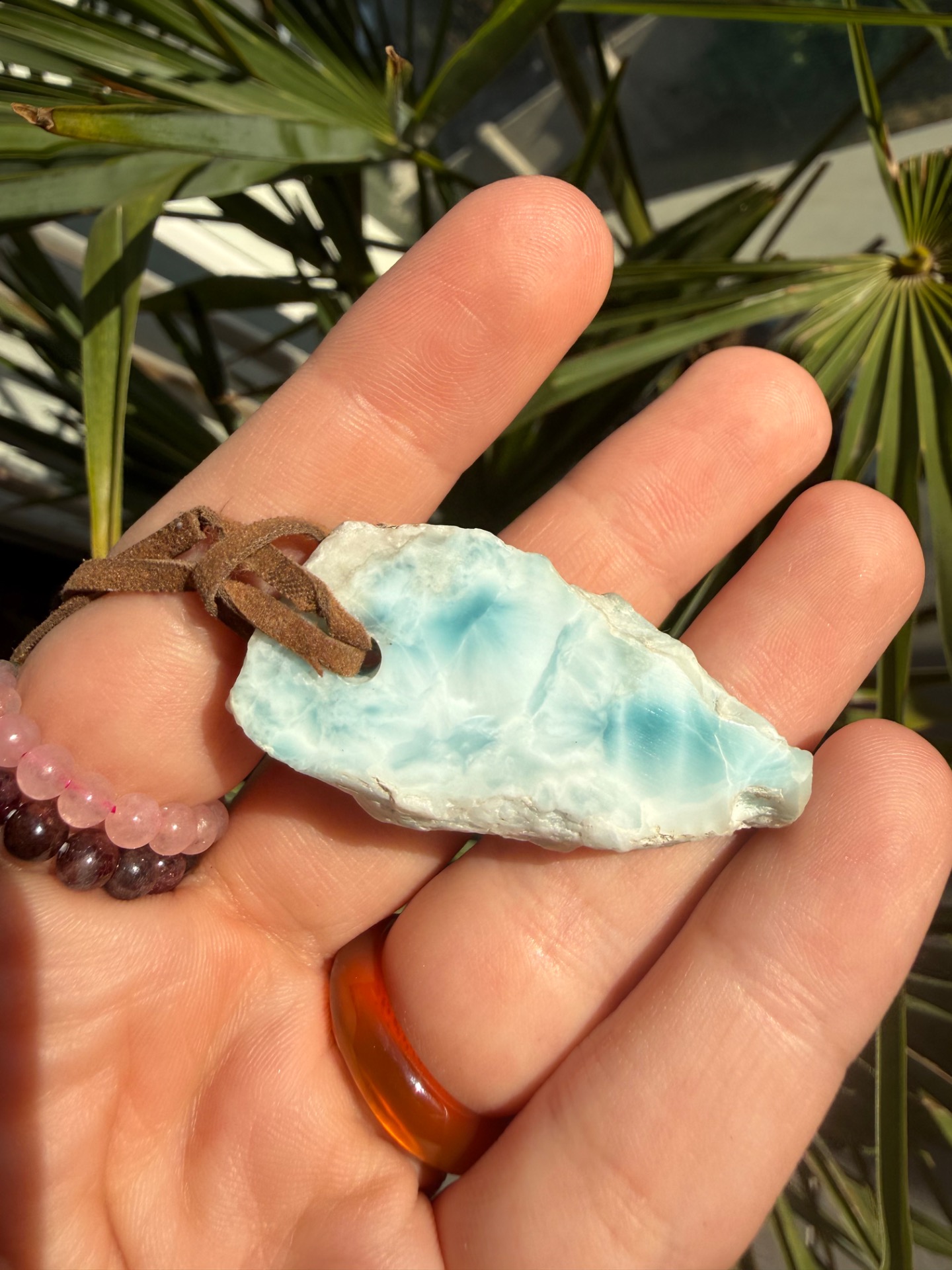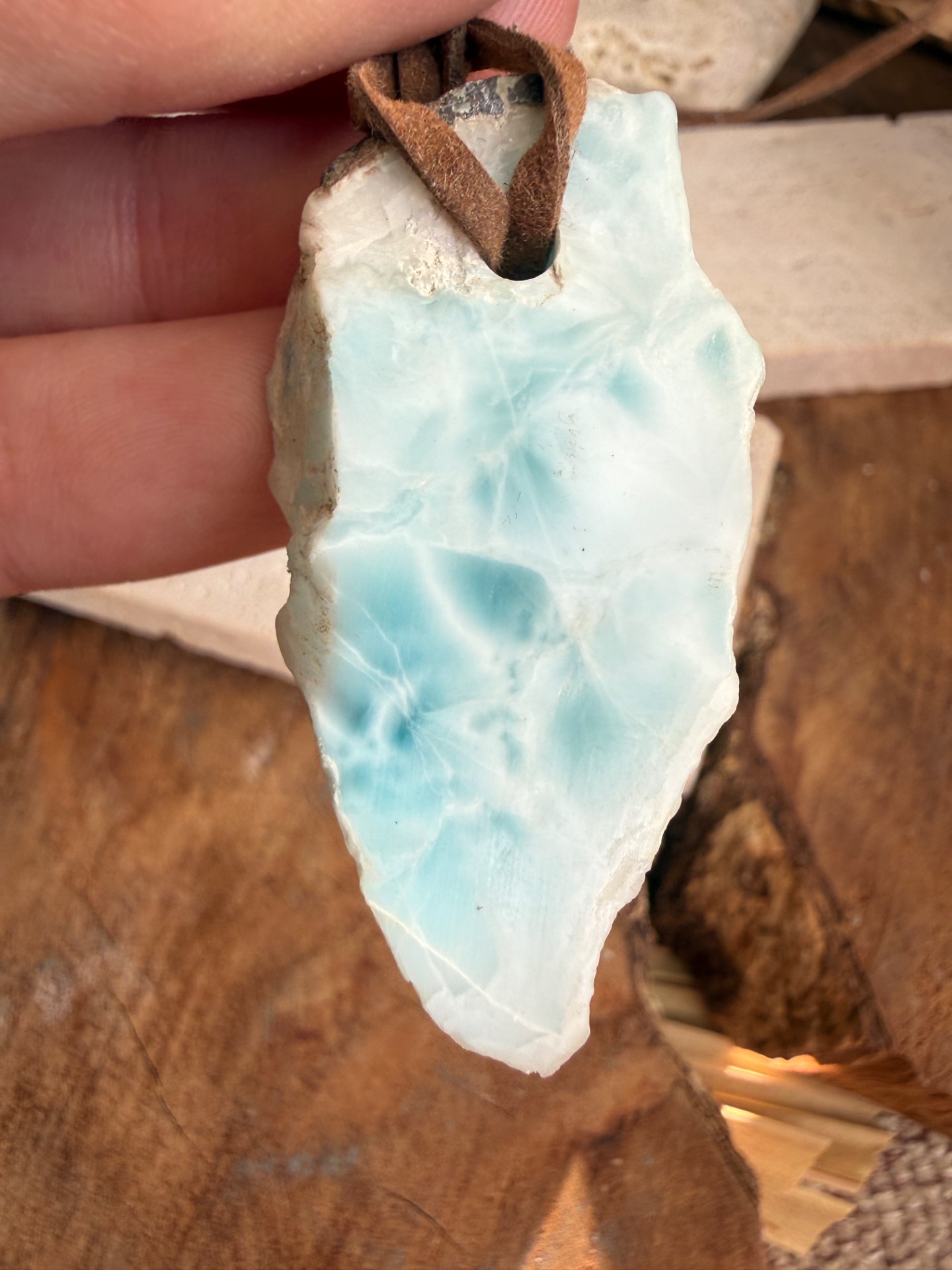 Boky kameňa sú ponechané v prirodzenej, nedobrúsenej forme – autentické, pravdivé a nesúce energiu času. Jemná koženka ho dopĺňa a premieňa na talizman, ktorý spája minulosť, prítomnosť a tvoju vnútornú múdrosť.